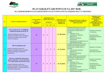 PLAN SZKOLEŃ GRUPOWYCH NA 2017 ROK DLA OSÓB BEZROBOTNYCH ZAREJESTROWANYCH W POWIATOWYM URZĘDZIE PRACY W PRUDNIKU LP. NAZWA I ZAKRES SZKOLEŃ LICZBA MIEJSC DLA UCZESTNIKÓW SZKOLEŃ PRZEWIDYWANY TERMIN REALIZACJI KWARTAŁ I II III ORIENTACYJNY CZAS TRWANIA SZKOLEŃ W GODZINACH IV Prawo jazdy kat. D + kwalifikacja wstępna przyspieszona do kat. D 1. szkolenie obejmuje teoretyczne i praktyczne przygotowanie uczestników szkolenia do wykonywania zawodu kierowca autobusu; 10 X ok. 200 godzin X ABC Przedsiębiorczości 2. szkolenie obejmuje teoretyczne i praktyczne przygotowanie uczestników szkolenia do podjęcia działalności gospodarczej 20 X X X ok. 25 godzin Kierowca samochodu ciężarowego (prawo jazdy kat. C, prawo jazdy kat. C+E, uprawnienia na przewóz rzeczy) 3. szkolenie obejmuje teoretyczne i praktyczne przygotowanie uczestników szkolenia do pracy w zawodzie kierowca samochodu ciężarowego 15 X X X CHARAKTERYSTYKA OSÓB, DLA KTÓRYCH SZKOLENIE JEST PRZEZNACZONE X ok. 25 godzin Szkolenie skierowane jest do osób bezrobotnych zarejestrowanych w Powiatowym Urzędzie Pracy w Prudniku ukończone 21 lat; wykształcenie minimum podstawowe; brak przeciwwskazań zdrowotnych; predyspozycje psychofizyczne do wykonywania zawodu; Szkolenie skierowane jest do osób bezrobotnych zarejestrowanych w Powiatowym Urzędzie Pracy w Prudniku wykształcenie minimum podstawowe; brak przeciwwskazań zdrowotnych; Szkolenie skierowane jest do osób bezrobotnych zarejestrowanych w Powiatowym Urzędzie Pracy w Prudniku ukończone 21 lat; wykształcenie minimum podstawowe; brak przeciwwskazań zdrowotnych; predyspozycje psychofizyczne do wykonywania zawodu; INFORMACJA O EGZAMINIE ZEWNETRZNYM/ RODZAJ ZAŚWIADCZENIA POTWIERDZAJĄCEGO UKOŃCZENIE SZKOLENIA Egzamin wewnetrzny i zewnętrzny. Zaświadczenie o ukończeniu szkolenia, świadectwo kwalifikacji. Egzamin wewnetrzny. Zaświadczenie o ukończeniu szkolenia. Egzamin wewnetrzny i zewnętrzny. Zaświadczenie o ukończeniu szkolenia, świadectwo kwalifikacji. “Kucharz” 4. szkolenie obejmuje teoretyczne i praktyczne przygotowanie uczestników do wykonywania pracy w zawodzie pomoc kuchenna; - przygotowanie potraw, napojów, przetworów; - planowanie jadłospisów; - przepisy bhp, p. poż. i zasady higieny; - prawidłowa eksploatacja i konserwacja sprzętu; - rozliczanie produkcji, kalkulowanie cen i wyrobów; - catering w gastronomii; 10 X X ok. 200 godzin X W zależności od kierunku szkolenia “Szkolenia indywidualne” 5. – jeżeli bezrobotny uprawdopodobni, że szkolenie to zapewni uzyskanie odpowiedniej pracy lub podjęcie działalności gospodarczej. wg potrzeby ok. 40 osób X X X Szkolenie skierowane jest do osób bezrobotnych zarejestrowanych w Powiatowym Urzędzie Pracy w Prudniku ukończone 18 lat; wykształcenie minimum podstawowe; brak przeciwwskazań zdrowotnych do pracy w zawodzie kucharz; Egzamin wewnętrzny Zaświadczenie o ukończeniu szkolenia. Szkolenie skierowane jest do osób bezrobotnych zarejestrowanych w Powiatowym Urzędzie Pracy w Prudniku. Ze wzglęgu na możliwe zmiany sytuacji finansowej oraz zmieniającą się sytuację na rynku pracy dopuszcza się możliwość zmian terminów realizacji szkoleń lub ustalenia nowych kierunków. Prudnik, dnia 05.01.2017 r.
