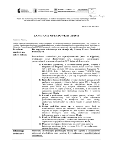 Projekt jest finansowany przez Unię Europejską ze środków Europejskiego Funduszu Rozwoju Regionalnego w ramach Regionalnego Programu Operacyjnego Województwa Kujawsko-Pomorskiego na lata 2007-2013 Szczecin, 08.09.2016 r. ZAPYTANIE OFERTOWE nr 21/2016 Szanowni Państwo, Polska Fundacja Przedsiębiorczości, realizująca projekt SFP Kujawiak Inwestycje- finansowany przez Unię Europejską ze środków Europejskiego Funduszu Rozwoju Regionalnego w ramach Regionalnego Programu Operacyjnego Województwa Kujawsko-Pomorskiego na lata 2007-2013 zwraca się z prośbą o przygotowanie oferty zgodnie z poniższą specyfikacją: Przedmiot zamówienia, zakres zakupu Do zapytanie ofertowego nie stosuje się Ustawy Prawa Zamówień Publicznych. Przedmiotem zamówienia jest zaprojektowanie (wraz ze zdjęciem), wykonanie oraz dostarczenie n/w materiałów informacyjnopromocyjnych promujących projekt SFP Kujawiak-Inwestycje. 1) Kalendarz tygodniowy, z czerwono-czarną gumką, wstążką i miejscem na długopis: oprawa: Tucson, kolor czerwony format: 130 x 210 mm, objętość: 160 stron, kalendarium: 4 języczne PLGB-D-RUS, druk: 1- kolorowy, szary, oprawa TUCSON, kolor gumki: czerwono-czarny, tłoczenie dwustronne: z przodu logo PFP oraz strona www.pfp.com.pl, z tyłu ciąg 3 logotypów i informacja o współfinansowaniu, 50 szt., 2) Kalendarze ścienne trójdzielne: wymiar: standard, główka: projekt graficzny oraz nadruk: 4+0 (pełny kolor), karton 270 g, format ok. 360x240mm. Podkład: format ok. 360x580mm, karton 270 g, nadruk pełen kolor, trzy miejsca reklamowe. Kalendarium: dwukolorowe, w języku polskim, z imieninami, z okienkiem do oznaczania aktualnej daty, Kalendarze muszą być w kopercie kartonowej, 50 szt., 3) Parasol z nadrukiem, model Avignon, gumowy uchwyt, 190T pongee, wiatroszczelny, ilość brytów: 8, pełna automatyka (otwieranie/zamykanie), w komplecie etui, kolor czarny, znakowanie termotransfer na jednym brycie w jednym kolorze, 30 szt., 4) Zestaw podróżny power up, w zestawie power bank ze standardowym kablem do ładowania, ładowarka samochodowa, wtyczka do prądu z adapterem na USB, wymiar: 117x88x40 mm, materiał: tworzywo, kolor biały, znakowanie tampodruk jednostronny na etui w jednym kolorze, 40 szt., 5) Pendrive 8GB (typu twister) ze smyczą, kolor czerwony (aluminium) czarny (plastik), znakowanie dwustronne grawer, zapakowane w pojedyncze kartonowe pudełeczka, 40 szt., 6) Długopis touch pen: z dopasowaną kolorystycznie gumową końcówką, aluminium, kolor czerwony, 0,9x12,5 cm, znakowanie: grawer dwustronny, 150 szt. Informacje dodatkowe Materiały informacyjno-promocyjne muszą być zgodne z załączonymi zdjęciami lub zbliżone oraz powinny być wykonane z wysokiej jakości materiałów. Pola znakowania proponowanych materiałów informacyjnopromocyjnych muszą być wystarczająco duże, aby zmieściło się i było czytelne wymagane zestawienie. W związku z powyższym wymagana jest wizualizacja znakowania materiałów promocyjnych wraz z podaną wielkością znakowania. Województwo Kujawsko-Pomorskie (SFP Kujawiak Inwestycje): - Wytyczne dla beneficjentów z zakresu promocji projektów realizowanych w ramach RPO WK-P w załączeniu - Promocja musi zostać zaprojektowana i przeprowadzona zgodnie z wytycznymi dla beneficjentów z zakresu promocji projektów realizowanych w ramach RPO WK-P z uwzględnieniem wymagań wariantu podstawowego. Wszystkie materiały muszą dodatkowo zawierać logo Polskiej Fundacji Przedsiębiorczości. Wariant podstawowy (emblemat UE wraz z odwołaniem słownym do Unii Europejskiej oraz odwołaniem słownym do Europejskiego Funduszu Rozwoju Regionalnego, umieszczone po prawej stronie zestawienia znaków,, herb województwa kujawsko-pomorskiego wraz z odwołaniem słownym do nazwy województwa umieszczone pomiędzy logo NSS a emblematem UE, informację o współfinansowaniu projektu, hasło Regionalnego Programu Operacyjnego Województwa KujawskoPomorskiego na lata 2007-2013 w brzmieniu „Mój region w Europie”, zamieszczone poniżej powyższym zestawieniem znaków, dodatkowo logo PFP oraz strona www.pfp.com.pl dla: Kalendarzy książkowych, kalendarzy ściennych, parasoli, Wariant minimalny (logo Narodowej Strategii Spójności 2007-2013 w formie znaku programu regionalnego, zamieszczone z lewej strony zestawienia znaków, emblemat UE wraz z odwołaniem słownym do Unii Europejskiej, herb województwa kujawsko-pomorskiego wraz z odwołaniem słownym do nazwy województwa umieszczony pomiędzy logo NSS a emblematem UE, dodatkowo logo PFP) dla: zestawu podróżnego power up, pendrive, długopis touch pen. Dla zestawu power up dodatkowo w znakowaniu należy umieścić stronę www.pfp.com.pl. Projekty muszą zostać każdorazowo zaakceptowane przez Zamawiającego. Projekty oraz znakowanie materiałów informacyjno- promocyjnych w cenie. Koszt dostawy w cenie usługi. Miejsce dostawy: siedziba Zamawiającego Termin dostawy: do 21 dni od daty zaakceptowania projektu. Zamawiający udostępni logo PFP oraz Wytyczne dla beneficjentów z zakresu promocji projektów realizowanych w ramach RPO WK-P. Zamawiający zastrzega sobie prawo do odstąpienia od części zamówienia. Zamawiający zastrzega sobie prawo do wyłączenia części zamówienia. Zamawiający zastrzega sobie prawo do złożenia częściowego zamówienia. Zamawiający zastrzega sobie prawo do unieważnienia postępowania ofertowego. Nie dopuszcza się składania ofert częściowych. Zdjęcia przykładowych materiałów promocyjnych w załączeniu, Do zapytanie ofertowego nie stosuje się Ustawy Prawa Zamówień Publicznych. Forma płatności Termin nadsyłania ofert Oferta Przelew w terminie 14 dni od daty prawidłowo wystawionej faktury VAT przez Sprzedawcę na podstawie protokołu odbioru materiałów reklamowych. Podpisane oferty należy przesyłać do 26 września 2016 roku do godziny 12:00 (decyduje data wpływu) • pocztą elektroniczną na adres [email protected] 