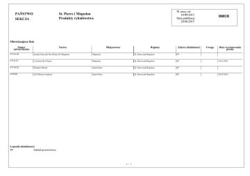 PAŃSTWO SEKCJA W mocy od 10/09/2015 Data publikacji 28/08/2015 St. Pierre i Miquelon Produkty rybołówstwa 00018 Obowiazujaca lista Numer zatwierdzenia Nazwa Miejscowosc Regiony Zakres dzialalnosci 975-01-02 Société Nouvelle Des Pêches De Miquelon Miquelon St. Pierre and Miquelon PP 975 01 03 La Ferme De L'Ouest Miquelon St. Pierre and Miquelon PP 975-02-02 Pêcherie Palurel Saint-Pierre St. Pierre and Miquelon PP 9750208 SAS Maison Audouze Saint-Pierre St. Pierre and Miquelon PP Legenda dzialalnosci: PP Zakład przetwórstwa 1/ 1 Uwaga Data wystosowania prosby 14/11/2011 02/07/2015