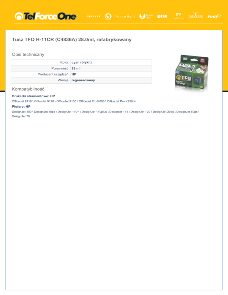 Tusz TFO H-11CR (C4836A) 28.0ml, refabrykowany Opis techniczny Kolor cyan (błękit) Pojemność 28 ml Producent urządzeń HP Wersja regenerowany Kompatybilność Drukarki atramentowe: HP OfficeJet 9110 \ OfficeJet 9120 \ OfficeJet 9130 \ OfficeJet Pro K850 \ OfficeJet Pro K850dn Plotery: HP DesignJet 100 \ DesignJet 10ps \ DesignJet 110+ \ DesignJet 110plus \ Designjet 111 \ DesignJet 120 \ DesignJet 20ps \ DesignJet 50ps \ DesignJet 70
