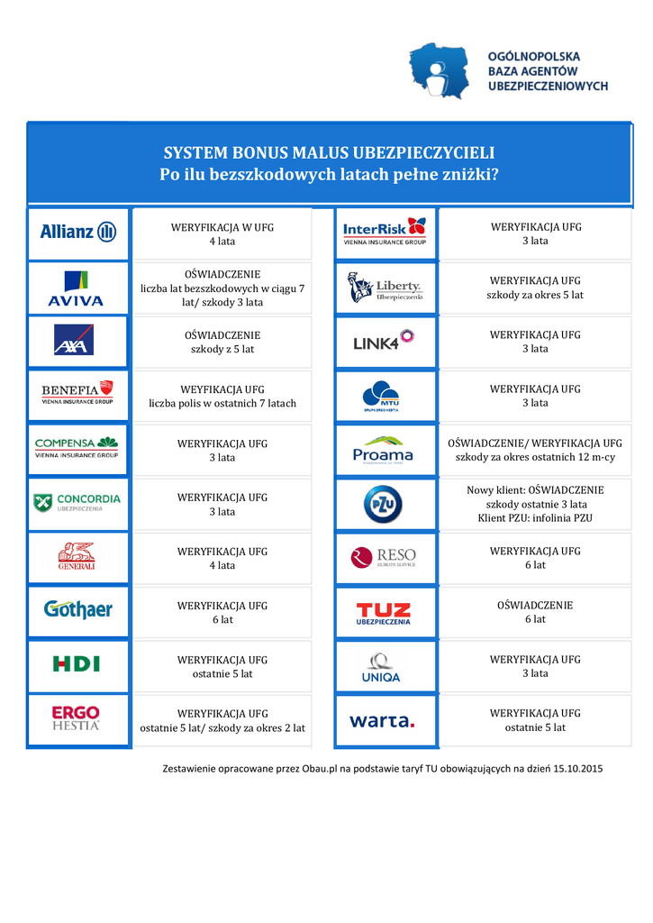SYSTEM BONUS MALUS UBEZPIECZYCIELI Po ilu bezszkodowych latach pełne zniżki? WERYFIKACJA W UFG 4 lata WERYFIKACJA UFG 3 lata OŚWIADCZENIE liczba lat bezszkodowych w ciągu 7 lat/ szkody 3 lata WERYFIKACJA UFG szkody za okres 5 lat OŚWIADCZENIE szkody z 5 lat WERYFIKACJA UFG 3 lata WEYFIKACJA UFG liczba polis w ostatnich 7 latach WERYFIKACJA UFG 3 lata WERYFIKACJA UFG 3 lata OŚWIADCZENIE/ WERYFIKACJA UFG szkody za okres ostatnich 12 m-cy WERYFIKACJA UFG 3 lata Nowy klient: OŚWIADCZENIE szkody ostatnie 3 lata Klient PZU: infolinia PZU WERYFIKACJA UFG 4 lata WERYFIKACJA UFG 6 lat WERYFIKACJA UFG 6 lat OŚWIADCZENIE 6 lat WERYFIKACJA UFG ostatnie 5 lat WERYFIKACJA UFG 3 lata WERYFIKACJA UFG ostatnie 5 lat/ szkody za okres 2 lat WERYFIKACJA UFG ostatnie 5 lat Zestawienie opracowane przez Obau.pl na podstawie taryf TU obowiązujących na dzień 15.10.2015