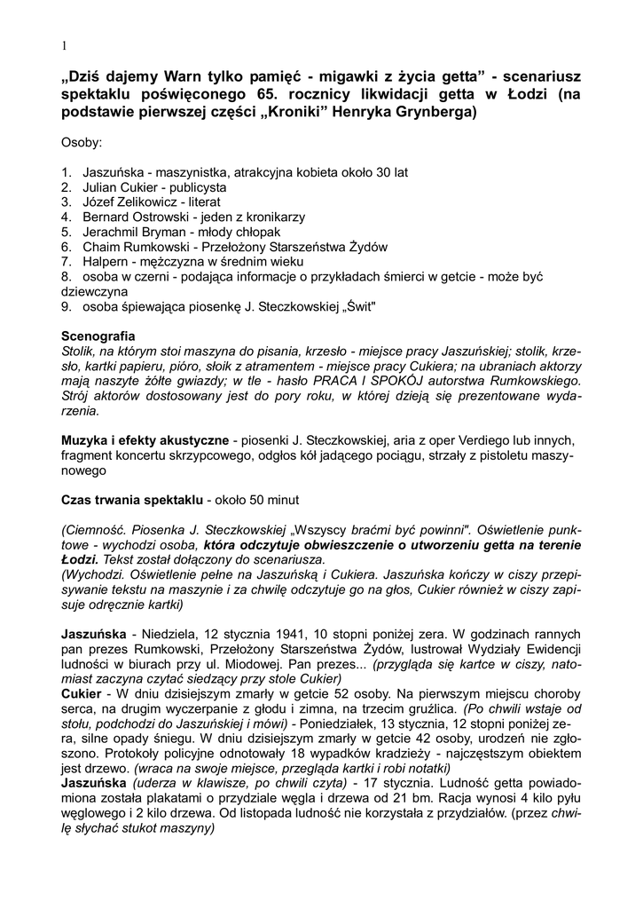 1 „Dziś dajemy Warn tylko pamięć - migawki z życia getta” - scenariusz spektaklu poświęconego 65. rocznicy likwidacji getta w Łodzi (na podstawie pierwszej części „Kroniki” Henryka Grynberga) Osoby: 1. Jaszuńska - maszynistka, atrakcyjna kobieta około 30 lat 2. Julian Cukier - publicysta 3. Józef Zelikowicz - literat 4. Bernard Ostrowski - jeden z kronikarzy 5. Jerachmil Bryman - młody chłopak 6. Chaim Rumkowski - Przełożony Starszeństwa Żydów 7. Halpern - mężczyzna w średnim wieku 8. osoba w czerni - podająca informacje o przykładach śmierci w getcie - może być dziewczyna 9. osoba śpiewająca piosenkę J. Steczkowskiej „Świt" Scenografia Stolik, na którym stoi maszyna do pisania, krzesło - miejsce pracy Jaszuńskiej; stolik, krzesło, kartki papieru, pióro, słoik z atramentem - miejsce pracy Cukiera; na ubraniach aktorzy mają naszyte żółte gwiazdy; w tle - hasło PRACA l SPOKÓJ autorstwa Rumkowskiego. Strój aktorów dostosowany jest do pory roku, w której dzieją się prezentowane wydarzenia. Muzyka i efekty akustyczne - piosenki J. Steczkowskiej, aria z oper Verdiego lub innych, fragment koncertu skrzypcowego, odgłos kół jadącego pociągu, strzały z pistoletu maszynowego Czas trwania spektaklu - około 50 minut (Ciemność. Piosenka J. Steczkowskiej „Wszyscy braćmi być powinni". Oświetlenie punktowe - wychodzi osoba, która odczytuje obwieszczenie o utworzeniu getta na terenie Łodzi. Tekst został dołączony do scenariusza. (Wychodzi. Oświetlenie pełne na Jaszuńską i Cukiera. Jaszuńska kończy w ciszy przepisywanie tekstu na maszynie i za chwilę odczytuje go na głos, Cukier również w ciszy zapisuje odręcznie kartki) Jaszuńska - Niedziela, 12 stycznia 1941, 10 stopni poniżej zera. W godzinach rannych pan prezes Rumkowski, Przełożony Starszeństwa Żydów, lustrował Wydziały Ewidencji ludności w biurach przy ul. Miodowej. Pan prezes... (przygląda się kartce w ciszy, natomiast zaczyna czytać siedzący przy stole Cukier) Cukier - W dniu dzisiejszym zmarły w getcie 52 osoby. Na pierwszym miejscu choroby serca, na drugim wyczerpanie z głodu i zimna, na trzecim gruźlica. (Po chwili wstaje od stołu, podchodzi do Jaszuńskiej i mówi) - Poniedziałek, 13 stycznia, 12 stopni poniżej zera, silne opady śniegu. W dniu dzisiejszym zmarły w getcie 42 osoby, urodzeń nie zgłoszono. Protokoły policyjne odnotowały 18 wypadków kradzieży - najczęstszym obiektem jest drzewo. (wraca na swoje miejsce, przegląda kartki i robi notatki) Jaszuńska (uderza w klawisze, po chwili czyta) - 17 stycznia. Ludność getta powiadomiona została plakatami o przydziale węgla i drzewa od 21 bm. Racja wynosi 4 kilo pyłu węglowego i 2 kilo drzewa. Od listopada ludność nie korzystała z przydziałów. (przez chwilę słychać stukot maszyny) 2 Osoba w czerni (oświetlona punktowo, pozostali w ciemności, nie poruszają się - zasada stop klatki) - W nocy z 16 na 17 stycznia zmarł 36 letni Abram Baumarc. Lekarz pogotowia ustalił kompletne wyczerpanie wskutek głodu. W mieszkaniu swoim powiesiła się 27 letnia Frajda Ejber. (wychodzi, oświetlenie pełne) Jaszuńska - Poniedziałek, 20 stycznia. W dniu dzisiejszym nastąpiło z upragnieniem oczekiwane ocieplenie do 4 stopni powyżej zera. Rozplakatowane zostało Obwieszczenie nr 200 Przełożonego Starszeństwa Żydów, iż każdy otrzyma 40 deka chleba. Podniesienie racji spowodowało powszechne zadowolenie... Cukier (kończy) - wśród wygłodniałych mas. (Przez chwilę słychać arię męską z oper Verdiego lub Czajkowskiego lub Pucciniego, obydwoje zasłuchani) Jaszuńska na tle ściszanej muzyki — 25 stycznia w lokalu Kuchni nr 2 odbył się recital uzdolnionego tenora Nikodema Sztajmana. (ponownie brzmi ta sama aria, która za chwilę cichnie zupełnie) Cukier - temperatura spadła do 15 stopni poniżej zera. W ciągu dnia wczorajszego i dzisiejszego zmarły 73 osoby, urodzeń nie zarejestrowano. W nocy z magazynu rozdzielczego przy ulicy Jakuba skradziono 91 bochenków chleba. Jaszuńska (przez chwilę uderza w klawisze, zapisując relację Cukiera, później mówi) Urząd Śledczy wszczął energiczne dochodzenie. Aresztowano kilku podejrzanych (ponownie kilka razy uderza w klawisze maszyny) Osoba w czerni (oświetlenie punktowe, pozostali zasada stop klatki) - W celu samobójczym wyskoczyła z 3 piętra 21 letnia Bluma Lichtensztajn, a w suterenie przy ulicy Zawiszy znaleziono 15 letniego Hersza Kleczewskiego w stanie zupełnego wyczerpania z zimna i głodu. (wychodzi. Z drugiej strony pojawia się Zelikowicz, oświetlony, mówi do widowni, Jaszuńska i Cukier wychodzą) Zelikowicz - Dziś mija rok jak podpisane zostało rozporządzenie o utworzeniu i odrutowaniu getta. Nikomu się wówczas nie śniło, że w ciągu roku wyrośnie tutaj ośrodek przemysłowy o uniwersalnym zasięgu... Nic nie było w tych miejscach, gdzie dziś pracuje 6tysięczna armia krawców, rzesze fachowców ze wszystkich dziedzin, tkaczy, przędzalników, dziewiarzy, szewców, kapeluszników, tapicerów, elektrotechników, garbarzy. Jeśli wziąć pod uwagę warunki, w jakich wytwórnie powstały i pracują - ich osiągnięcia należy zakwalifikować do rekordów (ostanie słowa wypowiada z dumą). (oświetlenie pełne, Zelikowicz przechodzi do stołu i siada na krześle, pojawia się Bryman, machając nerwowo kartkami, może nieść ze sobą niemiecką gazetę, jest oburzony przyniesionymi informacjami) Bryman - „Litzmannstadt w przyszłości" - pod takim tytułem ukazał się artykuł w „Litzmannstadter Zeitung". Artykuł zapowiada, iż dzielnica, w której znajduje się getto, będzie zamieniona na parki i ogrody. Po zniwelowaniu terenu wybudowane zostaną piękne gmachy. W odniesieniu do Żydów artykuł oznacza, iż „znikną z Litzmannstadt prędzej aniżeli się spodziewają"- (siada obok Zelikowicza, który czyta głośno informacje z otrzymanej kartki) Zelikowicz - Liczba lud