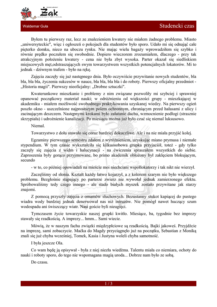 Studencki czas Waldemar Guła Byłem tu pierwszy raz, lecz ze znalezieniem kwatery nie miałem żadnego problemu. Miasto „uniwersyteckie", więc i ogłoszeń o pokojach dla studentów było sporo. Udało mi się odnająć całe pięterko domku, nieco na uboczu rynku. Nie mając wielu bagaży wprowadziłem się szybko i równie prędko poczułem się swobodnie. Dopiero wieczorem zrozumiałem, dlaczego - przy tak atrakcyjnym położeniu kwatery - cena nie była zbyt wysoka. Parter okazał się siedliskiem miejscowych męt,odstraszających swym towarzystwem wszystkich potencjalnych lokatorów. Mi to jednak - dziwnym trafem - było na rękę. Zajęcia zaczęły się już następnego dnia. Było oczywiście przywitanie nowych studentów, bla bla, bla bla, życzenia sukcesów w nauce, bla bla, bla bla i do roboty. Pierwszy oficjalny przedmiot „Historia magii". Pierwszy nieoficjalny: „Drobne sztuczki". Kwaterunkowe mieszkanie i problemy z nim związane pozwoliły mi szybciej i sprawniej opanować początkowy materiał nauki; w odróżnieniu od większości grupy - mieszkającej w akademiku - miałem możliwość swobodnego praktykowania uzyskanej wiedzy. Na pierwszy ogień poszło okno - uszczelnione najprostszym polem ochronnym, chroniącym przed hałasami z ulicy i zacinającym deszczem. Następnymi krokami było załatanie dachu, wzmocnienie podłogi (strasznie skrzypiała) i udrożnienie kanalizacji. Po miesiącu można już było czuć się niemal luksusowo. Niemal. Towarzystwo z dołu stawało się coraz bardziej dokuczliwe. Ale i na nie miała przyjść kolej. Egzaminy pierwszego semestru zdałem z wyróżnieniem, uzyskując miano prymusa i niemałe stypendium. W tym czasie wykształciła się kilkuosobowa grupka przyjaciół, toteż - gdy tylko zaczęły się zajęcia z widm i halucynacji - na ćwiczenia spraszałem wszystkich do siebie. Zaproszenia były gorąco przyjmowane, bo primo akademik obłożony był zaklęciem blokującym, secundo - w to, co później opowiadali na mieście moi niechciani współlokatorzy i tak nikt nie wierzył. Zaczęliśmy od słonia. Kształt każdy łatwo kojarzył, a z kolorem szarym nie było większego problemu. Bezgłośnie stąpający po parterze zwierz nie wywołał jednak zamierzonego efektu. Spróbowaliśmy tedy czego innego - ale stado białych myszek zostało przywitane jak starzy znajomi. Z pomocą przyszły zajęcia z omamów słuchowych. Bezustanny stukot kapiącej do pustego wiadra wody bardziej jednak denerwował nas niż intruzów. Nie pomógł nawet huczący szum wodospadu ani świszczący wiatr. Nasi goście byli nieugięci. Tymczasem życie towarzyskie naszej grupki kwitło. Miesiące, ba, tygodnie bez imprezy stawały się rzadkością. A imprezy... hmm... Sami wiecie. Mówią, że w naszym fachu związki międzypłciowe są rzadkością. Bajki jakoweś. Przyjdźcie na imprezę, sami zobaczycie. Maćka do Magdy przyciągnęło już na początku, Sebastian z Moniką znali się już chyba wcześniej, Tomek, Kasia i Justyna woleli chyba samotność. I była jeszcze Ola. Co wam będę ją opisywał - była z niej niezła wiedźma. Talentu miała co niemiara, ochoty do nauki i roboty sporo, do tego nie wspomagana magią uroda... Dobrze nam było ze sobą. Do czasu. 1/3 Studencki czas Waldemar Guła A ściślej, do tygodnia, który zaczął się jedną z lepszych imprez - oczywiście w mojej kwaterze. Było to po zdanym egzaminie, wszyscy mieli niezłe humory. No - prawie wszyscy; nasi sąsiedzi z dołu chyba byli już nieco zmęczeni ciągłymi atakami istot nie z tej ziemi. Przystąpiliśmy do konfrontacji. Najpierw przez sufit zjechało na skrzypiących lianach kilka świecących oczami orangutanów. Dołączyło do nich stadko zebr, trochę podkolorowanych - na czerwono i niebiesko. Kiedy opadły z nich skóry a kości rozsypały się w proch, zza ściany wyszła czarna procesja. Czaszki użyte jako kadzielnice nuciły żałobne pieśni. Kroplą, która wreszcie przepełniła czarę był szturm armii szczurów ucharakteryzowanych na piratów. Przy dźwiękach werbli i opętańczych wyciu reszta meliniarzy uciekła z budynku. Dom był nasz. Kilka dni później zjawiła się właścicielka kamienicy wraz z kilkoma ochroniarzami - ani chybi coś musiało dojść jej uszu. Gdy ujrzała odnowiony naprędce parter i cudownie wyremontowane pięterko, zachwytom nie było końca. I natychmiast podniosła czynsz. Trochę się tym zdenerwowałem, co zaowocowało pojawieniem się olbrzymiego włochatego pająka tuż nad jej głową. Skąd miałem wiedzieć, że babsko chorowało na serce? Ola powiedziała mi kilka słów, ja nie pozostałem jej dłużny. Całe szczęście, że przyjaciele powstrzymali nas od użycia przeciw sobie nabytej wiedzy. Następnego dnia nie zjawiła się na zajęciach. Ani dzień później. Nikt nie wiedział, co się z nią działo. Wybrałem się do akademika, ale jej pokój był zamknięty. Jako, że pozycja prymusa dawała pewne przywileje - takie, jak immunitet od blokady domu studenckiego - mogłem się upewnić co do pustości pomieszczenia. Zniknęły wszystkie rzeczy Oli. Przeszedłem niemal cały akademik na wylot, ale ani Tomek w swym wiecznie zagraconym pokoiku, ani Maciek z Magdą na herbacie, ani Sebastian u Moniki w łóżku nic nie wiedzieli. Korzystając z okazji, Kasia z Justyną poprosiły o wyproszenie z ich kwatery kilku myszy piszczących w kącie. I to one bąknęły coś o Oli wyjeżdżającej do ciotki na prywatną naukę zawodu. Ale przecież wiedziałem, jakie z nich plotkarki... Myszy na widok kilku wygłodniałych kocurów rzuciły się do ucieczki. Wpierw pod łóżko. Potem pod szafę. I do norki. Kiedy jednak z ich własnej posiadłości dobiegł odgłos głodnego miauknięcia, wybiegły na korytarz. Większość drzwi była otwarta, studenci wyszli obejrzeć to widowisko. Myszy nie zdecydowały się jednak na ucieczkę w tę stronę - pomiędzy ludzkimi nogami pojawiały się coraz to 