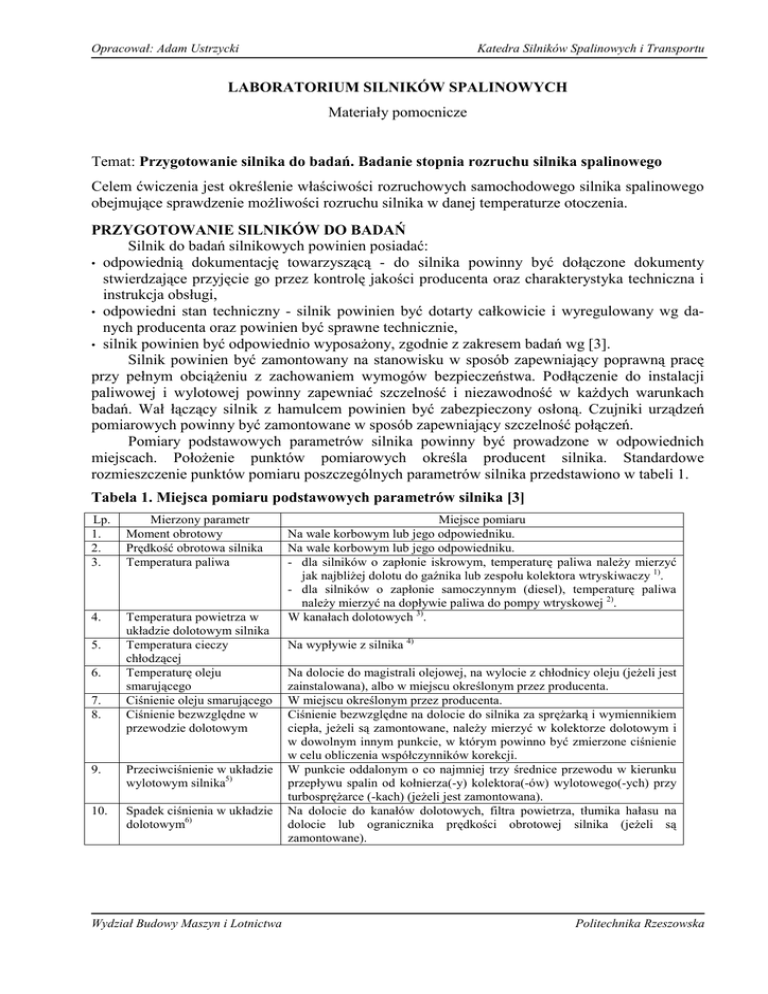 Opracował: Adam Ustrzycki Katedra Silników Spalinowych i Transportu LABORATORIUM SILNIKÓW SPALINOWYCH Materiały pomocnicze Temat: Przygotowanie silnika do badań. Badanie stopnia rozruchu silnika spalinowego Celem ćwiczenia jest określenie właściwości rozruchowych samochodowego silnika spalinowego obejmujące sprawdzenie moŜliwości rozruchu silnika w danej temperaturze otoczenia. PRZYGOTOWANIE SILNIKÓW DO BADAŃ Silnik do badań silnikowych powinien posiadać: • odpowiednią dokumentację towarzyszącą - do silnika powinny być dołączone dokumenty stwierdzające przyjęcie go przez kontrolę jakości producenta oraz charakterystyka techniczna i instrukcja obsługi, • odpowiedni stan techniczny - silnik powinien być dotarty całkowicie i wyregulowany wg danych producenta oraz powinien być sprawne technicznie, • silnik powinien być odpowiednio wyposaŜony, zgodnie z zakresem badań wg [3]. Silnik powinien być zamontowany na stanowisku w sposób zapewniający poprawną pracę przy pełnym obciąŜeniu z zachowaniem wymogów bezpieczeństwa. Podłączenie do instalacji paliwowej i wylotowej powinny zapewniać szczelność i niezawodność w kaŜdych warunkach badań. Wał łączący silnik z hamulcem powinien być zabezpieczony osłoną. Czujniki urządzeń pomiarowych powinny być zamontowane w sposób zapewniający szczelność połączeń. Pomiary podstawowych parametrów silnika powinny być prowadzone w odpowiednich miejscach. PołoŜenie punktów pomiarowych określa producent silnika. Standardowe rozmieszczenie punktów pomiaru poszczególnych parametrów silnika przedstawiono w tabeli 1. Tabela 1. Miejsca pomiaru podstawowych parametrów silnika [3] Lp. 1. 2. 3. Mierzony parametr Moment obrotowy Prędkość obrotowa silnika Temperatura paliwa 4. Temperatura powietrza w układzie dolotowym silnika Temperatura cieczy chłodzącej Temperaturę oleju smarującego Ciśnienie oleju smarującego Ciśnienie bezwzględne w przewodzie dolotowym 5. 6. 7. 8. 9. Przeciwciśnienie w układzie wylotowym silnika5) 10. Spadek ciśnienia w układzie dolotowym6) Wydział Budowy Maszyn i Lotnictwa Miejsce pomiaru Na wale korbowym lub jego odpowiedniku. Na wale korbowym lub jego odpowiedniku. - dla silników o zapłonie iskrowym, temperaturę paliwa naleŜy mierzyć jak najbliŜej dolotu do gaźnika lub zespołu kolektora wtryskiwaczy 1). - dla silników o zapłonie samoczynnym (diesel), temperaturę paliwa naleŜy mierzyć na dopływie paliwa do pompy wtryskowej 2). W kanałach dolotowych 3). Na wypływie z silnika 4) Na dolocie do magistrali olejowej, na wylocie z chłodnicy oleju (jeŜeli jest zainstalowana), albo w miejscu określonym przez producenta. W miejscu określonym przez producenta. Ciśnienie bezwzględne na dolocie do silnika za spręŜarką i wymiennikiem ciepła, jeŜeli są zamontowane, naleŜy mierzyć w kolektorze dolotowym i w dowolnym innym punkcie, w którym powinno być zmierzone ciśnienie w celu obliczenia współczynników korekcji. W punkcie oddalonym o co najmniej trzy średnice przewodu w kierunku przepływu spalin od kołnierza(-y) kolektora(-ów) wylotowego(-ych) przy turbospręŜarce (-kach) (jeŜeli jest zamontowana). Na dolocie do kanałów dolotowych, filtra powietrza, tłumika hałasu na dolocie lub ogranicznika prędkości obrotowej silnika (jeŜeli są zamontowane). Politechnika Rzeszowska Opracował: Adam Ustrzycki Katedra Silników Spalinowych i Transportu cd. tabeli 3.1 1) Temperaturę paliwa naleŜy utrzymywać na poziomie określonym przez producenta z dokładnością ± 5 K. JednakŜe dopuszczalna podczas pomiaru minimalna temperatura paliwa powinna być temperaturą otaczającego powietrza. JeŜeli producent nie określił wartości temperatury paliwa dla badania, powinna ona wynosić 298 K ± 5 K. 2) Na Ŝądanie producenta, pomiar temperatury paliwa moŜna zrealizować w innym punkcie pompy wtryskowej, reprezentatywnym dla warunku pracy silnika lub w przewodzie doprowadzającym paliwo między filtrem paliwa a pompą wtryskową, powyŜej punktu wypływu paliwa powrotnego. 3) W tym samym punkcie naleŜy wykonać pomiar spadku ciśnienia w układzie dolotowym. Termometr lub termoparę naleŜy osłonić od przepływu powrotnego paliwa oraz ciepła promieniowania i umieścić bezpośrednio w strumieniu powietrza. 4) Temperaturę cieczy chłodzącej naleŜy utrzymywać na poziomie określonej przez producenta górnej wartości temperatury regulowanej termostatycznie z dokładnością ± 5 K. JeŜeli producent nie określi powyŜszej temperatury, naleŜy utrzymywać temperaturę równą 353 K ± 5 K (80 ±5°C). W przypadku silników chłodzonych powietrzem, temperatura w 0 punkcie wskazanym przez producenta powinna być utrzymywana w zakresie -20 K od maksymalnej wartości określonej przez producenta dla warunków odniesienia. 5) W przypadku zastosowania równowaŜnego układu dolotowego zamiast układu seryjnego naleŜy dokonać kontroli, aby upewnić się, iŜ wartość spadku ciśnienia nie róŜni się o więcej niŜ 100 Pa od wartości granicznej określonej przez producenta dla czystego filtra powietrza. 6) W przypadku zastosowania równowaŜnego układu wylotowego zamiast układu seryjnego naleŜy dokonać kontroli celem upewnienia się, Ŝe przeciwciśnienie w układzie wylotowym silnika nie róŜni się o więcej niŜ 1000 Pa od ciśnienia określonego przez producenta. JednakŜe moŜna zastosować system zapewniający minimalną wartość strat ciśnienia. STANOWISKO BADAWCZE DO BADANIA WŁASNOŚCI ROZRUCHOWYCH W skład stanowiska do badania własności rozruchowych poza standardowymi urządzeniami i przyrządami pomiarowymi powinny wchodzić, co najmniej: • termometry o dokładności wskazań ±1 °C do pomiaru temperatury elektrolitu w środkowym ogniwie akumulatorów, • woltomierz klasy dokładności 1,5 do pomiaru napięcia na zaciskach rozrusznika, • amperomierz klasy dokładności 1,5 do pomiaru natęŜenia prądu p