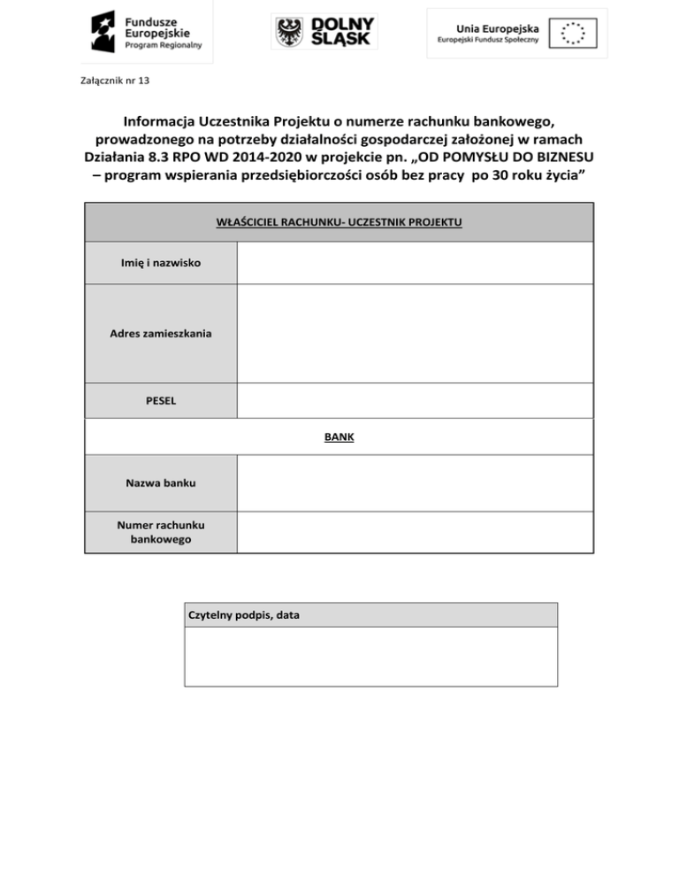 Załącznik nr 13 Informacja Uczestnika Projektu o numerze rachunku bankowego, prowadzonego na potrzeby działalności gospodarczej założonej w ramach Działania 8.3 RPO WD 2014-2020 w projekcie pn. „OD POMYSŁU DO BIZNESU – program wspierania przedsiębiorczości osób bez pracy po 30 roku życia” WŁAŚCICIEL RACHUNKU- UCZESTNIK PROJEKTU Imię i nazwisko Adres zamieszkania PESEL BANK Nazwa banku Numer rachunku bankowego Czytelny podpis, data