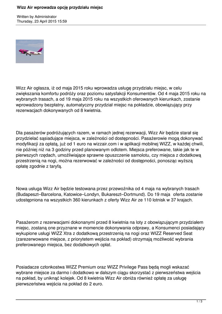 Wizz Air wprowadza opcję przydziału miejsc Written by Administrator Thursday, 23 April 2015 15:59 Wizz Air ogłasza, iż od maja 2015 roku wprowadza usługę przydziału miejsc, w celu zwiększania komfortu podróży oraz poziomu satysfakcji Konsumentów. Od 4 maja 2015 roku na wybranych trasach, a od 19 maja 2015 roku na wszystkich oferowanych kierunkach, zostanie wprowadzony bezpłatny, automatyczny przydział miejsc na pokładzie, obowiązujący przy rezerwacjach dokonywanych od 8 kwietnia. Dla pasażerów podróżujących razem, w ramach jednej rezerwacji, Wizz Air będzie starał się przydzielać sąsiadujące miejsca, w zależności od dostępności. Pasażerowie mogą dokonywać modyfikacji za opłatą, już od 1 euro na wizzair.com i w aplikacji mobilnej WIZZ, w każdej chwili, nie później niż na 3 godziny przed planowanym odlotem. Miejsca preferowane, takie jak te w pierwszych rzędach, umożliwiające sprawne opuszczenie samolotu, czy miejsca z dodatkową przestrzenią na nogi, można rezerwować w zależności od dostępności, ponosząc wyższą opłatę zgodnie z taryfą. Nowa usługa Wizz Air będzie testowana przez przewoźnika od 4 maja na wybranych trasach (Budapeszt–Barcelona, Katowice–Londyn, Bukareszt–Dortmund). Do 19 maja oferta zostanie udostępniona na wszystkich 360 kierunkach z oferty Wizz Air ze 110 lotnisk w 37 krajach. Pasażerom z rezerwacjami dokonanymi przed 8 kwietnia na loty z obowiązującym przydziałem miejsc, zostaną one przyznane w momencie dokonywania odprawy, a Konsumenci posiadający wykupione usługi WIZZ Xtra z dodatkową przestrzenią na nogi oraz WIZZ Reserved Seat (zarezerwowane miejsce, z priorytetem wejścia na pokład) otrzymają możliwość wybrania preferowanego miejsca, bez dodatkowych opłat. Posiadacze członkostwa WIZZ Premium oraz WIZZ Privilege Pass będą mogli wskazać wybrane miejsce za darmo i dodatkowo w dalszym ciągu skorzystać z pierwszeństwa wejścia na pokład, by uniknąć kolejek. Od 8 kwietnia Wizz Air obniża również opłatę za usługę pierwszeństwa wejścia na pokład do 2 euro. 1/3 Wizz Air wprowadza opcję przydziału miejsc Written by Administrator Thursday, 23 April 2015 15:59 OPŁATA* ONLINE DLA PASAŻEROW ZMIENIAJĄCYCH WYBÓR AUTOMATYCZNIE PRZYDZIELONEGO MIEJSCA · przedni rząd - €5 - €23 · miejsca za pierwszym rzędem - €3 - €17 · miejsca z przodu samolotu - €2 - €5 · miejsca z dodatkową przestrzenią na nogi - €5 - €23 · miejsca w tylnej części samolotu €1 - €2.50 *opłaty różnią się w zależności od popytu György Abrán, Dyrektor Handlowy Wizz Air, powiedział: „Cieszymy się z możliwości wprowadzenia znaczącego udogodnienia dla Klientów, które stanowi kolejny element rozbudowywania i ulepszania usług WIZZ. Satysfakcja pasażerów od zawsze stanowiła dla nas priorytet. Od momentu zainaugurowania działalności linii lotniczych ponad 10 lat temu, to czynnik, który napędza i motywuje działalność operacyjną WIZZ każdego dnia. Jestem przekonany, iż trend przywracania opcji przydzielenia miejsc, wiernie odzwierciedla potrzeby Konsumentów, którzy cenią sobie przede wszystkim oferty w atrakcyjnych cenach oraz wygodne i nieuciążliwe korzystanie z usług. W każdym z naszych 55 samolotów Airbus A320 dysponujemy 180 miejscami, a od listopada dzięki nowym Airbusom A321 będzie ich aż 230. Usługa przydzielania miejsc to jeden z elementów strategii udoskonalania doświadczeń konsumentów WIZZ w 2015 roku, której kolejne etapy przedstawimy już wkrótce”. materiał prasowy 2/3 Wizz Air wprowadza opcję przydziału miejsc Written by Administrator Thursday, 23 April 2015 15:59 3/3