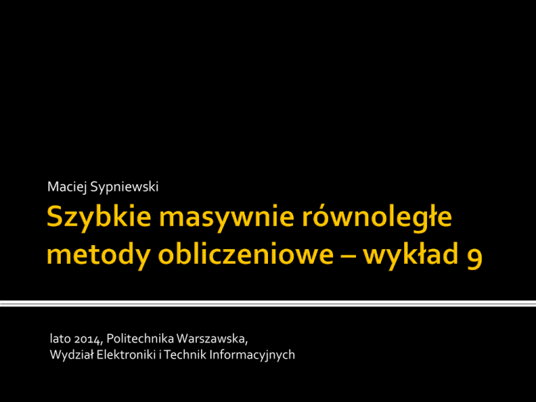 Maciej Sypniewski lato 2014, Politechnika Warszawska, Wydział Elektroniki i Technik Informacyjnych Maciej Sypniewski Politechnika Warszawska [email protected] OpenCL, C++ AMP Wybrane algorytmy obliczeniowe 2D Transpozycja macierzy Iloczyn macierzy Optymalizacja obliczeń GPU Elementy architektury Narzędzia optymalizacji lato 2014 SMOR 2 Maciej Sypniewski Politechnika Warszawska [email protected] OpenCL źródło – Kronos OpenCL specification lato 2014 SMOR 3 Maciej Sypniewski Politechnika Warszawska [email protected] OpenCL – architektura Model platformy Model pamięci Model wykonania Model programowy źródło – Kronos OpenCL specification lato 2014 SMOR 4 Maciej Sypniewski Politechnika Warszawska [email protected] OpenCL – model platformy źródło – Kronos OpenCL specification lato 2014 SMOR 5 Maciej Sypniewski Politechnika Warszawska [email protected] OpenCL – model platformy – przykład ICD – installable client driver Dwie platformy lato 2014 SMOR 6 Maciej Sypniewski Politechnika Warszawska [email protected] OpenCL – model platformy – przykład cd. Jedno urządzenie dla każdej platformy lato 2014 SMOR 7 Maciej Sypniewski Politechnika Warszawska [email protected] OpenCL – model pamięci Globalna Stała Lokalna Prywatna źródło – Kronos OpenCL specification lato 2014 SMOR 8 Maciej Sypniewski Politechnika Warszawska [email protected] OpenCL – model wykonania Kontekst – kontener urządzeń, obiektów pamięci i kolejek komend – ma szczególne znaczenie dla skomplikowanych scenariuszy zarządzania zasobami (wiele wielordzeniowych CPU, GPU itd. ) Kolejka komend – dla kolejki wykonujemy program „kernel” na urządzeniu ▪ Komendy kernela ▪ Komendy zarządzania pamięcią ▪ Komendy synchronizacji lato 2014 SMOR 9 Maciej Sypniewski Politechnika Warszawska [email protected] OpenCL – model wykonania Kontekst + kolejki kontekst dev1 dev2 q1 q2 ………. devn qn Komunikacja w ramach kontekstu odbywa się poprzez współdzielone bufory, komunikacja międzykontekstowa nie jest wspierana lato 2014 SMOR 10 Maciej Sypniewski Politechnika Warszawska [email protected] OpenCL – model wykonania GPU’s CPU’s kontekst Programy kompilacja lato 2014 Kernele Obiekty pamięci Ustawianie danych i argumentów SMOR Kolejki wykonanie 11 Maciej Sypniewski Politechnika Warszawska [email protected] OpenCL – model wykonania - przykład cl.hpp – opakowanie C++ dla cl.h lato 2014 SMOR 12 Maciej Sypniewski Politechnika Warszawska [email protected] OpenCL – cl.hpp – podstawowe struktury cl::Platform cl::Device cl::Context cl::Program cl::Program::Sources cl::Kernel cl::CommandQueue cl::Buffer cl::NDRange lato 2014 SMOR cl::Event cl::Error 13 Maciej Sypniewski Politechnika Warszawska [email protected] OpenCL – cl.hpp – podstawowe metody Konstruktory struktur get, get”WHAT”, getInfo<„WHAT”>() program.build({ dev }); queue.enqueue{Read,Write}Buffer kernel.setArg (nrArg,Arg) queue.enqueueNDRangeKernel lato 2014 SMOR 14 Maciej Sypniewski Politechnika Warszawska [email protected] OpenCL – cl.hpp – obsługa błędów catch ( cl::Error &err ) { std::cerr << „CL ERROR: " << err.what() << "(" << err.err() << ")" << std::endl; } lato 2014 SMOR 15 Maciej Sypniewski Politechnika Warszawska [email protected] OpenCL – kernel CUDA saxpy __global__ void saxpy (const int n, const float *const xt, const float a, float *const yt) { for (int i = blockIdx.x * blockDim.x + threadIdx.x; i < n; i += blockDim.x * gridDim.x) yt[i] += a*xt[i]; } OpenCL saxpy __kernel void saxpy(const int n,__global const float *const xt, const float a,__global float *const yt { const int gid=get_global_id(0); const int gis=get_global_size(0); for (int i = gid; i < n; i += gis) yt[i] += a*xt[i]; } C++AMP saxpy concurrency::parallel_for_each( concurrency::extent<1>(N), [&d_vx, &d_vy, a] (concurrency::index<1> idx) restrict(amp) { d_vy[idx] += a*d_vx[idx];} lato 2014 SMOR 16 Maciej Sypniewski Politechnika Warszawska [email protected] OpenCL – CUDA kernel indeksowanie CUDA OPENCL blockIdx.x blockDim.x threadIdx.x blockIdx.x * blockDim.x + threadIdx.x gridDim.x gridDim.x * blockDim.x get_group_id(0) get_local_size(0) get_local_id(0) get_global_id(0) get_num_groups(0) get_global_size(0) lato 2014 SMOR 17 Maciej Sypniewski Politechnika Warszawska [email protected] OpenCL – transpozycja macierzy macierze MxN umieszczone liniowo w std::vector Kernel 2D Rozwiązanie 1 – pamięć globalna Rozwiązanie 2 – pamięć dzielona Rozwiązanie 3 – pamięć dzielona z eliminacja konfliktów pamięci dzielonej lato 2014 SMOR 18 Maciej Sypniewski Politechnika Warszawska [email protected] OpenCL – transpozycja macierzy macierze MxN umieszczone liniowo w std::vector Kernel 2D Rozwiązanie 1 – pamięć globalna Rozwiązanie 2 – pamięć dzielona Rozwiązanie 3 – pamięć dzielona z eliminacja konfliktów pamięci dzielonej lato 2014 SMOR 19 Maciej Sypniewski Politechnika Warszawska [email protected] OpenCL – Windows, Nvidia, MS VC++ Konfiguracja OpenCL W7 CUDA 5.5/6.0 x64 Visual C++ 1. C++ -> General -> Additional Include Directories $(CUDA_INC_PATH) przykladowy wynik /I"C:\Program Files\NVIDIA GPU Computing Toolkit\CUDA\v5.5\include" 2. Linker -> General -> Additional Library Directories $(CUDA_LIB_PATH) 3. Linker -> Input -> Additional Dependencies OpenCL.lib lato 2014 SMOR 20 Maciej Sypniewski Politechnika Warszawska [email protected] OpenCL/CUDA – transpozycja macierzy Rozwiązanie 1 – pamięć globalna Cuda Przykladowo M=N=8096, TILE_DIM=32, BLOCK 32x8=256 __global__ void transpose1(const int m, const int n, const float *const xt, const float a, float *const yt) { const int ix = blockIdx.x * TILE_DIM + threadIdx.x; const int iy = blockIdx.y * TILE_DIM + threadIdx.y; for (int j = 0; j < TILE_DIM; j += blockDim.y) { yt[ix*n + (iy+j)] = xt[ix + (iy+j)*m]; } } dim3 grids(M/TILE_DIM,N/TILE_DIM,1); dim3 blocks(TILE_DIM,8,1); transpose1<<<grids, blocks>>>(M, N, dev_x, a, dev_y); lato 2014 
