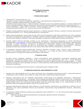 Ogólne Warunki Sprzedaży „KADOR” Sp. z o.o. I. Postanowienia