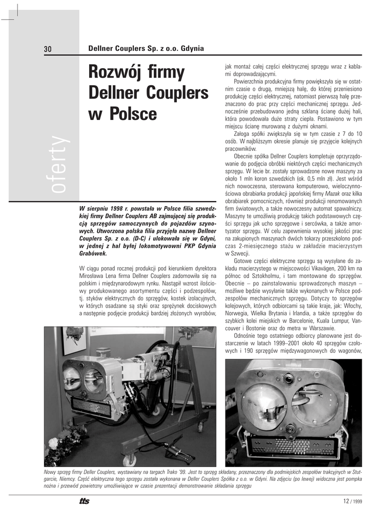 30 Dellner Couplers Sp. z o.o. Gdynia oferty Rozwój firmy Dellner Couplers w Polsce W sierpniu 1998 r. powsta³a w Polsce filia szwedzkiej firmy Dellner Couplers AB zajmuj¹cej siê produkcj¹ sprzêgów samoczynnych do pojazdów szynowych. Utworzona polska filia przyjê³a nazwê Dellner Couplers Sp. z o.o. (D-C) i ulokowa³a siê w Gdyni, w jednej z hal by³ej lokomotywowni PKP Gdynia Grabówek. W ci¹gu ponad rocznej produkcji pod kierunkiem dyrektora Miros³awa Lena firma Dellner Couplers zadomowi³a siê na polskim i miêdzynarodowym rynku. Nast¹pi³ wzrost iloœciowy produkowanego asortymentu czêœci i podzespo³ów, tj. styków elektrycznych do sprzêgów, kostek izolacyjnych, w których osadzane s¹ styki oraz sprê¿ynek dociskowych a nastêpnie podjêcie produkcji bardziej z³o¿onych wyrobów, jak monta¿ ca³ej czêœci elektrycznej sprzêgu wraz z kablami doprowadzaj¹cymi. Powierzchnia produkcyjna firmy powiêkszy³a siê w ostatnim czasie o drug¹, mniejsz¹ halê, do której przeniesiono produkcjê czêœci elektrycznej, natomiast pierwsz¹ halê przeznaczono do prac przy czêœci mechanicznej sprzêgu. Jednoczeœnie przebudowano jedn¹ szklan¹ œcianê du¿ej hali, która powodowa³a du¿e straty ciep³a. Postawiono w tym miejscu œcianê murowan¹ z du¿ymi oknami. Za³oga spó³ki zwiêkszy³a siê w tym czasie z 7 do 10 osób. W najbli¿szym okresie planuje siê przyjêcie kolejnych pracowników. Obecnie spó³ka Dellner Couplers kompletuje oprzyrz¹dowanie do podjêcia obróbki niektórych czêœci mechanicznych sprzêgu. W lecie br. zosta³y sprowadzone nowe maszyny za oko³o 1 mln koron szwedzkich (ok. 0,5 mln z³). Jest wœród nich nowoczesna, sterowana komputerowo, wieloczynnoœciowa obrabiarka produkcji japoñskiej firmy Mazak oraz kilka obrabiarek pomocniczych, równie¿ produkcji renomowanych firm œwiatowych, a tak¿e nowoczesny automat spawalniczy. Maszyny te umo¿liwi¹ produkcjê takich podstawowych czêœci sprzêgu jak ucho sprzêgowe i sercówka, a tak¿e amortyzator sprzêgu. W celu zapewnienia wysokiej jakoœci prac na zakupionych maszynach dwóch tokarzy przeszkolono podczas 2-miesiêcznego sta¿u w zak³adzie macierzystym w Szwecji. Gotowe czêœci elektryczne sprzêgu s¹ wysy³ane do zak³adu macierzystego w miejscowoœci Vikavägen, 200 km na pó³noc od Sztokholmu, i tam montowane do sprzêgów. Obecnie – po zainstalowaniu sprowadzonych maszyn – mo¿liwe bêdzie wysy³anie tak¿e wykonanych w Polsce podzespo³ów mechanicznych sprzêgu. Dotyczy to sprzêgów kolejowych, których odbiorcami s¹ takie kraje, jak: W³ochy, Norwegia, Wielka Brytania i Irlandia, a tak¿e sprzêgów do szybkich kolei miejskich w Barcelonie, Kuala Lumpur, Vancouver i Bostonie oraz do metra w Warszawie. Odnoœnie tego ostatniego odbiorcy planowane jest dostarczenie w latach 1999–2001 oko³o 40 sprzêgów czo³owych i 190 sprzêgów miêdzywagonowych do wagonów, Nowy sprzêg firmy Deller Couplers, wystawiany na targach Trako ’99. Jest to sprzêg sk³adany, przeznaczony dla podmiejskich zespo³ów trakcyjnych w Stutgarcie, Niemcy. Czêœæ elektryczna tego sprzêgu zosta³a wykonana w Deller Couplers Spó³ka z o.o. w Gdyni. Na zdjêciu (po lewej) widoczna jest pompka no¿na i przewód powietrzny umo¿liwiaj¹ce w czasie prezentacji demonstrowanie sk³adania sprzêgu 12 / 1999 31 Sprzêg tramwajowy ³amany typu ALBERTA (nr 164701) firmy Dellner Couplers montowany w tramwajach dla £odzi, Bydgoszczy i Torunia których producentem bêdzie Alstom Transport. Firma ta w wyniku przetargu zosta³a wybrana jako dostawca taborudo metra w Warszawie. Sprzêg czo³owy do wagonów metra bêdzie ca³kowicie automatyczny, co umo¿liwi ³¹czenie i roz³¹czanie zespo³ów metra bez wysiadania maszynisty z kabiny. Sprzêg ten zostanie wyposa¿ony w amortyzator hydrauliczno-gazowy, zapewniaj¹cy komfortow¹ jazdê poci¹gów, bez szarpniêæ w czasie hamowania. Zabezpieczy on równie¿ tabor przed uszkodzeniami, dopuszczaj¹c dojazd jednego sk³adu do drugiego podczas manewru ³¹czenia sk³adów nawet z prêdkoœci¹ 10 km/h. Od pocz¹tku tego roku firma Dellner Couplers Sp. z o.o. uczestniczy³a w pracach nad dostosowaniem sprzêgów tramwajowych w Polsce do wymagañ ustawy „Prawo o ru- chu drogowym”, z dnia 20.6.1997 r., zakazuj¹cej wystawania ostrych czêœci poza pud³o pojazdu ze wzglêdu na zagro¿enie dla przechodniów i innych u¿ytkowników ruchu. Do takich wystaj¹cych czêœci nale¿a³y równie¿ sprzêgi tramwajowe. Dlatego te¿ firma Dellner Couplers opracowa³a sprzêg o konstrukcji ³amanej, który w stanie spoczynkowym mo¿e byæ chowany ca³kowicie pod pud³o wagonu. Ciêg³o g³ówne tego sprzêgu ma przekrój okr¹g³y i jest wykonywane jako odlew. Poprzednio by³a to odkuwka o przekroju prostok¹tnym. Prace zwi¹zane z przebudow¹ sprzêgów wykonywa³o MPK £ódŸ pod nadzorem Dellner Couplers Sp. z o.o.. Odlewy dostarczy³a Huta Ma³a Panew. W ramach tego projektu przebudowano oko³o 500 sprzêgów do tramwajów w £odzi, Bydgoszczy i Toruniu. R-45/99 DELLNER COUPLERS Sp. z o.o. 81-220 Gdynia, Osada Kolejowa 12, tel. (0-58) 628 54 81, fax (0-58) 628 54 80, e-mail:[email protected] 12 / 1999