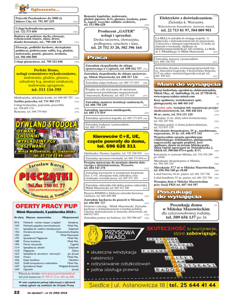 Ogłoszenia... Pożyczki Pozabankowe do 2000 zł, Inkaso City, tel. 792 307 229 (325) Usługi hydrauliczno-gazowe, tel. 722 373 050 (326) Budowa od podstaw, dachy, elewacje, wykończenia wnętrz, okna, drzwi, domki drewniane, tel., 790 448 138 (327) Elewacje, podbitki dachowe, docieplania poddaszy, podwieszane sufity, k-g, gładzie, malowanie, panele, glazura, terakota, tel. 506 606 008 (328) Usługi glazurnicze, tel. 789 252 848 (337) Producent „GATER” usługi i sprzedaż. Deska tarasowa, elewacyjna, podłogowa, sztachety i inne, tel. 25 752 33 20, 502 396 164 (330) Minikoparka, układanie kostki, tel. 600 485 787 (332) Szybka pożyczka, tel. 731 903 573 (333) Usługi brukarskie, poprawki, przeróbki, tel. 530 095 178 (334) Remonty, tel. 698 759 864 (335) Praca Zatrudnię ekspedientkę do sklepu spożywczego, Mińsk Mazowiecki, tel. 608 417 126 (596) Zatrudnię ekipę brukarzy, tel. 605 171 819 (608) Przyjmę na cały etat panią do sprzątania pomieszczeń produkcyjno-magazynowych i biurowych, Kobierne, tel. 602 151 616 (597) Zatrudnię montera instalacji sanitarnych, tel. 606 758 230 (604) Zatrudnię operatora minikoparki, tel. 605 171 819 (605) Zatrudnię operatora koparki, tel. 605 171 819 (606) (609) (610) Kierowców C+E, UE, częste powroty do domu, tel. 696 626 311 Opiekunka, Niemcy, legalnie, tel. 725 248 935 (612) Zatrudnię operatora równiarki, tel. 605 171 819(607) Przyjmę mężczyznę do montażu obuwia dziecięcego z doświadczeniem, Wrzosów, tel. 604 543 278 (611) Zatrudnię kierowców w transporcie krajowym kat. C+E. oferujemy miłą atmosferę oraz atrakcyjne warunki pracy, tel. 607 671 201 (613) Zatrudnię cukiernika lub dobrą pomoc cukiernika, Mińsk Mazowiecki, tel. 605 331 108 (614) Pizzeria RIMINI w Dobrem zatrudni kierowcę i kelnera, tel. 603 890 009 OFERTY PRACY PUP Mińsk Mazowiecki, 5 padziernika 2016 r. Nr oferty Nazwa stanowiska 0916 1244 1411 1452 1455 1475 1489 1495 1514 1518 1623 1624 1626 1633 1643 1644 Miejscowość Mechanik - monter maszyn i urządzeń Kontakt za Mechanik pojazdów samochodowych Mińsk Maz. Specjalista ds. mediów interaktywnych Sulejówek Doradca serwisowy Choszczówka Stojecka stolarz Mińsk Mazowiecki Sprzedawca/ Magazynier Mińsk Maz. Pomoc kuchenna Mińsk Maz. Pomoc nauczyciela Cyganka Specjalista ds. szkoleń Sulejówek Magazynier Dobre Specjalista ds. serwisowo - biurowych gm. Jeruzal Murarz Mińsk Maz. Kasjer handlowy Hipolitów Grafik komputerowy multimediów Mińsk Maz. Sprzedawca/ Kasjer Wielgolas Brzeziński Ogrodnik Jeruzal Więcej na stronie: www.praca.powiatminski.pl lub pod numerem 25 759 27 13 w. 401 do 406. W celu uzyskania pełnej informacji o ofertach należy zgłosić się osobiście do Urzędu Pracy. 22 Co słychać? – nr 41 (992) 2016 (616) Wykształcenie kierunkowe, darmowy dojazd, tel. 22 713 81 97, 504 009 901 Zatrudnię murarzy i pomocników, tel. 608 138 592 Zatrudnię ekspedientkę do sklepu spożywczego w Cegłowie, tel. 698 562 737 (591) Zatrudnię brukarzy i pomocników, tel. 605 171 819 Elektryków z doświadczaniem. Zielonka k. Warszawy. LA BELLA zatrudni do swojego zespołu. 1) kelnera/kę z doświadczeniem lub do przyuczenia, 2) kierowcę z własnym samochodem, 3) osobę na zmywak w weekendy. Aplikacje na [email protected] lub osobiście. La Bella ul. J. Piłsudskiego 21 Mińsk Mazowiecki (618) (329) Perfekt Home, usługi remontowo-wykończeniowe, malowanie, gładzie, glazura, zabudowy k-g, montaż sztukaterii, malowanie agregatem, tel. 511 116 595 Remonty kapitalne, malowanie, gładzie gipsowe, K-G, glazura, terakota, panele, tapety, wszystko solidnie osobiście, (336) tel. 511 006 628 (615) Zatrudnię kucharza do pizzerii w Mrozach, (617) tel. 696 001 727 Domowo catering – Mińsk Mazowiecki. Zatrudni kucharza z doświadczeniem w kuchni polskiej. Chętnie doświadczenie w żywieniu zbiorowym, tel. 609 017 097 (619) Zatrudnię pomoc na budowę, tel. 502 986 667 (620) (621) Zatrudnię doradcę serwisowego/pracownik biura, Autosalon Ługowski, Choszczówka Stojecka, CV na adres: [email protected], tel. 601 359 441 (622) Mam do wynajęcia Sprzęt budowlany, ogrodniczy, elektronarzędzia, Mińsk Maz., ul. Andriollego 16, tel. 25 758 60 41, www.wypozyczalnia–minsk.com (1) Kosy spalinowe, wertykuratory spal., glebogryzarki, tel. 606 445 143 (2) Weselna sala, wynajem lub organizacja przyjęć (350) okolicznościowych, tel. 508 446 824 40 m2, nowe, tel. 514 131 210 (378) Wynajmę 12 m2, (były salon kosmetyczny), (391) tel. 502 287 956 Wynajmę pokój w domu jednorodzinnym, tel. 513 037 370 (397) Mieszkanie dwupokojowe, IV p., umeblowane, wyposażone, 35 m2, tel. 696 073 242 (399) Wypożyczalnia sprzętu ogrodniczego i budowlanego: weltykulatory, glebogryzarki, zagęszczarki, agregaty prądowe, kosy spalinowe, dowóz na terenie Mińska gratis. Sklep Ogród Agroexpert ul. Świętokrzyska 2, Mińsk tel. 500 666 074 w godz. 8-17, (401) Kawalerka w centrum Mińska, tel. 532 536 289 po 18.00 Mieszkanie dwupokojowe w Mińsku, tel. 504 284 324 (402) (404) Mieszkanie 37,7 m2 w Mińsku Mazowieckim, tel. 696 504 160 po 18.00 (405) Lokal biurowy 44 m2, piętro, tel. 601 323 740 (406) Lokal handlowy 55 m2, parter, tel. 601 323 740 (407) Wynajmę dom w Mińsku Mazowieckim przy stacji PKP, tel. 607 164 507 (608) Poszukuję do wynajęcia Poszukuję domu w Mińsku Mazowieckim dla czteroosobowej rodziny, tel. 509 656 137 po 16 (26)