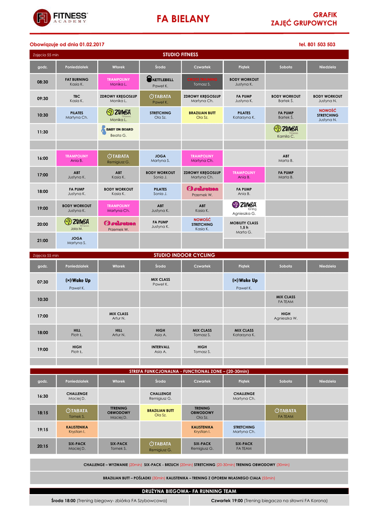 GRAFIK ZAJĘĆ GRUPOWYCH FA BIELANY Obowiązuje od dnia 01.02.2017 tel. 801 503 503 STUDIO FITNESS Zajęcia 55 min godz. Poniedziałek Wtorek Środa Czwartek Piątek 08:30 FAT BURNING Kasia K. TRAMPOLINY Monika L. Paweł K. CROSS TRAINING Tomasz S. BODY WORKOUT Justyna K. 09:30 TBC Kasia K. ZDROWY KRĘGOSŁUP Monika L. Paweł K. ZDROWY KRĘGOSŁUP Martyna Ch. 10:30 PILATES Martyna Ch. STRETCHING Ola Sz. BRAZILIAN BUTT Ola Sz. 11:30 Monika L. Sobota Niedziela FA PUMP Justyna K. BODY WORKOUT Bartek Ś. BODY WORKOUT Justyna N. PILATES Katarzyna K. FA PUMP Bartek Ś. NOWOŚĆ STRETCHING Justyna N. Beata G. Kamila C. 16:00 TRAMPOLINY Ania B. Remigiusz G. JOGA Martyna S. TRAMPOLINY Martyna Ch. 17:00 ABT Justyna K. ABT Kasia K. BODY WORKOUT Sonia J. ZDROWY KRĘGOSŁUP Martyna Ch. TRAMPOLINY Ania B. 18:00 FA PUMP Justyna K. BODY WORKOUT Kasia K. PILATES Sonia J. Przemek W. FA PUMP Ania B. 19:00 BODY WORKOUT Justyna K. TRAMPOLINY Martyna Ch. ABT Justyna K. ABT Kasia K. FA PUMP Justyna K. NOWOŚĆ STRETCHING Kasia K. 20:00 Jola M. Przemek W. FA PUMP Marta B. Agnieszka G. MOBILITY CLASS 1,5 h Marta G. JOGA Martyna S. 21:00 STUDIO INDOOR CYCLING Zajęcia 55 min godz. ABT Marta B. Poniedziałek Wtorek Środa Czwartek Piątek MIX CLASS Paweł K. 07:30 Paweł K. Sobota Niedziela Paweł K. MIX CLASS FA TEAM 10:30 MIX CLASS Artur N. 17:00 18:00 HILL Piotr Ł. 19:00 HIGH Piotr Ł. HIGH Agnieszka W. HILL Artur N. HIGH Asia A. MIX CLASS Tomasz S. INTERVALL Asia A. HIGH Tomasz S. MIX CLASS Katarzyna K. STREFA FUNKCJONALNA - FUNCTIONAL ZONE – (20-30min) godz. Poniedziałek 16:30 CHALLENGE Maciej D. 18:15 Tomek S. 19:15 KALISTENIKA Krystian I. 20:15 SIX-PACK Maciej D. Wtorek Środa Czwartek Piątek CHALLENGE Remigiusz G. TTRENING OBWODOWY Maciej D. SIX-PACK Tomek S. BRAZILIAN BUTT Ola Sz. Remigiusz G. Sobota Niedziela CHALLENGE Martyna Ch. TRENING OBWODOWY Ola Sz. FA TEAM KALISTENIKA Krystian I. STRETCHING Martyna Ch. SIX-PACK Remigiusz G. SIX-PACK FA TEAM CHALLENGE – WYZWANIE (20min) SIX-PACK - BRZUCH (20min) STRETCHING (20-30min) TRENING OBWODOWY (30min) BRAZILIAN BUTT – POŚLADKI (30min) KALISTENIKA – TRENING Z OPOREM WŁASNEGO CIAŁA (55min) DRUŻYNA BIEGOWA- FA RUNNING TEAM Środa 18:00 (Trening biegowy- zbiórka FA Szybowcowa) Czwartek 19:00 (Trening biegacza na siłowni FA Korona) ZAJĘCIA WZMACNIAJĄCE ABT FA BIELANY Trening szczególnie ukierunkowany na kształtowanie dolnych partii ciała (brzuch, pośladki, uda). ABT to jednocześnie trening wprowadzający i przygotowujący organizm do wysiłku fizycznego (układ sercowo-naczyniowy, mięśniowy i kostno-więzadłowy). Podczas zajęć skupiamy się na nauce kroków podstawowych (wydłużona rozgrzewka), technice wykonywania podstawowych ćwiczeń wzmacniających (będących niezbędnym elementem wprowadzającym do efektywnego treningu fitness). Koncentracja podczas treningu na pracy dolnych partii ciała, da efekt jędrnych pośladków, zgrabnych nóg i smukłej talii. Zajęcia dla wszystkich. BODY WORKOUT Wszechstronny trening wzmacniający i kształtujący całe ciało. Podczas treningu bazujemy na podstawowych ćwiczeniach, które stopniowo ( poziomami) przekształcamy w bardziej złożone kombinacje, angażujących coraz to więcej grup mięśniowych. Płynność łączenia ćwiczeń, oraz niejednokrotnie praca oparta na treningu interwałowym stawia wyzwanie dla układów krążenia i oddechowego. Dzięki takiemu połączeniu trening doskonałe wyszczupla, kształtuje piękną i smukłą sylwetkę. Stosowanie dodatkowego sprzętu (stepy, hantle, gumy oporowe) lub odpowiednich skurczów mięśniowych, zwiększa zaangażowanie mięśni głębokich. Kolejny poziom po zajęciach ABT. Polecany dla wszystkich. FA PUMP Autorski program Fitness Academy. Trening wytrzymałościowo-siłowy wykonywany z użyciem sztangi, o zróżnicowanym ciężarze, w zależności od wzmacnianej grupy mięśniowej i indywidualnych możliwości ćwiczącego. Trening oparty na 3 miesięcznym programie, podczas którego pracujemy do ustalonej choreografii, muzyki oraz rodzaju ćwiczenia na daną grupę lub grupy mięśniowe. Po 3 miesiącach następuje zmiana programu, którego celem jest progres, bodźcowanie mięśni i dalszy rozwój wytrzymałościsiłowej i spalania tkanki tłuszczowej. Celem systematycznego treningu jest spalanie tkanki tłuszczowej na rzecz pięknego zarysu mięśnia, wyszczuplenie i uzyskanie efektu tzw.: „rzeźby mięśniowej”. Piękna, wysportowana i szczupła sylwetka. ZDROWY KRĘGOSŁUP Trening wzmacniający wszystkie grupy mięśniowe. Doskonałe rezultaty pracy nad ciałem dzięki niestabilnej powierzchni piłki, która u uczestników wymusza świadomą pracę, technikę i szukanie tzw. balansu ciała. Trening z piłką to połączenie efektów wzmacniających mięśnie, korekcyjnych, stabilizujących i odciążających stawy kręgosłupa. Celem zajęć jest wzmocnienie głębokich mięśni ciała odpowiedzialnych za piękną sylwetkę, wyprostowaną postawę. Trening dla wszystkich. TBC Total Body Conditioning. Ogólnorozwojowy trening mięśni całego ciała przeznaczony dla wszystkich osób, którym zależy na dobrym samopoczuciu i świetnym wyglądzie całego ciała. GRAFIK ZAJĘĆ GRUPOWYCH muzyce na specjalnie przygotowanych rowerach INDOOR CYCLING Trening wytrzymałościowo - siłowy przy stacjonarnych. Trening dla każdego niezależnie od wieku, płci, czy sprawności fizycznej, dzięki możliwości regulacji obciążenia wg indywidualnych potrzeb. Niezapomniane wrażenia, motywacja, chwila oderwania się w świat górskich wycieczek, czy leśnych zakątków, a przy tym spalanie tkanki tłuszczowej, poprawa wytrzymałości i wydolności organizmu. W zależności od wytrenowania organizmu, Indoor Cycling podzielony jest na rodzaje: LOW - zajęcia w przedziale 65-75% HR. Celem treningu jest zwiększenie wytrzymałości i wydolności tlenowej. W trakcie zajęć Low wspomagamy metabolizm tłuszczy. Zalecany osobom początkującym