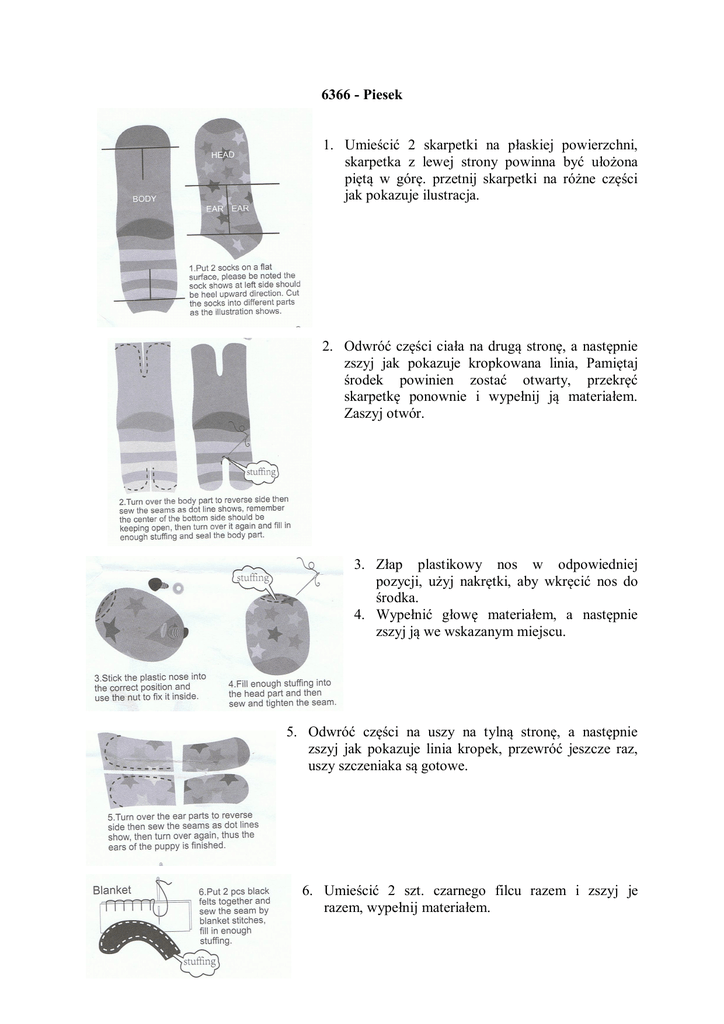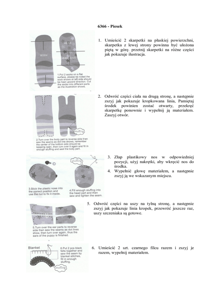 6366 - Piesek 1. Umieścić 2 skarpetki na płaskiej powierzchni, skarpetka z lewej strony powinna być ułożona piętą w górę. przetnij skarpetki na różne części jak pokazuje ilustracja. 2. Odwróć części ciała na drugą stronę, a następnie zszyj jak pokazuje kropkowana linia, Pamiętaj środek powinien zostać otwarty, przekręć skarpetkę ponownie i wypełnij ją materiałem. Zaszyj otwór. 3. Złap plastikowy nos w odpowiedniej pozycji, użyj nakrętki, aby wkręcić nos do środka. 4. Wypełnić głowę materiałem, a następnie zszyj ją we wskazanym miejscu. 5. Odwróć części na uszy na tylną stronę, a następnie zszyj jak pokazuje linia kropek, przewróć jeszcze raz, uszy szczeniaka są gotowe. 6. Umieścić 2 szt. czarnego filcu razem i zszyj je razem, wypełnij materiałem. 7. Przyszyj uszy do głowy, a następnie przyszyj filcowe guziki na głowie, jako oczy. 8. Użyj czarnych nici i wyszyj kształt jamy ustnej pod nosem, jak pokazuje ilustracja. 9. Wreszcie połącz wszystkie części razem, Twój niegrzeczny szczeniak jest gotowy! Dystrybutor: MAXIMA zabawki drewniane, Gorzów Wlkp.