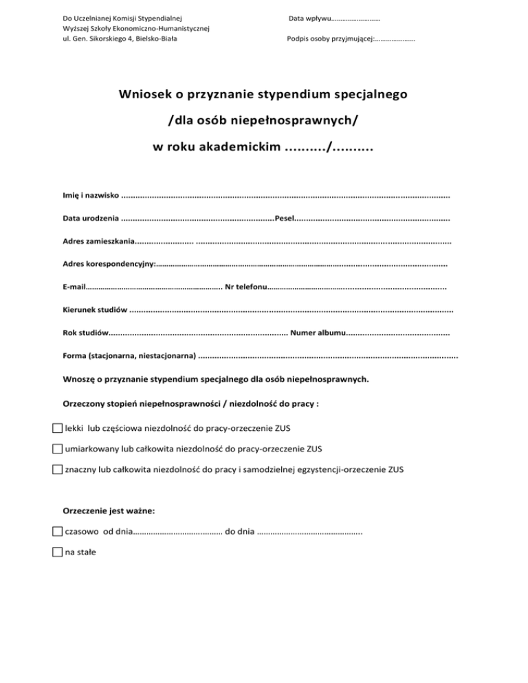 Wniosek stypendia specjalne - dla osób niepełnosprawnych