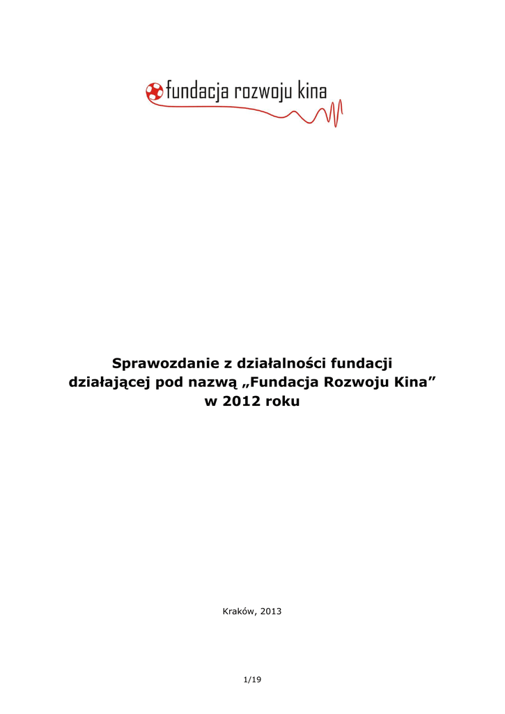 Sprawozdanie z działalności fundacji działającej pod nazwą „Fundacja Rozwoju Kina” w 2012 roku Kraków, 2013 1/19 SPIS TREŚCI zgodnie z ROZPORZĄDZENIEM MINISTRA SPRAWIEDLIWOŚCI z dnia 8 maja 2001 r. w sprawie ramowego zakresu sprawozdania z działalności fundacji. (Dz. U. z dnia 22 maja 2001 r.) 1. 2. 3. 4. 5. 6. 7. 8. 9. DANE REJESTRACYJNE CELE I DZIAŁANOŚĆ STATUTOWA DZIAŁALNOŚĆ GOSPODARCZA UCHWAŁY ZARZĄDU FUNDACJI PRZYCHODY KOSZTY ZATRUDNIENIE INWESTYCJE I DZIAŁALNOŚĆ ZLECONA ROZLICZENIA 2/19 3 4 12 13 14 16 17 18 19 Sprawozdanie z działalności fundacji w 2012 roku ___________________________________________________________________________ 1. DANE REJESTRACYJNE Nazwa: Fundacja Rozwoju Kina Adres: 30- 364 Kraków, ul. Pychowicka 7 Data ustanowienia: 12.01.2006 roku Data rejestracji: 26.01.2006 roku Nr KRS: 0000249475 REGON : 120188396 Zarząd w 2012: Prezes Zarządu Marta Materska-Samek Wiceprezes Zarządu Renata Pawlusińska 3/19 Sprawozdanie z działalności fundacji w 2012 roku ___________________________________________________________________________ 2. CELE I DZIAŁALNOŚĆ STATUTOWA Cele fundacji, od ich aktualizacji w dniu 6 października 2010 roku, nie uległy zmianie. Zgodnie z paragrafem 8 statutu „Celem fundacji jest działalność naukowa, naukowotechniczna, oświatowa, kulturalna, także w zakresie kultury fizycznej i sportu, wspierania inicjatyw społecznych, dobroczynności, ochrony zdrowia i pomocy społecznej, w szczególności upowszechnianie wiedzy o kinie, edukacja medialna i rozwój ICT, promocja nowych technologii kinowych oraz wspieranie rozwoju rynku kinowego w Polsce.” Działania podejmowane by realizować cele statutowe zgodnie z rozdziałem II Cele Fundacji, § 9 pkt 1, Statutu są następujące: 1. organizowanie seminariów, szkoleń, warsztatów, targów, wystaw i konferencji poświęconych edukacji i kulturze a w szczególności rynkowi kinowemu; 2. doskonalenie zawodowe osób działających w obszarze kultury i edukacji, ze szczególnym uwzględnieniem branży kinowej, 3. organizowanie i finansowanie pokazów promujących rozwój kultury i branży kinowej; 4. wydawanie materiałów informacyjnych dotyczących kultury, w tym rynku kinowego; 5. wdrażanie nowych technologii, 6. gromadzenie środków materialnych i finansowych pozwalających na realizację celów Fundacji; 7. współpracę z osobami fizycznymi i prawnymi działającymi w zakresie objętym celem Fundacji a w szczególności z osobami i środowiskami zaangażowanymi w dziedzinie rozwoju kina tj. dystrybutorami filmów, dostawcami sprzętu kinotechnicznego; 8. współpracę z publicznymi służbami zatrudnienia, 9. działalność szkoleniową na rzecz osób bezrobotnych, poszukujących pracy, w szczególności kobiet, młodzieży, seniorów, niepełnosprawnych 10. nawiązywanie i utrzymywanie stosunków z międzynarodowymi i zagranicznymi organizacjami w zakresie celów Fundacji; 11. promocję i wspomaganie edukacji, 12. edukację społeczną 13. usługi doradcze i eksperckie 14. organizowanie przedsięwzięć informacyjnych i promocyjnych. W odniesieniu do przedstawionych celów, fundacja podejmowała działania służące ich realizacji w ramach działalności statutowej nieodpłatnej i odpłatnej. W roku 2012 fundacja realizowała następujące projekty, które miały charakter nieodpłatny: 1. V Międzynarodowy Festiwal Filmów Dziecięcych GALICJA 2012 2. Szkolna Akademia Łamigłowy SZAŁ 3. Kultura naszym biznesem 4. Tworzyć każdy może 5. Teatr słowa 6. Małopolskie Forum Organizacji Pozarządowych 2012 4/19 5. Międzynarodowy Festiwal Filmów Dziecięcych GALICJA Festiwal odbył się w dniach 17-21 czerwca 2012, w Krakowie, Tarnowie i Tuchowie. Była to edycja jubileuszowa tego największego święta filmowego dzieci w regionie. Centrum życia festiwalowego skupiało się w kinie Kijów.Centrum w Krakowie. To cykliczne wydarzenie ma na celu promocję sztuki filmowej wśród dzieci i młodzieży oraz stworzenie warunków do aktywnego uczestnictwa w życiu kulturalnym i twórczego spędzania czasu. Festiwal do niepowtarzalna okazja do obejrzenia najnowszych produkcji dziecięcych o charakterze prorodzinnym i edukacyjnym, do spotkań z aktorami i osobistościami świata filmu i mediów oraz do uczestniczenia do warsztatach filmowych dla dzieci. Uroczystemu otwarciu festiwalu, które odbyło się w niedzielę 17 czerwca, towarzyszyły kostiumowy bal filmowy, spotkania z gośćmi specjalnymi wydarzenia oraz członkami jury festiwalowego, filmowy happening oraz projekcja filmu, na którym dobrze bawiły się zarówno dzieci jak i rodzice. Od poniedziałku do czwartku, w ośmiu pasmach konkursowych, dla dzieci w wieku 4-14 lat, widzowie mogli obejrzeć najnowsze produkcje z całego świata kandydujące do nagrody głównej w wysokości 2000 euro. Do konkursu zgłoszonych zostało ponad 50 filmów, z których jury wybrało 6 fabularnych filmów pełnometrażowych oraz kilkanaście animacji. Na ekranie, oprócz młodych aktorów dziecięcych, widzowie zobaczyli znanych polskich aktorów takich jak Julia Kamińska czy Daniel Olbrychski. Projekcje konkursowe poprzedzały pokazy filmów kręconych przez dzieci w ramach ogólnopolskiego konkursu na najlepszy krótkometrażowy film amatorski pn. „Ogranicza mnie tylko wyobraźnia”. Pokazom konkursowym towarzyszyły warsztaty interdyscyplinarne, które poprowadzili doświadczeni animatorzy oraz profesjonaliści z dziedziny produkcji audiowizualnych. Warsztaty z animacji poklatkowej koordynowała Marta Pajek – reżyserka filmów animowanych, a warsztaty filmowe twórcy związani z Krakowską Szkołą Filmową. Warsztaty aktorskie z Andrzejem Maleszką cieszyły się dużym zainteresowaniem uczestników (około 60 osób). W trakcie zajęć uczestnicy mieli możliwość pracy z wykorzystaniem profesjonalnego sprzętu filmowego, przy pomocy którego stworzyli swoje pierwsze dzieła filmowe. W ramach rodzinnych wieczo