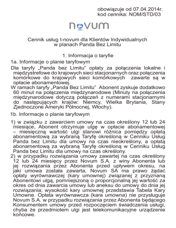 obowiązuje od 07.04.2014r. kod cennika: NOM/STD/03 Cennik usług t-novum dla Klientów Indywidualnych w planach Panda Bez Limitu 1. Informacja o taryfie 1a. Informacje o planie taryfowym Dla taryfy „Panda bez Limitu” opłaty za połączenia lokalne i międzystrefowe do krajowych sieci stacjonarnych oraz połączenia komórkowe do krajowych sieci komórkowych zawarte są w opłacie abonamentowej. W ramach taryfy „Panda Bez Limitu” Abonent zyskuje dodatkowo 60 minut na połączenia międzynarodowe (Minuty na połączenia międzynarodowe dotyczą połączeń z numerami stacjonarnymi do następujących krajów: Niemcy, Wielka Brytania, Stany Zjednoczone Ameryki Północnej, Włochy). 1b. Informacje o planie taryfowym 1) w związku z zawarciem umowy na czas określony 12 lub 24 miesiące, Abonent otrzymuje ulgę w opłacie abonamentowej – miesięczną wartość ulgi stanowi różnica pomiędzy opłatą abonamentową za wybraną Taryfę określoną w Cenniku Usług Panda bez Limitu dla umowy na czas nieokreślony, a opłatą abonamentową za wybraną Taryfę określoną w Cenniku Usług Panda bez Limitu dla umowy na czas określony. 2) w przypadku rozwiązania umowy zawartej na czas określony 12 lub 24 miesięcy przez Novum S.A. z winy Abonenta lub jej rozwiązania przez Abonenta przed upływem okresu, na jaki umowa została zawarta, Novum SA ma prawo żądać opłaty wyrównawczej (kary umownej) związanej z przyznaną Abonentowi ulgą, pomniejszoną o proporcjonalną jej wartość za okres od dnia zawarcia umowy lub aneksu do umowy do dnia jej rozwiązania; wysokość kary umownej przedstawia Tabela Kary Umowne. Opłata wyrównawcza (kara umowna) nie przysługuje Novum S.A. w przypadku rozwiązania przez Abonenta będącego Konsumentem umowy przed rozpoczęciem świadczenia usługi, chyba że przedmiotem ulgi jest telekomunikacyjne urządzenie końcowe. 2. Opłaty aktywacyjne i jednorazowe Nazwa opłaty Wysokość opłaty Opłata aktywacyjna przy Umowie na 220,00 zł czas nieokreślony Opłata aktywacyjna przy Umowie na 110,00 zł 12 miesięcy Opłata aktywacyjna przy Umowie na 1,23 zł 24 miesięcy 3. Opłaty abonamentowe Nazwa opłaty Wysokość opłaty Abonament t-novum Panda Bez Limitu 49,50 zł przy Umowie na czas nieokreślony Abonament t-novum Panda Bez 44,70 zł Limitu przy Umowie na 12 miesiące Abonament t-novum Panda Bez Limitu 39,90 zł przy Umowie na 24 miesiące 4. Połączenia głosowe krajowe Nazwa Opłaty Wysokość opłaty w ramach opłaty Połączenia lokalne i międzystrefowe abonamentowej w ramach opłaty Połączenia do sieci komórkowych abonamentowej Połączenia na numery 801 0, 801 3, 801 0,28 zł/min 4, 801 5, 801 9, 801 6, 804 1, 804 2 Połączenia na numery 19xxx, 116xxx 0,68 zł/min Połączenia międzynarodowe zgodnie z tabelą 5 Taryfikacja - naliczanie minutowe 5. Połączenia międzynarodowe za Numer Opłata minutę Kraj lub terytorium strefy połączenia Niemcy, Wielka Brytania, Stany 1 0,46 zł Zjednoczone Ameryki Północnej, Włochy,. 2 2,13 zł Albania, Algieria, Andora, Armenia, Azerbejdżan, Białoruś, Bośnia i Hercegowina, Bułgaria, Chorwacja, Czarnogóra, Gibraltar, Gruzja, Gujana Francuska, Gwadelupa, Islandia, Serbia, 3 4 Kazachstan, Kirgistan, Libia, Liechtenstein, Macedonia, Maroko, Martynika, Mołdawia, Monako, Norwegia, Owcze (Wyspy), Reunion, Rosja, San Marino, Szwajcaria, Tadżykistan, Tunezja, Turcja, Turkmenistan, Ukraina, Uzbekistan, Watykan, Austria, Belgia, Cypr, Czechy, Chiny, Dania, Estonia, Finlandia, Francja, Grecja, Hiszpania, Holandia, Indie, Irlandia, Kanada, Litwa, Luksemburg, Łotwa, Malta, Portugalia, Rumunia, Słowacja, Słowenia, Szwecja, Węgry, Wietnam. Alaska, Australia, Dziewicze Wyspy St. Zjedn., Ekwador, Gabon, Gwatemala, 4,87 zł Hawaje, Portoryko, Somalia, Wenezuela, Zjednoczone Emiraty Arabskie Afganistan, Angola, Anguilla, Antigua i Barbuda, Antyle Holenderskie, Arabia Saudyjska, Argentyna, Aruba, Bahamy, Bahrajn, Bangladesz, Barbados, Belize, Benin, Bermudy, Bhutan, Boliwia, Botswana, Brazylia, Brunei, Burkina Faso, Burundi, Chile, Cooka (Wyspy), Czad, Diego Garcia, Dominika, Dominikana, Dziewicze Wyspy Brytyjskie, Dżibuti, Egipt, Erytrea, Etiopia, Falklandy (Malwiny), Fidżi, Filipiny, Gambia, Ghana, Grenada, Grenlandia, Guam, Gujana, Gwinea, Gwinea Bissau, Gwinea Równikowa, Haiti, 7,48 zł Honduras, Hongkong, Indonezja, Irak, Iran, Izrael, Jamajka, Japonia, Jemen, Jordania, Kajmany, Kambodża, Kamerun, Katar, Kenia, Kiribati, Kolumbia, Komory, Kongo, Kongo - Rep. Demokratyczna, Korea Południowa, Koreańska Rep. Lud.-Demokratyczna, Kostaryka, Kuba, Kuwejt, Laos, Lesotho, Liban, Liberia, Madagaskar, Makau, Majotta, Malawi, Malediwy, Malezja, Mali, Mariany (Wyspy), Marshalla (Wyspy), Mauretania, Mauritius, Majotta, Meksyk, Mikronezja, Mongolia, Montserrat, Mozambik, Myanmar, Namibia, Nauru, Nepal, Niger, Nigeria, Nikaragua, Niue, Norfolk, Nowa Kaledonia, Nowa Zelandia, Oman, Pakistan, Palau, Palestyna, Panama, Papua (Nowa Gwinea), Paragwaj, Peru, Polinezja Francuska, Republika Południowej Afryki, Republika Środkowo-Afrykańska, Rwanda, Saint Kitts i Nevis (Wyspy), Saint Lucia (Wyspa), Saint Vincent i Grenadyny (Wyspa), Salomona (Wyspy), Salwador, Samoa Amerykańskie, Samoa Zachodnie, Senegal, Seszele, Sierra Leone, Singapur, Sri Lanka, Sudan, Surinam, Suazi, Syria, Św. Heleny (Wyspa), Św. Piotra i Mikelona (Wyspy), Św. Tomasza i Księżyca (Wyspa), Tajlandia, Tajwan, Tanzania, Timor Wschodni, Togo, Tokelau, Tonga, Trynidad i Tobago, Turks i Caicos, Tuvalu, Uganda, Urugwaj, Wallis i Futuna, Wniebowstąpienia (Wyspy), Wybrzeże Kości Słoniowej, Vanuatu, Zambia, Zielonego Przylądka (Wyspy), Zimbabwe. 5 Inne kraje, terytoria, statki, promy, sieci 36,00 zł satelitarne niewymienione powyżej w niniejszej tabeli. Opłaty za minutę połączenia międzynarodowego dotyczą połączeń głosowych. 6. Usługi dodatkowe Nazwa opłaty Połączenie z Pocztą Głosową (+48 601 222 222) Połączenie z B
