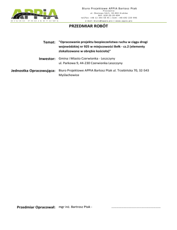Bi ur o Pr ojektowe AP P I A Bar tosz P tak Pracownia: ul. Zbożowa 5A/1, 30-002 Kr aków NIP: 628-20-20-694 tel/fax: +48 12 393 58 45 | kom: +48 692 229 996 e-mail: bi ur o@ap pia. pr o | www. ap pia. pro PRZEDMIAR ROBÓT Temat: "Opracowanie projektu bezpieczeństwa ruchu w ciągu drogi wojewódzkiej nr 925 w miejscowości Bełk - cz.2 (elementy zlokalizowane w obrębie kościoła)" Inwestor: Gmina i Miasto Czerwionka - Leszczyny ul. Parkowa 9, 44-230 Czerwionka Leszczyny Jednostka Opracowująca: Biuro Projektowe APPIA Bartosz Ptak ul. Trzebińska 70, 32-543 Myślachowice Przedmiar Opracował: mgr inż. Bartrosz Ptak - …………………………………………………… Zuzia10 (C) Datacomp 1994-2011(lic. 15477) Przedmiar robót Nr 1 1.1 1.1.1 1.2 1.2.1 1.2.2 1.3 1.3.1 1.3.2 1.3.3 1.3.4 1.4 1.4.1 1.4.2 1.4.3 1.4.4 1.4.5 1.4.6 1.4.7 1.5 1.5.1 1.5.2 1.5.3 1.6 1.6.1 1.6.2 Podstawa ceny Opis robót, wyliczenie ilości robót jednostkowej Kosztorys "Opracowanie projektu bezpieczeństwa ruchu w ciągu drogi wojewódzkiej nr 925 w miejscowości Bełk - cz.2 (elementy zlokalizowane w obrębie kościoła)" Grupa Elementy drogowe Element Roboty przygotowawcze KNR 201/119/3 Nr STWiOR: D.01.01.01 Roboty pomiarowe przy liniowych robotach ziemnych, trasa dróg w terenie równinnym Element Roboty rozbiórkowe KNR 231/804/3 Nr STWiOR: D.01.02.04 Rozebranie nawierzchni, z tłucznia mechanicznie, grubość nawierzchni 15·cm KNR 231/804/4 Nr STWiOR: D.01.02.04 Rozebranie nawierzchni, z tłucznia mechanicznie, dodatek za każdy dalszy 1·cm grubości Element Roboty ziemne i transportowe KNR 401/108/1 Nr STWiOR: D.02.01.01 1 Wywóz gruzu samochodami samowyładowczymi do 1·km KNR 401/108/1 Nr STWiOR: D.02.01.01 2 Wywóz gruzu samochodami samowyładowczymi na każdy następny 1·km KNNR 6/103/3 Nr STWiOR: D.04.01.01 (1) Profilowanie i zagęszczanie podłoża pod warstwy konstrukcyjne nawierzchni, wykonywane mechanicznie, kategoria gruntu II-VI, walec wibracyjny Kalkulacja Nr STWiOR: D.02.01.01 indywidualna Opłata za umieszczenie odpadów z budowy (ziemia i gruz) Element Kraweżniki i obrzeża KNR 231/403/3 Nr STWiOR: D.08.01.01 Krawężniki betonowe, wystające 15x30·cm na podsypce cementowo-piaskowej KNR 231/403/7 Nr STWiOR: D.08.01.01 Krawężniki betonowe, dodatek za ustawienie krawężników na łukach o promieniu do 10·m KNR 231/402/4 Nr STWiOR: D.08.01.01 Ławy pod krawężniki, betonowa z oporem KNR 231/402/5 Nr STWiOR: D.08.01.01 Ławy pod krawężniki, dodatek za wykonanie ławy betonowej na łukach o promieniu do 40·m KNR 231/407/5 Nr STWiOR: D.08.03.01 Obrzeża betonowe, 30x8·cm na podsypce cementowo-piaskowej z wypełnieniem spoin zaprawą cementową Analogia Nr STWiOR: D.08.03.01 Ławy pod obrzeża, betonowa z oporem KNR 231/1004/ Nr STWiOR: D-04.03.01 1 Oczyszczenie nawierzchni drogowych, ręczne, nawierzchnia nieulepszona, podbudowa pomocnicza Element Nawierzchnia stanowisk postojowych i jezdni manewrowej KNR 231/511/3 Nr STWiOR: D.08.02.02 (1) Nawierzchnie z kostki brukowej betonowej, grubość 8·cm, na podsypce cementowo-piaskowej, kostka szara KNR 231/114/1 Nr STWiOR: D.04.04.02 Podbudowy z kruszyw, pospółka, warstwa dolna, grubość warstwy po zagęszczeniu 20·cm (kruszywo łamane 0/31.5) KNR 231/114/2 Nr STWiOR: D.04.04.02 Podbudowy z kruszyw, pospółka, warstwa dolna, dodatek za każdy dalszy 1·cm grubości Element Nawierzchnia chodników KNR 231/511/3 Nr STWiOR: D.08.02.02 (1) Nawierzchnie z kostki brukowej betonowej, grubość 8·cm, na podsypce cementowo-piaskowej, kostka szara KNR 231/114/5 Nr STWiOR: D.04.04.02 Podbudowy z kruszyw, tłuczeń, warstwa dolna, grubość warstwy po zagęszczeniu 15·cm (kruszywo łamane 0/31.5) J.m. Ilość km 0.04 m2 210.50 m2 210.50 m3 73.68 m3 73.68 m2 210.50 t 125.26 m 48.60 m 12.20 m3 4.86 m3 0.12 m 23.50 m3 1.41 m2 57.00 m2 152.30 m2 152.30 m2 152.30 m2 58.00 m2 58.00 strona nr: Krot. 20 3 4 2