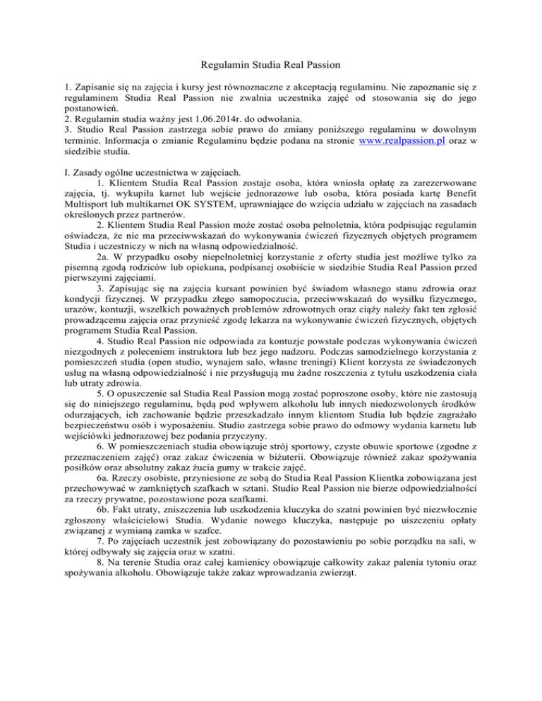 Regulamin Studia Real Passion 1. Zapisanie się na zajęcia i kursy jest równoznaczne z akceptacją regulaminu. Nie zapoznanie się z regulaminem Studia Real Passion nie zwalnia uczestnika zajęć od stosowania się do jego postanowień. 2. Regulamin studia ważny jest 1.06.2014r. do odwołania. 3. Studio Real Passion zastrzega sobie prawo do zmiany poniższego regulaminu w dowolnym terminie. Informacja o zmianie Regulaminu będzie podana na stronie www.realpassion.pl oraz w siedzibie studia. I. Zasady ogólne uczestnictwa w zajęciach. 1. Klientem Studia Real Passion zostaje osoba, która wniosła opłatę za zarezerwowane zajęcia, tj. wykupiła karnet lub wejście jednorazowe lub osoba, która posiada kartę Benefit Multisport lub multikarnet OK SYSTEM, uprawniające do wzięcia udziału w zajęciach na zasadach określonych przez partnerów. 2. Klientem Studia Real Passion może zostać osoba pełnoletnia, która podpisując regulamin oświadcza, że nie ma przeciwwskazań do wykonywania ćwiczeń fizycznych objętych programem Studia i uczestniczy w nich na własną odpowiedzialność. 2a. W przypadku osoby niepełnoletniej korzystanie z oferty studia jest możliwe tylko za pisemną zgodą rodziców lub opiekuna, podpisanej osobiście w siedzibie Studia Real Passion przed pierwszymi zajęciami. 3. Zapisując się na zajęcia kursant powinien być świadom własnego stanu zdrowia oraz kondycji fizycznej. W przypadku złego samopoczucia, przeciwwskazań do wysiłku fizycznego, urazów, kontuzji, wszelkich poważnych problemów zdrowotnych oraz ciąży należy fakt ten zgłosić prowadzącemu zajęcia oraz przynieść zgodę lekarza na wykonywanie ćwiczeń fizycznych, objętych programem Studia Real Passion. 4. Studio Real Passion nie odpowiada za kontuzje powstałe podczas wykonywania ćwiczeń niezgodnych z poleceniem instruktora lub bez jego nadzoru. Podczas samodzielnego korzystania z pomieszczeń studia (open studio, wynajem salo, własne treningi) Klient korzysta ze świadczonych usług na własną odpowiedzialność i nie przysługują mu żadne roszczenia z tytułu uszkodzenia ciała lub utraty zdrowia. 5. O opuszczenie sal Studia Real Passion mogą zostać poproszone osoby, które nie zastosują się do niniejszego regulaminu, będą pod wpływem alkoholu lub innych niedozwolonych środków odurzających, ich zachowanie będzie przeszkadzało innym klientom Studia lub będzie zagrażało bezpieczeństwu osób i wyposażeniu. Studio zastrzega sobie prawo do odmowy wydania karnetu lub wejściówki jednorazowej bez podania przyczyny. 6. W pomieszczeniach studia obowiązuje strój sportowy, czyste obuwie sportowe (zgodne z przeznaczeniem zajęć) oraz zakaz ćwiczenia w biżuterii. Obowiązuje również zakaz spożywania posiłków oraz absolutny zakaz żucia gumy w trakcie zajęć. 6a. Rzeczy osobiste, przyniesione ze sobą do Studia Real Passion Klientka zobowiązana jest przechowywać w zamkniętych szafkach w sztani. Studio Real Passion nie bierze odpowiedzialności za rzeczy prywatne, pozostawione poza szafkami. 6b. Fakt utraty, zniszczenia lub uszkodzenia kluczyka do szatni powinien być niezwłocznie zgłoszony właścicielowi Studia. Wydanie nowego kluczyka, następuje po uiszczeniu opłaty związanej z wymianą zamka w szafce. 7. Po zajęciach uczestnik jest zobowiązany do pozostawieniu po sobie porządku na sali, w której odbywały się zajęcia oraz w szatni. 8. Na terenie Studia oraz całej kamienicy obowiązuje całkowity zakaz palenia tytoniu oraz spożywania alkoholu. Obowiązuje także zakaz wprowadzania zwierząt. II. Zapisy na zajęcia i odwołanie rezerwacji 1. Na zajęcia obowiązują wcześniejsze zapisy (osobiście, telefonicznie lub mailowo). W razie braku rezerwacji jest możliwość uczestniczenia w zajęciach w miarę wolnych miejsc, jednak obowiązuje zasada, że pierwszeństwo skorzystania z usług mają klienci, którzy dokonali wcześniejszej rezerwacji. Zapis na zajęcia powinien obejmować imię i nazwisko oraz numer kontaktowy. 2. Wszelkich wpłat należy dokonywać gotówką w siedzibie Studia Real Passion. 3. Zajęcia odbywają się w terminach według ustalonego grafiku dla min. 3 osób, a w przypadku zajęć indywidualnych po uzgodnieniu terminu z instruktorami. Grafik dostępny jest w recepcji Studia Real Passion oraz na stronie www.realpassion.pl. Studio zastrzega sobie możliwość modyfikacji planu zajęć, o czym poinformuje Klientki telefonicznie, smsem lub mailem. 4. Zgłoszenie nieobecności na zajęciach, na które rezerwowało się miejsce, należy dokonać najpóźniej 4h przed zajęciami. Do godziny 16.00 wizytę należy odwołać przez wysłanie smsa lub email z podaniem nazwiska oraz godziny zajęć. W godzinach pracy studia (16-22) wizytę należy odwołać telefonicznie. 5. W przypadku nie odwołania rezerwacji w terminie i nie pojawienia się na zajęciach Klientka traci możliwość wykorzystania jednego wejścia z karnetu. 5a. W przypadku klientów Benefit Systems oraz OK SYSTEM za nieodwołaną rezerwację pobierana jest opłata 20zł, którą należy wnieść na recepcji przed udziałem w kolejnych zajęciach. 6. Jeśli zajęcia nie odbędą się z winy instruktora lub innych przyczyn niezależnych od kursantki, ważność karnetu zostaje przesunięta o ilość nieodbytych zajęć. 7. Ważność karnetu określona jest w cenniku. 7a. W wyjątkowych sytuacjach, spowodowanych sprawami osobistymi kursantek, karnet może zostać zawieszony na okres maksymalnie 3 miesięcy lub odsprzedany osobom trzecim nie będącym klientkami studia. Prośbę o przedłużenie terminu ważności karnetu należy zgłosić przed końcem jego ważności. Powyższe sytuacje rozpatrywane są indywidualnie. Studio zastrzega możliwość odmowy. 8. Studio Real Passion nie przyjmuje zwrotów karnetów oraz nie zwraca pieniędzy za pojedyncze, niewykorzystane zajęcia, jeśli odpowiedzialność za to leży po stronie klienta (choroba, przeprowadzka,