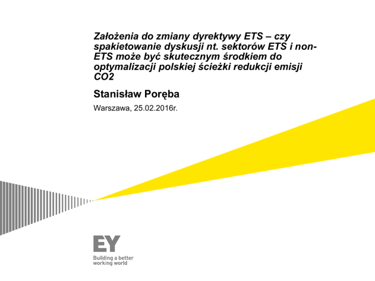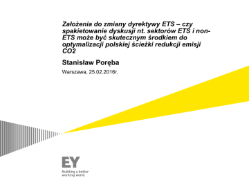 Założenia do zmiany dyrektywy ETS – czy spakietowanie dyskusji nt. sektorów ETS i nonETS może być skutecznym środkiem do optymalizacji polskiej ścieżki redukcji emisji CO2 Stanisław Poręba Warszawa, 25.02.2016r. Zakres udziału w dyskusji ► ► ► ► ► Optymalizacja redukcji emisji CO2 w sektorze wytwarzania energii elektrycznej i ciepła. Koszty redukcji emisji CO2 w sektorze wytwarzania energii elektrycznej i ciepła. Możliwość skorzystania z derogacji; wpływ na ceny energii elektrycznej, rozwój inwestycji. Projekt funkcjonowania i zarządzania Funduszem Modernizacyjnym. Czy możliwa jest wspólna dyskusja i dążenie do „spakietowania” ustaleń dla ETS i non-ETS i czy może się to przyczynić do utrzymania konkurencyjności polskiej gospodarki? Strona 2 Optymalizacja redukcji GHG w Polsce do 2030 z perspektywą 2050 Strona 3 Prognozy 2030 i perspektywa 2050 ► ► ► ► Unia Europejska zamierza zredukować emisję GHG do 2050 roku o 80% w stosunku do 1990 roku, a w sektorze energii niemal o 100%. EY na zlecenie PKEE i innych stowarzyszeń sektorowych opracował materiały związane z mechanizmami kompensacyjnymi osiągania celów polityki klimatycznej UE na 2030 rok. Prognozy zapotrzebowania i struktury wytwarzania do 2030 roku opracowano bardziej szczegółowo dla scenariuszy redukcji GHG w sektorze energetycznym na poziomie15, 20, 30, 40, 45 i 50%. Dla poszczególnych scenariuszy opracowano struktury produkcji, mocy, zakresu inwestycji i nakładów oraz kosztów energii. Na podstawie analiz rekomendowano scenariusz 30%. Strona 4 Koszty wytwarzania energii elektrycznej w 2030 roku ► Cena uprawnień do emisji CO2 równa 30 EUR/EUA [PLN/MWh] 450 386 400 350 138 300 250 42 200 150 135 100 50 70 0 Redukcja 15% 394 388 401 409 412 155 162 194 210 225 45 48 53 55 56 110 104 100 128 123 65 55 44 40 32 Redukcja 20% Redukcja 30% Redukcja 40% Redukcja 45% Redukcja 50% Koszty uprawnień do emisji CO2 [PLN/MWh] Koszty zmienne [PLN/MWh] Koszty stałe operacyjne [PLN/MWh] Koszty kapitałowe [PLN/MWh] Redukcja o 30% umożliwia uzyskanie ambitnego celu redukcji CO2 przy racjonalnym wzroście kosztów wytwarzania energii elektrycznej. Strona 5 Struktura produkcji energii elektrycznej w 2030 roku 100% 90% 80% 70% 60% 50% 40% 30% 20% 10% 0% 11% 26% 11% 11% 11% 37% 41% 45% 31% 28% 11% 11% 19% 19% 11% 13% 19% 19% 45% 40% Redukcja 15% Redukcja 20% Węgiel kamienny Węgiel brunatny 14% 18% 15% 20% 16% 15% Redukcja 40% Redukcja 45% Redukcja 50% Gaz Energia jądrowa 31% Redukcja 30% 14% OZE ► Redukcje o 15% i 20% są możliwe do zrealizowania przy różnych strukturach paliwowo-technologicznych, jednak szanse ich wynegocjowania z Komisją Europejską są niewielkie. ► Redukcja o 30% stawia ambitne zadania w zakresie zmian struktury paliwowotechnologicznej, lecz umożliwia utrzymanie ewolucyjnego charakteru przemian. ► Redukcja o 40% i więcej wymagają rewolucyjnych zmian struktury paliwowotechnologicznej. Strona 6 Struktura mocy zainstalowanej w 2030 roku [MW] 90 000 79 310 80 000 73 799 70 000 60 000 50 000 40 000 30 000 63 786 57 466 62 092 18 570 21 570 24 300 13 120 12 200 12 040 11 180 17 110 19 900 22 440 8 840 12 340 2 600 12 340 2 600 12 340 2 600 3 200 12 340 2 600 3 200 12 340 2 600 3 200 12 340 2 600 3 200 24 006 23 686 20 572 19 979 19 700 19 446 9 680 20 000 10 000 84 326 0 Redukcja 15% Redukcja 20% Redukcja 30% Elektrownie Energia jądrowa Hydro Redukcja 40% Redukcja 45% Redukcja 50% CHP OZE - Wiatr OZE - PV ► Redukcja o 30% możliwa jest do zrealizowania przy wykorzystaniu zróżnicowanej struktury mocy zainstalowanej. ► Redukcja o 40% i więcej wymaga bardzo dużego udziału OZE w strukturze mocy zainstalowanej, przy jednoczesnym utrzymaniu mocy węglowych pracujących przy bardzo niskim czasie wykorzystania. Strona 7 Nakłady inwestycyjne w poszczególnych scenariuszach redukcji emisji CO2 [mld PLN] 450 395 400 361 321 350 300 201 200 48 158 232 150 100 121 50 23 15 Redukcja 15% 0 48 48 238 250 48 164 153 22 15 Redukcja 20% 23 15 Redukcja 30% Węgiel kamienny Gaz 26 15 Redukcja 40% OZE 304 270 28 15 Redukcja 45% 28 15 Redukcja 50% Energia jądrowa ► Przy wszystkich celach redukcyjnych zdecydowana większość nakładów inwestycyjnych przeznaczona jest na nowe moce wytwórcze w technologiach OZE. ► Redukcje powyżej 30% jest bardzo trudno uzyskać bez energetyki jądrowej. Strona 8 Nakłady inwestycyjne w scenariuszu redukcji 30% [mld PLN] 48 250 200 70 4 238 10 150 52 100 50 10 5 21 2 10 6 0 WK WK Gaz Gaz OZE - OZE - OZE - OZE - PV OZE CHP CCS/CSU CHP Pozostałe Biomasa - Biomasa - Wiatr Hydro CHP Poz. OZE Mikro Energia Łącznie jądrowa ► Około połowa nakładów powinna być przeznaczona na rozwój elektrowni wiatrowych i fotowoltaicznych, część z nich może być zastąpiona technologiami biomasowymi, jeżeli Polska postawi na uprawy energetyczne. ► Rekomendowany cel redukcyjny umożliwia minimalizację kosztów wytwarzania energii elektrycznej przy zachowaniu ambitnego celu redukcyjnego. Strona 9 Analizy perspektywy 2050 Produkcja energii elektrycznej dla niskiego zapotrzebowania i scenariusza 50% [TWh] ESP Energia jądrowa OZE - Mikro OZE - Hydro OZE - PV OZE - Wiatr OZE - Biomasa - współspalanie OZE - Biomasa/Biogaz Gaz - Pozostałe Gaz - CHP WB WK - CCS/CSU WK - Kondensacja WK - CHP 200 150 100 50 0 2015 2020 2025 2030 2035 2040 2045 2050 Produkcja energii elektrycznej dla niskiego zapotrzebowania i scenariusza 80% [TWh] ESP Energia jądrowa OZE - Mikro OZE - Hydro OZE - PV kOZE - Wiatr OZE - Biomasa - współspalanie OZE - Biomasa/Biogaz Gaz - Pozostałe Gaz - CHP WB WK - CCS/CSU WK - Kondensacja WK - CHP 200 150 100 50 0 2015 Strona 10 2020 2025 2030 2035 2040 2045 2050 Możliwość skorzystania z derogacji Strona 11 Funkcjonowanie derogacji jako mechanizmu kompensacyjnego ► ► ► ► Derogacje CO2 to bezpłatne przekazanie wytwórcom energii elektrycznej części uprawnień z krajowej puli przeznaczonej do sprzedaży po