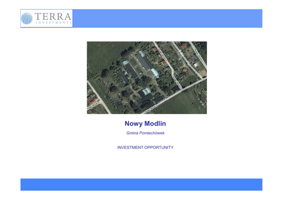 Nowy Modlin Gmina Pomiechówek INVESTMENT OPPORTUNITY Nowy Modling – Plot for Sale STRESZCZENIE EXECUTIVE SUMMARY • Do sprzedaży • For sale • 7,39 ha teren inwestycyjny • 7,39 ha Investment Plot • Częściowo zabudowany – do ew. wyburzeń • Plot with some old buildings to be removed • W bliskiej odległości od przyszłego lotniska Modlin • Close proximity to the future Modlin Airport • Dogodna komunikacja • Good communication • Studium przewiduje działalność usługowo produkcyjną • Studium to Zoning plan – logistic light production • Użytkowanie Wieczyste • Perpetual Usefruct Nowy Modlin – Plot for Sale Podstawowe Informacje General Information Nieruchomość zlokalizowana jest w miejscowości Nowy Modlin na terenie gminy Pomiechówek w bliskiej odległości od planowanego lotniska cywilnego – Modlin, 5 km od Nowego Dworu Mazowieckiego oraz ok. 25 km na północ od Warszawy. The plot is situated in Nowy Modlin in Pomiechówek borough in close proximity to planned Modlin Airport, approximately 5 km from Nowy Dwór Mazowiecki, and 25 km to the north of Warsaw Dnia 8 lutego 2010 Prezes Urzędu Lotnictwa Cywilnego wydał Decyzje o wpisaniu lotniska Warszawa/Modlin do rejestru lotnisk cywilnych pod numerem 60 jako lotnisko cywilne o kodzie 4c, z drogą startową o nawierzchni sztucznej dla samolotów i śmigłowców. Gminę Pomiechówek zamieszkuje około 17 tysięcy osób.. Gminę Nowy Dwór Mazowiecki zamieszkuje ponad 27.500 osób. Nieruchomość znajduje się ok. 1 km na wschód od Nowego Dworu Mazowieckiego Nowy Dwór Mazowiecki posiada rozwinięty przemysł chemiczny, a także przemysł lekki, spożywczy, elektro – maszynowy, drzewny oraz wytwórnie artykułów szkolno – biurowych, opakowań, materiałów budowlanych, składy budowlane, przedsiębiorstwa produkcji sprzętu wędkarskiego, zakłady poligraficzne; hurtownie i agencje celne. Nowy Dwór Mazowiecki jest ważnym węzłem komunikacyjnym i leży przy trasie Warszawa-Gdańsk. Przez miejscowość przebiega również ważna droga transportowa nr 62 łącząca drogę krajową nr 7 z przejściem granicznym Brześć, stanowiąc dogodny objazd Warszawy w kierunku wschodnim. On February 8th 2010 The President of the Civil Aviation Office issued a resolution about inscribing the Warszawa/Modlin airport to the register of civil airports under the number of 60 as a civil airport with code 4c, with an airstrip made of artificial pavement for airplanes and helicopters. Pomiechówek borough has a population of around 17 000. Nowy Dwór Mazowiecki borough `s population is over 27.500. The plot is located around 1 km east to the Nowy Dwór Mazowiecki. Nowy Dwór Mazowiecki has a well developed chemical industry along with light industry, food industry, electronic and machine building industry, timber industry and manufactures of stationery goods, packaging, building materials and warehouses, manufacturers of fishing tackles, printing industry; wholesales and customs. Nowy Dwór Mazowiecki is an important communication point and is situated at expressway Warszawa-Gdańsk. There is also a very important transport route that crosses the city and its the route no. 62 that connects national road no. 7 with Brześć frontier crossing, which is a very convenient way for detouring Warsaw heading east. Lokalizacja Nowy Modlin Plots Location Plots Location Plot 87/38 Airport Przedmiotem sprzedaży są dwie nieruchomości gruntowe częściowo zabudowane położone w Nowym Modlinie o łącznej powierzchni 7,39 ha • Działka nr 87/60 o powierzchni 41 761 m2 • Działka nr 87/38 o powierzchni 32 146 m2 Stan prawny: Użytkowanie wieczyste Miejscowy Plan nie obowiązuje. Studium Uwarunkowań przewiduje na w/w nieruchomości działalność produkcyjno usługową Subject of sell are two plots with old buildings to be removed located in Nowy Modlin - combined area 7,39 ha • Plot no. 87/60 area 41 761 m2 • Plot no. 87/38 area 32 146 m2 Legal Status: Perpetual usefruct till 2090 Zoning Plan has expired. Studium to Zoning Plan permits logistic-production function for both plots Plot 87/60 More information: Dodatkowe informacje : Please do not hesitate to contact: Proszę o kontakt: Bogusław Woźniak Tel: +48 22 856 8392 Tel: +48 606 277 670 [email protected] This document (the “Presentation") contains information relating to presented Project . The information contained herein is not comprehensive and has been prepared to provide the recipient of this Presentation with some basic knowledge about the presented Project. This Presentation does not purport to contain all of the information that a recipient hereof may desire or require in considering any investment in the Project. In all cases, the recipient of this Presentation should conduct its own investigation and analysis of the Project to arrive at a potential investment decision. Terra Investments („Terra”) do not assume any responsibility for the correctness or independent verification of any of the information contained herein nor do they assume any responsibility for potential damages resulting from any incorrectness or incompleteness of information. Terra do not make any representation or warranty, express or implied, as to the accuracy, completeness or reliability of this Presentation, and shall have no liability for errors contained in, or omissions from, this Presentation or otherwise. In furnishing the Presentation, Terra reserves the right to amend or replace this Presentation at any time; however, Terra shall be under no obligation to update, amend or correct the information contained in this Presentation, or to provide any additional information. This Presentation does not constitute an investment recommendation regarding the Project and has not been prepared with the intention of offering, or inviting the public or any persons or entities to acquire this Project. This Presentation is not available for general distribution. This Presentatio