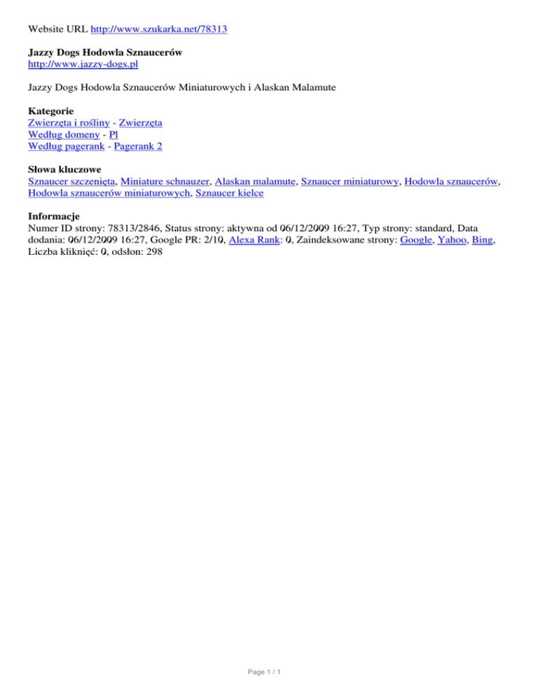 Website URL http://www.szukarka.net/78313 Jazzy Dogs Hodowla Sznaucerów http://www.jazzy-dogs.pl Jazzy Dogs Hodowla Sznaucerów Miniaturowych i Alaskan Malamute Kategorie Zwierzęta i rośliny - Zwierzęta Według domeny - Pl Według pagerank - Pagerank 2 Słowa kluczowe Sznaucer szczenięta, Miniature schnauzer, Alaskan malamute, Sznaucer miniaturowy, Hodowla sznaucerów, Hodowla sznaucerów miniaturowych, Sznaucer kielce Informacje Numer ID strony: 78313/2846, Status strony: aktywna od 06/12/2009 16:27, Typ strony: standard, Data dodania: 06/12/2009 16:27, Google PR: 2/10, Alexa Rank: 0, Zaindeksowane strony: Google, Yahoo, Bing, Liczba kliknięć: 0, odsłon: 298 Page 1 / 1