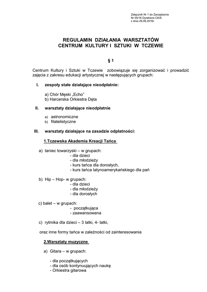 regulamin działania warsztatów centrum kultury i sztuki w tczewie