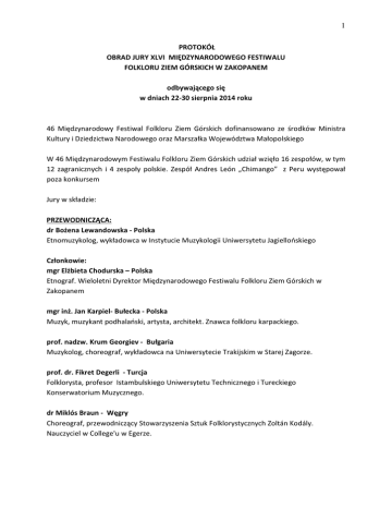 1 PROTOKÓŁ OBRAD JURY XLVI MIĘDZYNARODOWEGO FESTIWALU FOLKLORU ZIEM GÓRSKICH W ZAKOPANEM odbywającego się w dniach 22-30 sierpnia 2014 roku 46 Międzynarodowy Festiwal Folkloru Ziem Górskich dofinansowano ze środków Ministra Kultury i Dziedzictwa Narodowego oraz Marszałka Województwa Małopolskiego W 46 Międzynarodowym Festiwalu Folkloru Ziem Górskich udział wzięło 16 zespołów, w tym 12 zagranicznych i 4 zespoły polskie. Zespół Andres León „Chimango” z Peru występował poza konkursem Jury w składzie: PRZEWODNICZĄCA: dr Bożena Lewandowska - Polska Etnomuzykolog, wykładowca w Instytucie Muzykologii Uniwersytetu Jagiellońskiego Członkowie: mgr Elżbieta Chodurska – Polska Etnograf. Wieloletni Dyrektor Międzynarodowego Festiwalu Folkloru Ziem Górskich w Zakopanem mgr inż. Jan Karpiel- Bułecka - Polska Muzyk, muzykant podhalański, artysta, architekt. Znawca folkloru karpackiego. prof. nadzw. Krum Georgiev - Bułgaria Muzykolog, choreograf, wykładowca na Uniwersytecie Trakijskim w Starej Zagorze. prof. dr. Fikret Degerli - Turcja Folklorysta, profesor Istambulskiego Uniwersytetu Technicznego i Tureckiego Konserwatorium Muzycznego. dr Miklós Braun - Węgry Choreograf, przewodniczący Stowarzyszenia Sztuk Folklorystycznych Zoltán Kodály. Nauczyciel w College'u w Egerze. 2 dr Mircea Cimpeanu – Rumunia Badacz folkloru, regionalista związany z Wojewódzkim Centrum Kultury Cluj- Napoca mgr Jean Roche - Francja Folklorysta, ekspert do spraw UNESCO, dyrektor festiwalu folklorystycznego w Gannat we Francji mgr Jozef Burić – Słowacja Folklorysta, dyrektor Stowarzyszenia Teatralnego Folkloru Narodowego Centrum Kultury na Słowacji mgr Rafael Romero Cardenas - Hiszpania Regionalista, dyrektor festiwalu folklorystycznego w Ciudad Real. Sekretarz Jury mgr Joanna Staszak- Naczelnik Wydziału Kultury i Popularyzacji Zakopanego oceniało następujące zespoły zgłoszone do konkursu, wymienione według kolejności zaprezentowanego programu: Zespoły zagraniczne: Miejski Zespół Dziecięco-Młodzieżowy z Tuzli - Bośnia i Hercegowina Zespół ludowy "Bistritsa" - Bułgaria Klub kulturalny "Salona" - Chorwacja Zespół folklorystyczny "Crvena Stijena" - Czarnogóra Grupa "La Maiade Malemortine" - Francja Zespół Pieśni i Tańca "Villa de Leganes" - Hiszpania Grupa Tańca Ludowego "Kopice" - Rumunia Grupa folklorystyczna "Prvi Partizan" - Serbia Zespół ludowy "Vah" - Słowacja Zespół przy Fundacji na Rzecz Praktyki Tańca Ludowego i Edukacji "MOTIF" - Turcja Zespół ludowy "A Lanterna" - Włochy Zespoły polskie: Zespół "Białcanie" - Polska Regionalny Zespół Pieśni i Tańca „Lachy” - Polska Zespół "Lipniczanie" - Polska Zespół Pieśni i Tańca "Wierchy" - Polska 3 Jury oceniło zespoły uczestniczące w Festiwalu w następujących kategoriach: I kategoria- zespoły prezentujące folklor w formie tradycyjnej II kategoria – zespoły prezentujące folklor w formie artystycznie opracowanej III kategoria – zespoły prezentujące folklor w formie stylizowanej Wymieniając zespoły według kolejności występowania, Jury zaliczyło: Do kategorii I: Zespół ludowy "Bistritsa" - Bułgaria Zespół Pieśni i Tańca "Wierchy" - Polska Zespół "Białcanie" – Polska Zespół "Lipniczanie" - Polska Grupa Tańca Ludowego "Kopice" - Rumunia Do kategorii II : Zespół ludowy "Vah" - Słowacja Regionalny Zespół Pieśni i Tańca „Lachy” - Polska Grupa "La Maiade Malemortine" - Francja Zespół Pieśni i Tańca "Villa de Leganes" - Hiszpania Do kategorii III: Miejski Zespół Dziecięco-Młodzieżowy z Tuzli - Bośnia i Hercegowina Zespół ludowy "A Lanterna" - Włochy Klub kulturalny "Salona" - Chorwacja Zespół przy Fundacji na Rzecz Praktyki Tańca Ludowego i Edukacji "MOTIF" - Turcja Zespół folklorystyczny "Crvena Stijena" - Czarnogóra Grupa folklorystyczna "Prvi Partizan" - Serbia Jury postanowiło zmienić zgłoszoną kategorię następujących zespołów: Miejski Zespół Dziecięco-Młodzieżowy z Tuzli - Bośnia i Hercegowina - zmiana kategorii z II na III Uzasadnienie: Prezentowane tańce pochodziły z różnych regionów kraju i przedstawiały wyższy stopień stylizacji Klub kulturalny "Salona" - Chorwacja – zmiana kategorii z II na III Uzasadnienie: Prezentowane tańce pochodziły z różnych regionów kraju i przedstawiały wyższy stopień stylizacji Zespół folklorystyczny "Crvena Stijena" - Czarnogóra – zmiana kategorii z II na III Uzasadnienie: Prezentowane tańce pochodziły z różnych regionów kraju i przedstawiały wyższy stopień stylizacji Zespół ludowy "A Lanterna" - Włochy - przed wejściem na scenę zgłosił zmianę kategorii z I na III, w stosunku do informacji opublikowanej w folderze Festiwalowym 4 Program każdego zespołu uczestniczącego w konkursie był przedmiotem bardzo wnikliwej analizy Jury. Doceniając wartości etnograficzne i wysoki poziom artystyczny, Jury postanowiło przyznać następujące nagrody: ZŁOTE CIUPAGI oraz nagroda pieniężna w wysokości 5.000 PLN W kategorii zespołów prezentujących folklor w formie tradycyjnej Zespół "Białcanie" – Polska W kategorii zespołów prezentujących folklor w formie artystycznie opracowanej: Zespół ludowy "Vah" - Słowacja W kategorii zespołów prezentujących folklor w formie stylizowanej Zespół przy Fundacji na Rzecz Praktyki Tańca Ludowego i Edukacji "MOTIF" – Turcja SREBRNE CIUPAGI: W kategorii zespołów prezentujących folklor w formie tradycyjnej Zespół ludowy "Bistritsa" - Bułgaria W kategorii zespołów prezentujących folklor w formie artystycznie opracowanej: Grupa "La Maiade Malemortine" - Francja W kategorii zespołów prezentujących folklor w formie stylizowanej Grupa folklorystyczna "Prvi Partizan" - Serbia 5 BRĄZOWE CIUPAGI: W kategorii zespołów prezentujących folklor w formie tradycyjnej: Grupa Tańca Ludowego "Kopice" - Rumunia W kategorii zespołów prezentujących folklor w formie artystycznie opracowa