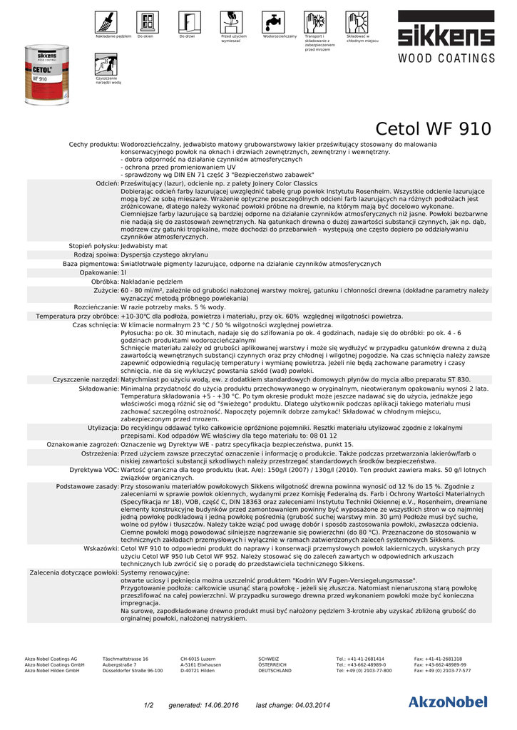 Nakładanie pędzlem Do okien Do drzwi Przed użyciem wymieszać Wodorozcieńczalny Transport i składowanie z zabezpieczeniem przed mrozem Składować w chłodnym miejscu Czyszczenie narzędzi wodą Cetol WF 910 Cechy produktu: Wodorozcieńczalny, jedwabisto matowy grubowarstwowy lakier prześwitujący stosowany do malowania konserwacyjnego powłok na oknach i drzwiach zewnętrznych, zewnętrzny i wewnętrzny. - dobra odporność na działanie czynników atmosferycznych - ochrona przed promieniowaniem UV - sprawdzony wg DIN EN 71 część 3 "Bezpieczeństwo zabawek" Odcień: Prześwitujący (lazur), odcienie np. z palety Joinery Color Classics Dobierając odcień farby lazurującej uwzględnić tabelę grup powłok Instytutu Rosenheim. Wszystkie odcienie lazurujące mogą być ze sobą mieszane. Wrażenie optyczne poszczególnych odcieni farb lazurujących na różnych podłożach jest zróżnicowane, dlatego należy wykonać powłoki próbne na drewnie, na którym mają być docelowo wykonane. Ciemniejsze farby lazurujące są bardziej odporne na działanie czynników atmosferycznych niż jasne. Powłoki bezbarwne nie nadają się do zastosowań zewnętrznych. Na gatunkach drewna o dużej zawartości substancji czynnych, jak np. dąb, modrzew czy gatunki tropikalne, może dochodzi do przebarwień - występują one często dopiero po oddziaływaniu czynników atmosferycznych. Stopień połysku: Jedwabisty mat Rodzaj spoiwa: Dyspersja czystego akrylanu Baza pigmentowa: Światłotrwałe pigmenty lazurujące, odporne na działanie czynników atmosferycznych Opakowanie: 1l Obróbka: Nakładanie pędzlem Zużycie: 60 - 80 ml/m², zależnie od grubości nałożonej warstwy mokrej, gatunku i chłonności drewna (dokładne parametry należy wyznaczyć metodą próbnego powlekania) Rozcieńczanie: W razie potrzeby maks. 5 % wody. Temperatura przy obróbce: +10-30℃ dla podłoża, powietrza i materiału, przy ok. 60% względnej wilgotności powietrza. Czas schnięcia: W klimacie normalnym 23 °C / 50 % wilgotności względnej powietrza. Pyłosucha: po ok. 30 minutach, nadaje się do szlifowania po ok. 4 godzinach, nadaje się do obróbki: po ok. 4 - 6 godzinach produktami wodorozcieńczalnymi Schnięcie materiału zależy od grubości aplikowanej warstwy i może się wydłużyć w przypadku gatunków drewna z dużą zawartością wewnętrznych substancji czynnych oraz przy chłodnej i wilgotnej pogodzie. Na czas schnięcia należy zawsze zapewnić odpowiednią regulację temperatury i wymianę powietrza. Jeżeli nie będą zachowane parametry i czasy schnięcia, nie da się wykluczyć powstania szkód (wad) powłoki. Czyszczenie narzędzi: Natychmiast po użyciu wodą, ew. z dodatkiem standardowych domowych płynów do mycia albo preparatu ST 830. Składowanie: Minimalna przydatność do użycia produktu przechowywanego w oryginalnym, nieotwieranym opakowaniu wynosi 2 lata. Temperatura składowania +5 - +30 °C. Po tym okresie produkt może jeszcze nadawać się do użycia, jednakże jego właściwości mogą różnić się od "świeżego" produktu. Dlatego użytkownik podczas aplikacji takiego materiału musi zachować szczególną ostrożność. Napoczęty pojemnik dobrze zamykać! Składować w chłodnym miejscu, zabezpieczonym przed mrozem. Utylizacja: Do recyklingu oddawać tylko całkowicie opróżnione pojemniki. Resztki materiału utylizować zgodnie z lokalnymi przepisami. Kod odpadów WE właściwy dla tego materiału to: 08 01 12 Oznakowanie zagrożeń: Oznaczenie wg Dyrektyw WE - patrz specyfikacja bezpieczeństwa, punkt 15. Ostrzeżenia: Przed użyciem zawsze przeczytać oznaczenie i informację o produkcie. Także podczas przetwarzania lakierów/farb o niskiej zawartości substancji szkodliwych należy przestrzegać standardowych środków bezpieczeństwa. Dyrektywa VOC: Wartość graniczna dla tego produktu (kat. A/e): 150g/l (2007) / 130g/l (2010). Ten produkt zawiera maks. 50 g/l lotnych związków organicznych. Podstawowe zasady: Przy stosowaniu materiałów powłokowych Sikkens wilgotność drewna powinna wynosić od 12 % do 15 %. Zgodnie z zaleceniami w sprawie powłok okiennych, wydanymi przez Komisję Federalną ds. Farb i Ochrony Wartości Materialnych (Specyfikacja nr 18), VOB, część C, DIN 18363 oraz zaleceniami Instytutu Techniki Okiennej e.V., Rosenheim, drewniane elementy konstrukcyjne budynków przed zamontowaniem powinny być wyposażone ze wszystkich stron w co najmniej jedną powłokę podkładową i jedną powłokę pośrednią (grubość suchej warstwy min. 30 µm) Podłoże musi być suche, wolne od pyłów i tłuszczów. Należy także wziąć pod uwagę dobór i sposób zastosowania powłoki, zwłaszcza odcienia. Ciemne powłoki mogą powodować silniejsze nagrzewanie się powierzchni (do 80 °C). Przeznaczone do stosowania w technicznych zakładach przemysłowych i wyłącznie w ramach zatwierdzonych zaleceń systemowych Sikkens. Wskazówki: Cetol WF 910 to odpowiedni produkt do naprawy i konserwacji przemysłowych powłok lakierniczych, uzyskanych przy użyciu Cetol WF 950 lub Cetol WF 952. Należy stosować się do zaleceń zawartych w odpowiednich arkuszach technicznych lub zwrócić się o poradę do przedstawiciela technicznego Sikkens. Zalecenia dotyczące powłoki: Systemy renowacyjne: otwarte uciosy i pęknięcia można uszczelnić produktem "Kodrin WV Fugen-Versiegelungsmasse". Przygotowanie podłoża: całkowicie usunąć starą powłokę - jeżeli się złuszcza. Natomiast nienaruszoną starą powłokę przeszlifować na całej powierzchni. W przypadku surowego drewna przed wykonaniem powłoki może być konieczna impregnacja. Na surowe, zapodkładowane drewno produkt musi być nałożony pędzlem 3-krotnie aby uzyskać zbliżoną grubość do orginalnej powłoki, nalożonej natryskiem. Akzo Nobel Coatings AG Akzo Nobel Coatings GmbH Akzo Nobel Hilden GmbH Täschmattstrasse 16 Aubergstraße 7 Düsseldorfer Straße 96-100 1/2 CH-6015 Luzern A-51