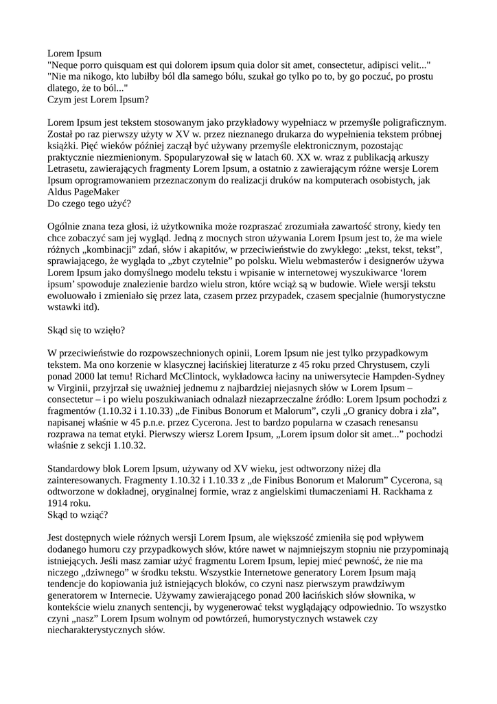Lorem Ipsum "Neque porro quisquam est qui dolorem ipsum quia dolor sit amet, consectetur, adipisci velit..." "Nie ma nikogo, kto lubiłby ból dla samego bólu, szukał go tylko po to, by go poczuć, po prostu dlatego, że to ból..." Czym jest Lorem Ipsum? Lorem Ipsum jest tekstem stosowanym jako przykładowy wypełniacz w przemyśle poligraficznym. Został po raz pierwszy użyty w XV w. przez nieznanego drukarza do wypełnienia tekstem próbnej książki. Pięć wieków później zaczął być używany przemyśle elektronicznym, pozostając praktycznie niezmienionym. Spopularyzował się w latach 60. XX w. wraz z publikacją arkuszy Letrasetu, zawierających fragmenty Lorem Ipsum, a ostatnio z zawierającym różne wersje Lorem Ipsum oprogramowaniem przeznaczonym do realizacji druków na komputerach osobistych, jak Aldus PageMaker Do czego tego użyć? Ogólnie znana teza głosi, iż użytkownika może rozpraszać zrozumiała zawartość strony, kiedy ten chce zobaczyć sam jej wygląd. Jedną z mocnych stron używania Lorem Ipsum jest to, że ma wiele różnych „kombinacji” zdań, słów i akapitów, w przeciwieństwie do zwykłego: „tekst, tekst, tekst”, sprawiającego, że wygląda to „zbyt czytelnie” po polsku. Wielu webmasterów i designerów używa Lorem Ipsum jako domyślnego modelu tekstu i wpisanie w internetowej wyszukiwarce ‘lorem ipsum’ spowoduje znalezienie bardzo wielu stron, które wciąż są w budowie. Wiele wersji tekstu ewoluowało i zmieniało się przez lata, czasem przez przypadek, czasem specjalnie (humorystyczne wstawki itd). Skąd się to wzięło? W przeciwieństwie do rozpowszechnionych opinii, Lorem Ipsum nie jest tylko przypadkowym tekstem. Ma ono korzenie w klasycznej łacińskiej literaturze z 45 roku przed Chrystusem, czyli ponad 2000 lat temu! Richard McClintock, wykładowca łaciny na uniwersytecie Hampden-Sydney w Virginii, przyjrzał się uważniej jednemu z najbardziej niejasnych słów w Lorem Ipsum – consectetur – i po wielu poszukiwaniach odnalazł niezaprzeczalne źródło: Lorem Ipsum pochodzi z fragmentów (1.10.32 i 1.10.33) „de Finibus Bonorum et Malorum”, czyli „O granicy dobra i zła”, napisanej właśnie w 45 p.n.e. przez Cycerona. Jest to bardzo popularna w czasach renesansu rozprawa na temat etyki. Pierwszy wiersz Lorem Ipsum, „Lorem ipsum dolor sit amet...” pochodzi właśnie z sekcji 1.10.32. Standardowy blok Lorem Ipsum, używany od XV wieku, jest odtworzony niżej dla zainteresowanych. Fragmenty 1.10.32 i 1.10.33 z „de Finibus Bonorum et Malorum” Cycerona, są odtworzone w dokładnej, oryginalnej formie, wraz z angielskimi tłumaczeniami H. Rackhama z 1914 roku. Skąd to wziąć? Jest dostępnych wiele różnych wersji Lorem Ipsum, ale większość zmieniła się pod wpływem dodanego humoru czy przypadkowych słów, które nawet w najmniejszym stopniu nie przypominają istniejących. Jeśli masz zamiar użyć fragmentu Lorem Ipsum, lepiej mieć pewność, że nie ma niczego „dziwnego” w środku tekstu. Wszystkie Internetowe generatory Lorem Ipsum mają tendencje do kopiowania już istniejących bloków, co czyni nasz pierwszym prawdziwym generatorem w Internecie. Używamy zawierającego ponad 200 łacińskich słów słownika, w kontekście wielu znanych sentencji, by wygenerować tekst wyglądający odpowiednio. To wszystko czyni „nasz” Lorem Ipsum wolnym od powtórzeń, humorystycznych wstawek czy niecharakterystycznych słów. Tłumaczenia: Jeśli możesz pomóc w tłumaczeniu strony na obce języki, prosimy, skontaktuj się z nami drogą mailową. Tutaj możesz zobaczyć zestaw bannerów w trzech kolorach i kilku standardowych rozmiarach: BannersBannersBanners Datki: Jeśli często odwiedzasz tę stronę i chciałbyś ją wspomóc, prosimy, zastanów się nad niewielkim datkiem na rzecz płacenia za hosting i transfer. Nie ma żadnej „sumy minimalnej”, każda pomoc jest mile widziana - kliknij tutaj, aby dotować za pomocą PayPal’a. Dziękujemy! Chrome Firefox Add-on NodeJS TeX Package Python Interface GTK Lipsum Rails .NET Groovy Adobe Plugin Standardowy fragment Lorem Ipsum, używany od XV w. "Lorem ipsum dolor sit amet, consectetur adipiscing elit, sed do eiusmod tempor incididunt ut labore et dolore magna aliqua. Ut enim ad minim veniam, quis nostrud exercitation ullamco laboris nisi ut aliquip ex ea commodo consequat. Duis aute irure dolor in reprehenderit in voluptate velit esse cillum dolore eu fugiat nulla pariatur. Excepteur sint occaecat cupidatat non proident, sunt in culpa qui officia deserunt mollit anim id est laborum." Fragment 1.10.32 z "de Finibus Bonorum et Malorum", napisanej przez Cycerona w 45 r.p.n.e. "Sed ut perspiciatis unde omnis iste natus error sit voluptatem accusantium doloremque laudantium, totam rem aperiam, eaque ipsa quae ab illo inventore veritatis et quasi architecto beatae vitae dicta sunt explicabo. Nemo enim ipsam voluptatem quia voluptas sit aspernatur aut odit aut fugit, sed quia consequuntur magni dolores eos qui ratione voluptatem sequi nesciunt. Neque porro quisquam est, qui dolorem ipsum quia dolor sit amet, consectetur, adipisci velit, sed quia non numquam eius modi tempora incidunt ut labore et dolore magnam aliquam quaerat voluptatem. Ut enim ad minima veniam, quis nostrum exercitationem ullam corporis suscipit laboriosam, nisi ut aliquid ex ea commodi consequatur? Quis autem vel eum iure reprehenderit qui in ea voluptate velit esse quam nihil molestiae consequatur, vel illum qui dolorem eum fugiat quo voluptas nulla pariatur?" Tłumaczenie H. Rackhama z 1914 roku "But I must explain to you how all this mistaken idea of denouncing pleasure and praising pain was born and I will give you a complete account of the system, and expound the actual teachings of the great explorer of the truth, the master-builder of human happiness. No one rejects, dislikes, or avoids pleasure itself, because it is pleasure, but because those who do not kn