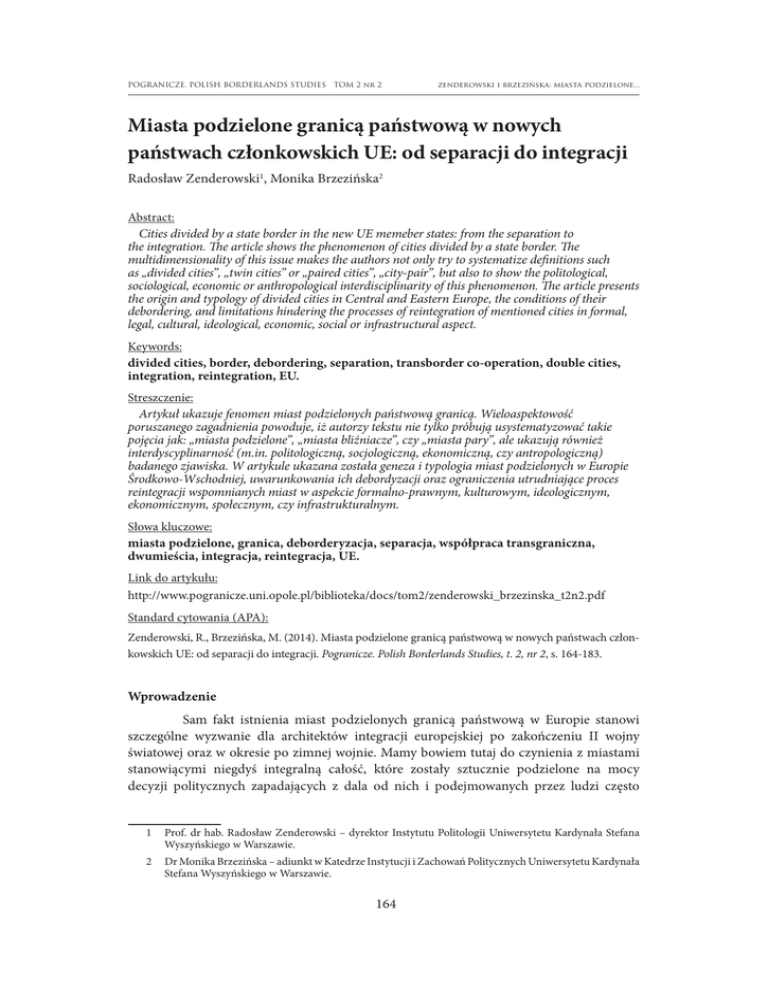 POGRANICZE. POLISH BORDERLANDS STUDIES TOM 2 nr 2 zenderowski i brzezińska: miasta podzielone... Miasta podzielone granicą państwową w nowych państwach członkowskich UE: od separacji do integracji Radosław Zenderowski1, Monika Brzezińska2 Abstract: Cities divided by a state border in the new UE memeber states: from the separation to the integration. The article shows the phenomenon of cities divided by a state border. The multidimensionality of this issue makes the authors not only try to systematize definitions such as „divided cities”, „twin cities” or „paired cities”, „city-pair”, but also to show the politological, sociological, economic or anthropological interdisciplinarity of this phenomenon. The article presents the origin and typology of divided cities in Central and Eastern Europe, the conditions of their debordering, and limitations hindering the processes of reintegration of mentioned cities in formal, legal, cultural, ideological, economic, social or infrastructural aspect. Keywords: divided cities, border, debordering, separation, transborder co-operation, double cities, integration, reintegration, EU. Streszczenie: Artykuł ukazuje fenomen miast podzielonych państwową granicą. Wieloaspektowość poruszanego zagadnienia powoduje, iż autorzy tekstu nie tylko próbują usystematyzować takie pojęcia jak: „miasta podzielone”, „miasta bliźniacze”, czy „miasta pary”, ale ukazują również interdyscyplinarność (m.in. politologiczną, socjologiczną, ekonomiczną, czy antropologiczną) badanego zjawiska. W artykule ukazana została geneza i typologia miast podzielonych w Europie Środkowo-Wschodniej, uwarunkowania ich debordyzacji oraz ograniczenia utrudniające proces reintegracji wspomnianych miast w aspekcie formalno-prawnym, kulturowym, ideologicznym, ekonomicznym, społecznym, czy infrastrukturalnym. Słowa kluczowe: miasta podzielone, granica, deborderyzacja, separacja, współpraca transgraniczna, dwumieścia, integracja, reintegracja, UE. Link do artykułu: http://www.pogranicze.uni.opole.pl/biblioteka/docs/tom2/zenderowski_brzezinska_t2n2.pdf Standard cytowania (APA): Zenderowski, R., Brzezińska, M. (2014). Miasta podzielone granicą państwową w nowych państwach członkowskich UE: od separacji do integracji. Pogranicze. Polish Borderlands Studies, t. 2, nr 2, s. 164-183. Wprowadzenie Sam fakt istnienia miast podzielonych granicą państwową w Europie stanowi szczególne wyzwanie dla architektów integracji europejskiej po zakończeniu II wojny światowej oraz w okresie po zimnej wojnie. Mamy bowiem tutaj do czynienia z miastami stanowiącymi niegdyś integralną całość, które zostały sztucznie podzielone na mocy decyzji politycznych zapadających z dala od nich i podejmowanych przez ludzi często 1 Prof. dr hab. Radosław Zenderowski – dyrektor Instytutu Politologii Uniwersytetu Kardynała Stefana Wyszyńskiego w Warszawie. 2 Dr Monika Brzezińska – adiunkt w Katedrze Instytucji i Zachowań Politycznych Uniwersytetu Kardynała Stefana Wyszyńskiego w Warszawie. 164 POGRANICZE. POLISH BORDERLANDS STUDIES TOM 2 nr 2 zenderowski i brzezińska: miasta podzielone... nieświadomych codziennych konsekwencji funkcjonowania granic „w poprzek” poszczególnych miast. Wydaje się niezwykle znamiennym fakt, że największe miasto podzielone współczesnej Europy – Berlin – przez kilka dziesięcioleci należało nie tylko do dwóch państw czy porządków administracyjnych, ale także bloków ideologiczno-militarnych. To właśnie miasto po upadku muru berlińskiego, stało się (na powrót) oficjalną stolicą zjednoczonych Niemiec, a także – można chyba zaryzykować takie stwierdzenie – faktyczną stolicą Unii Europejskiej, położoną w samym centrum Starego Kontynentu. Celem niniejszego artykułu jest odpowiedź na dwa zasadnicze pytania: (a) Jakie są najważniejsze konsekwencje funkcjonowania granicy państwowej „przecinającej” poszczególne miasta Europy Środkowo-Wschodniej? (EŚW); (b) Jakie czynniki utrudniają ich reintegrację w warunkach deborderyzacji3 jako zjawiska specyficznego dla procesu integracji europejskiej? Zanim postaramy się udzielić odpowiedzi na postawione wyżej pytania, zamierzamy po pierwsze – wskazując na obiektywne trudności definicyjne – ustalić zakres i istotę pojęcia miasta podzielonego, po drugie – przeanalizować genezę miast podzielonych w EŚW oraz dokonać ich typologizacji. Miasta podzielone – problemy terminologiczne Podejmując badania nad fenomenem miast podzielonych na wstępie napotykamy na pozornie błahy, lecz w konsekwencji istotnie utrudniający naukową refleksję problem, polegający na istnieniu wielu różnych terminów stosowanych na określenie interesującego nas zjawiska. Zastanówmy się zatem nad zakresami poszczególnych terminów starając się w pierwszej kolejności wskazać na najbardziej pojemne kategorie, by następnie odnieść do nich zjawisko miast podzielonych granicą państwową. W literaturze przedmiotu funkcjonują określenia takie jak: „miasta bliźniacze” (twin cities) oraz „miasta siostrzane” (sister cities), „miasta-pary” (paired cities, city-pair) czy „miasta partnerskie” (partner cities; por. Joenniemi i Sergunin 2009; Szalbot 2011; Jańczak 2013). Są to dość pojemne kategorie obejmujące miasta z różnych państw powiązane ze sobą umowami o współpracy w poszczególnych dziedzinach życia społeczno-gospodarczego. Mieszczą się w nich zarówno miasta oddalone od siebie geograficznie, jak i interesujące nas miasta bezpośrednio stykające się ze sobą. Należy jednak odnotować, że część autorów stoi na stanowisku, że zarówno „miasta siostrzane” jak i „miasta-pary” stanowią formy kooperacji niesąsiadujących ze sobą miast z różnych państw (Buursink 2001: 15). W niniejszym tekście przychylamy się jednak do stanowiska zwolenników szerokiego rozumienia wspomnianych 