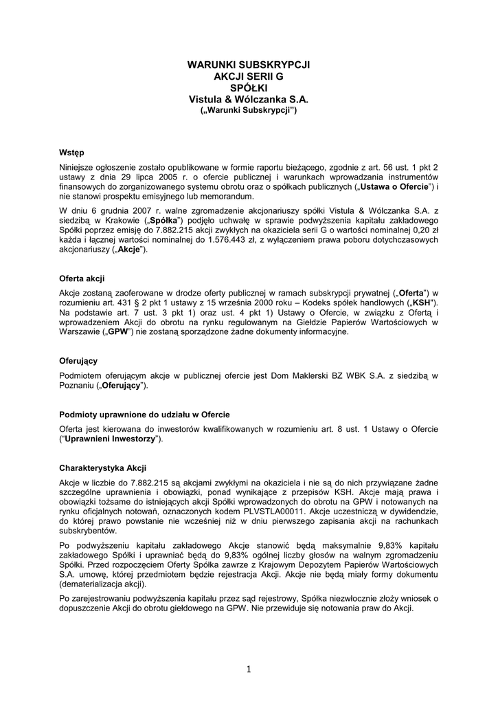 WARUNKI SUBSKRYPCJI AKCJI SERII G SPÓŁKI Vistula & Wólczanka S.A. („Warunki Subskrypcji”) Wstęp Niniejsze ogłoszenie zostało opublikowane w formie raportu bieżącego, zgodnie z art. 56 ust. 1 pkt 2 ustawy z dnia 29 lipca 2005 r. o ofercie publicznej i warunkach wprowadzania instrumentów finansowych do zorganizowanego systemu obrotu oraz o spółkach publicznych („Ustawa o Ofercie”) i nie stanowi prospektu emisyjnego lub memorandum. W dniu 6 grudnia 2007 r. walne zgromadzenie akcjonariuszy spółki Vistula & Wólczanka S.A. z siedzibą w Krakowie („Spółka”) podjęło uchwałę w sprawie podwyższenia kapitału zakładowego Spółki poprzez emisję do 7.882.215 akcji zwykłych na okaziciela serii G o wartości nominalnej 0,20 zł każda i łącznej wartości nominalnej do 1.576.443 zł, z wyłączeniem prawa poboru dotychczasowych akcjonariuszy („Akcje”). Oferta akcji Akcje zostaną zaoferowane w drodze oferty publicznej w ramach subskrypcji prywatnej („Oferta”) w rozumieniu art. 431 § 2 pkt 1 ustawy z 15 września 2000 roku – Kodeks spółek handlowych („KSH"). Na podstawie art. 7 ust. 3 pkt 1) oraz ust. 4 pkt 1) Ustawy o Ofercie, w związku z Ofertą i wprowadzeniem Akcji do obrotu na rynku regulowanym na Giełdzie Papierów Wartościowych w Warszawie („GPW”) nie zostaną sporządzone żadne dokumenty informacyjne. Oferujący Podmiotem oferującym akcje w publicznej ofercie jest Dom Maklerski BZ WBK S.A. z siedzibą w Poznaniu („Oferujący”). Podmioty uprawnione do udziału w Ofercie Oferta jest kierowana do inwestorów kwalifikowanych w rozumieniu art. 8 ust. 1 Ustawy o Ofercie (“Uprawnieni Inwestorzy”). Charakterystyka Akcji Akcje w liczbie do 7.882.215 są akcjami zwykłymi na okaziciela i nie są do nich przywiązane żadne szczególne uprawnienia i obowiązki, ponad wynikające z przepisów KSH. Akcje mają prawa i obowiązki tożsame do istniejących akcji Spółki wprowadzonych do obrotu na GPW i notowanych na rynku oficjalnych notowań, oznaczonych kodem PLVSTLA00011. Akcje uczestniczą w dywidendzie, do której prawo powstanie nie wcześniej niż w dniu pierwszego zapisania akcji na rachunkach subskrybentów. Po podwyższeniu kapitału zakładowego Akcje stanowić będą maksymalnie 9,83% kapitału zakładowego Spółki i uprawniać będą do 9,83% ogólnej liczby głosów na walnym zgromadzeniu Spółki. Przed rozpoczęciem Oferty Spółka zawrze z Krajowym Depozytem Papierów Wartościowych S.A. umowę, której przedmiotem będzie rejestracja Akcji. Akcje nie będą miały formy dokumentu (dematerializacja akcji). Po zarejestrowaniu podwyższenia kapitału przez sąd rejestrowy, Spółka niezwłocznie złoży wniosek o dopuszczenie Akcji do obrotu giełdowego na GPW. Nie przewiduje się notowania praw do Akcji. 1 Terminy Oferty 10.12.2007 r. publikacja raportu bieżącego zawierającego niniejsze Warunki Subskrypcji 13.12.2007 r. Rozpoczęcie budowania księgi popytu zakończenie budowania księgi popytu ( zakończenie o g. 15:00) 14.12 2007 r. ustalenie Ceny Emisyjnej wstępny przydział akcji, stworzenie listy Uprawnionych Inwestorów 17.12.2007 r. otwarcie subskrypcji zawarcie Umów 19.12.2007 r. zamknięcie subskrypcji dokonanie przydziału akcji Spółka zastrzega sobie prawo do zmiany każdego z powyższych terminów, w tym również do skrócenia terminu budowania księgi popytu, jeśli zgłoszony popyt pozwoli na ustalenie satysfakcjonującej ceny emisyjnej. Spółka ogłosi informacje o zmianie terminu w drodze raportu bieżącego, najpóźniej w dniu roboczym poprzedzającym termin, którego zmiana dotyczy. O zmianie polegającej na wydłużeniu terminu budowania księgi popytu lub o zmianie terminu zawarcia Umów i zamknięcia subskrypcji, Spółka może ogłosić w formie raportu bieżącego w dniu, w którym upływa termin podlegający zmianie. Budowanie księgi popytu i ustalenie ceny emisyjnej Oferujący, działając z upoważnienia Spółki, zaprosi wybranych Uprawnionych Inwestorów do składania deklaracji zainteresowania nabyciem Akcji („Deklaracja”), w których wskażą oni w szczególności liczbę Akcji, którą zamierzają nabyć oraz cenę, po której zamierzają nabyć Akcje. Zaproszenie może zostać skierowane do inwestora w dowolnej formie. Na podstawie księgi popytu, Zarząd Spółki, w oparciu o rekomendację Oferującego, ustali cenę emisyjną Akcji („Cena Emisyjna”). Cena Emisyjna nie będzie mogła być niższa od pomniejszonej o 5% średniej arytmetycznej ceny jednej akcji Spółki z okresu sześciu miesięcy notowań na GPW według kursu zamknięcia w systemie notowań ciągłych do dnia 5 grudnia 2007 r., tj. z okresu od dnia 5 czerwca 2007 do dnia 5 grudnia 2007 roku włącznie. Spółka na podstawie rekomendacji Oferującego, według jej wyłącznego uznania, określi liczbę Akcji wstępnie przydzieloną każdemu z Uprawnionych Inwestorów, z zastrzeżeniem zdań następnych. Uprawnionym Inwestorom, którzy w swojej deklaracji zainteresowania wskażą cenę niższą niż Cena Emisyjna, nie zostaną przydzielone Akcje. Przewidziane jest prawo pierwszeństwa w przydziale akcji dla akcjonariuszy Spółki. Każdy Uprawniony Inwestor będący akcjonariuszem Spółki na koniec dnia poprzedzającego dzień ustalenia przez Zarząd ceny emisyjnej Akcji („Dzień Własności Akcji), którego data została wskazana przez Zarząd w drodze raportu bieżącego, będzie miał prawo pierwszeństwa objęcia Akcji w liczbie jednej Akcji za każde dziesięć akcji Spółki wcześniejszych emisji posiadanych w Dniu Własności Akcji. W związku z powyższymi preferencjami w przydziale Akcji, inwestor planujący skorzystanie z prawa pierwszeństwa, jest zobowiązany w momencie składania Deklaracji, udowodnić podstawę do skorzystania z preferencyjnego przydziału. Jako dowód uznaje się zaświadczenie bycia akcjonariuszem Spółki w Dniu Własności Akcji wydane przez podmiot prowadzący rachunek pa