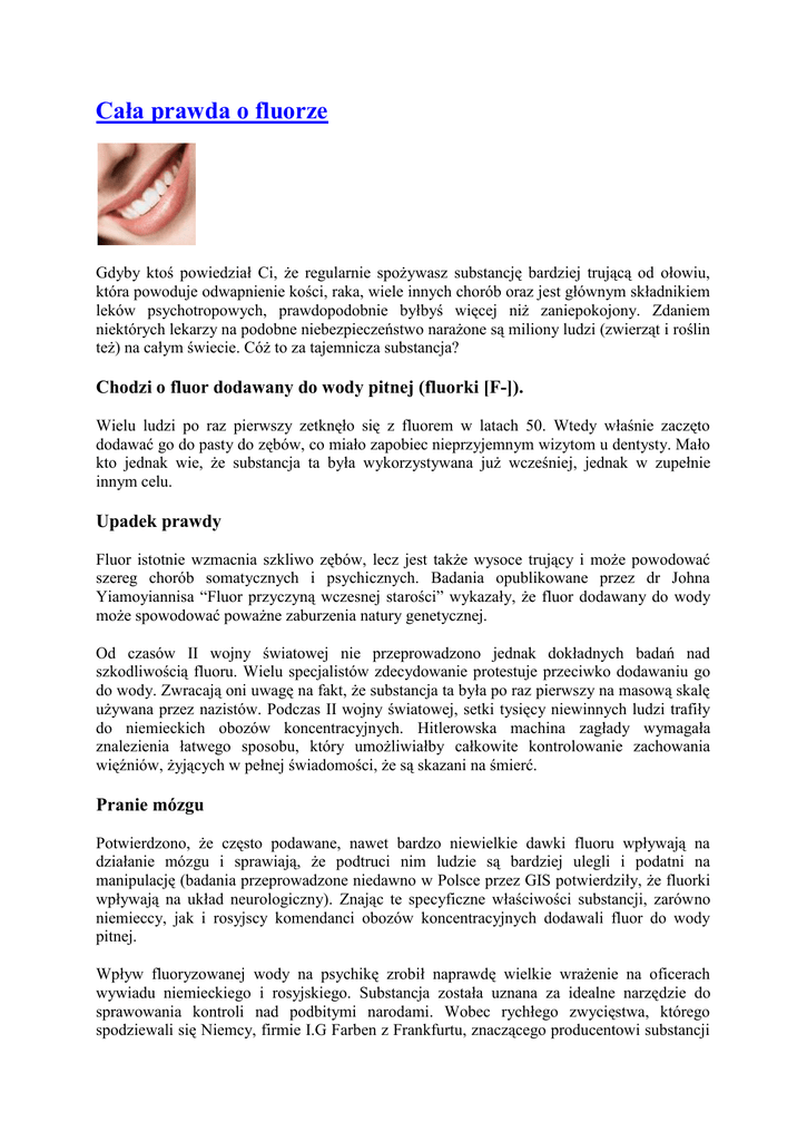 Cała prawda o fluorze Gdyby ktoś powiedział Ci, że regularnie spożywasz substancję bardziej trującą od ołowiu, która powoduje odwapnienie kości, raka, wiele innych chorób oraz jest głównym składnikiem leków psychotropowych, prawdopodobnie byłbyś więcej niż zaniepokojony. Zdaniem niektórych lekarzy na podobne niebezpieczeństwo narażone są miliony ludzi (zwierząt i roślin też) na całym świecie. Cóż to za tajemnicza substancja? Chodzi o fluor dodawany do wody pitnej (fluorki [F-]). Wielu ludzi po raz pierwszy zetknęło się z fluorem w latach 50. Wtedy właśnie zaczęto dodawać go do pasty do zębów, co miało zapobiec nieprzyjemnym wizytom u dentysty. Mało kto jednak wie, że substancja ta była wykorzystywana już wcześniej, jednak w zupełnie innym celu. Upadek prawdy Fluor istotnie wzmacnia szkliwo zębów, lecz jest także wysoce trujący i może powodować szereg chorób somatycznych i psychicznych. Badania opublikowane przez dr Johna Yiamoyiannisa “Fluor przyczyną wczesnej starości” wykazały, że fluor dodawany do wody może spowodować poważne zaburzenia natury genetycznej. Od czasów II wojny światowej nie przeprowadzono jednak dokładnych badań nad szkodliwością fluoru. Wielu specjalistów zdecydowanie protestuje przeciwko dodawaniu go do wody. Zwracają oni uwagę na fakt, że substancja ta była po raz pierwszy na masową skalę używana przez nazistów. Podczas II wojny światowej, setki tysięcy niewinnych ludzi trafiły do niemieckich obozów koncentracyjnych. Hitlerowska machina zagłady wymagała znalezienia łatwego sposobu, który umożliwiałby całkowite kontrolowanie zachowania więźniów, żyjących w pełnej świadomości, że są skazani na śmierć. Pranie mózgu Potwierdzono, że często podawane, nawet bardzo niewielkie dawki fluoru wpływają na działanie mózgu i sprawiają, że podtruci nim ludzie są bardziej ulegli i podatni na manipulację (badania przeprowadzone niedawno w Polsce przez GIS potwierdziły, że fluorki wpływają na układ neurologiczny). Znając te specyficzne właściwości substancji, zarówno niemieccy, jak i rosyjscy komendanci obozów koncentracyjnych dodawali fluor do wody pitnej. Wpływ fluoryzowanej wody na psychikę zrobił naprawdę wielkie wrażenie na oficerach wywiadu niemieckiego i rosyjskiego. Substancja została uznana za idealne narzędzie do sprawowania kontroli nad podbitymi narodami. Wobec rychłego zwycięstwa, którego spodziewali się Niemcy, firmie I.G Farben z Frankfurtu, znaczącego producentowi substancji chemicznych, zlecono masową produkcję fluoru dla obozów śmierci oraz innych, równie zbrodniczych celów. Kontrola umysłów Zaraz po zakończeniu wojny władze amerykańskie wysłały do Niemiec Charlesa Eliota Perkinsa - chemika, patologa i fizjologa - żeby zbadał opracowane przez nazistów metody kontroli umysłów z wykorzystaniem fluoru. Śledztwo Perkinsa przyniosło szokujące rezultaty. Według jego raportu “po tym, jak naziści wkroczyli do Polski, sztaby generalne Niemiec i Rosji wymieniały się rozmaitymi pomysłami naukowymi i militarnymi (…). Bolszewicy uznali system masowej kontroli poprzez dodawanie leków do wody jako idealnie nadający się do realizacji planów skomunizowania świata (…)”. Perkins w swoim raporcie nie wspomniał o bezpośrednim udziale wywiadu alianckiego w projekcie globalnej kontroli ludzkich umysłów. Jeśli jednak bliżej przyjrzeć się działalności I.G. Farben, na jaw wychodzą pewne zastanawiające powiązania niemieckiej firmy z zachodnim kapitałem. Poparcie zachodu Okres rozkwitu I.G. Farben przypada na lata 20. Firma nawiązała wtedy współpracę z takimi amerykańskimi koncernami jak przedsiębiorstwo samochodowe Forda, General Electrics i Standard Oil, należąca do Rockefellerów. Współpraca ta utrzymywała się w latach 30. i nie przerwał jej nawet wybuch wojny. Co ciekawe, żadna fabryka należąca do I.G. Farben nie została zbombardowana, nie ucierpiała od sabotażu ani nie uległa zniszczeniu w wyniku działań wojennych. Badacz i pisarz Ian E. Stephens twierdzi, że osoby wysoko postawione w rządzie amerykańskim wydały dowódcom eskadr bombowych bezwzględny rozkaz oszczędzania budynków. Jaki mógł być tego powód? Od czasu amerykańskiego Wielkiego Kryzysu lat 30., Fundacja Rockefellera i rodzina Fordów publicznie popierały politykę zmierzającą do ograniczenia przyrostu naturalnego w USA. Wiadomo też, że wiele bardzo wpływowych osobistości ze środowiska biznesu i przemysłu Stanów Zjednoczonych przed i po wojnie zainwestowało znaczną ilość pieniędzy w projekty I.G.Farben. Wśród nich była rodzina Mellonów. W 1913 roku Mellonowie założyli specjalną fundację sponsorująca projekty, które miały przyczynić się do rozwoju nauki i technologii. To właśnie w finansowanym przez nich instytucie badawczym odkryto, że fluor “w nadzwyczajny sposób przyczynia się do ochrony zębów”. Korzyści finansowe Dziwnym zbiegiem okoliczności rodzina Mellonów założyła również Amerykańskie Przedsiębiorstwo Aluminiowe (ALCOA). Fluor jest wysoce toksycznym produktem ubocznym produkcji aluminium (jak również wielu innych procesów przemysłowych), a ALCOA było często - i z powodzeniem - oskarżane o zatruwanie bydła, upraw i rzek. Bezpieczne pozbywanie się odpadów okazało się drogie, konieczne więc było wymyślenie innego sposobu wyeliminowania dodatkowych kosztów. ALCOA i inne zakłady produkujące fluor sfinansowały badania, które wykazały, że małe ilości tej substancji nie są szkodliwe dla zdrowia. Co więcej, okazało się, że fluor zmniejsza ryzyko próchnicy. Odkrywcy nowej, rewolucyjnej metody ochrony zębów przedstawili opinii publicznej korzyści płynące z zastosowania fluoru, całkowicie pomijając skutki odkładania się tej trującej substancji w organizmie. Badania selektywne Naukowcy pracujący dla Amerykańskiego Stowarzysze