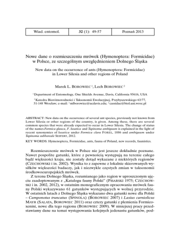 Wiad. entomol. 32 (1): 49-57 Poznań 2013 Nowe dane o rozmieszczeniu mrówek (Hymenoptera: Formicidae) w Polsce, ze szczególnym uwzględnieniem Dolnego Śląska New data on the occurrence of ants (Hymenoptera: Formicidae) in Lower Silesia and other regions of Poland Marek L. BOROWIEC 1, Lech BOROWIEC 2 1 Department of Entomology, One Shields Avenue, Davis, California 95616, USA 2 Katedra Bioróżnorodności i Taksonomii Ewolucyjnej, Przybyszewskiego 63/77, 51-148 Wrocław; e-mail: 1 [email protected]; 2 [email protected] ABSTRACT: New data on the occurrence of several ant species, previously not known from Lower Silesia or other regions of the country, is given. Among these, there are several common species that were already expected to occur in Lower Silesia. The change of status of the names Formica glauca, F. lusatica and Tapinoma ambiguum is explained in the light of recent synonymies of lusatica under Formica clara F OREL, 1886 and ambiguum under Tapinoma subboreale SEIFERT, 2012. KEY WORDS: Hymenoptera, Formicidae, ants, fauna of Poland, new records, faunistics. Rozmieszczenie mrówek w Polsce nie jest jeszcze dokładnie poznane. Nawet pospolite gatunki, które z pewnością występują na terenie całego bądź większości kraju, nie zostały dotąd wykazane z niektórych regionów (CZECHOWSKI i in. 2002). Wynika to z zapewne z lokalnie skierowanych wysiłków większości badaczy, jak i niezwykle częstych zmian w taksonomii środkowoeuropejskich mrówek. Z terenu Dolnego Śląska, rozumianego jako region w uproszczonym ujęciu zaadoptowanym z „Katalogu fauny Polski” (PISARSKI 1975; CZECHOWSKI i in. 2002, 2012), w ostatnim monograficznym opracowaniu mrówek fauny Polski wykazywano 61 gatunków występujących w wolnej przyrodzie. W ostatnich latach z Dolnego Śląska wykazano dwa gatunki nowe dla Polski – Camponotus truncatus (SPINOLA) (BOROWIEC 2007) i Lasius carniolicus MAYR (S ALATA, BOROWIEC 2011) oraz cztery gatunki z plemienia Formicoxenini, nowe dla tego regionu (B OROWIEC 2009). W niniejszej pracy przedstawiamy dane na temat występowania kolejnych jedenastu gatunków, pod- 50 M. L. BOROWIEC, L. BOROWIEC nosząc całkowitą liczbę gatunków znanych z tego regionu do 61 – w mongrafii CZECHOWSKIEGO i in. (2012) uwzględniono już gatunki podawane w tej notatce. W ten sposób region ten pod względem różnorodności mrówek ustępuje jedynie Pieninom, skąd podano 64 gatunki. Identyfikacja okazów została przeprowadzona z pomocą kluczy RAD CHENKI i in. (2004) oraz SEIFERTA (2007). Część cytowanej literatury została pozyskana z pomocą wirtualnej bazy antbase.org (AGOSTI, JOHNSON 2010). Materiały dowodowe znajdują się w kolekcjach autorów. Oznaczenia w, g, m odnoszą się do kast/płci złowionych okazów: w – robotnica, dg – królowa (bezskrzydła), ag – królowa (uskrzydlona), m – samiec. Zbierający: JP – Joanna POMORSKA, LB – Lech BOROWIEC , MLB – Marek L. BOROWIEC , MP – Marta POPRAWSKA, RR – Rafał RUTA. Ponera coarctata (LATREILLE, 1802) – Dolny Śląsk: Wrocław - Ołbin (UTM: XS46; 51°07'N 17°03'E), 16 VII 2005 – 1dg, leg. MLB. Gatunek rzadko spotykany i do niedawna nieodróżniany od P. testacea EMERY, 1895 (CSŐSZ , SEIFERT 2003), ale niewątpliwie szeroko rozmieszczony. Niedawno wskazano na jego stałą obecność w terenach zurbanizowanych Holandii (NOORDIJK i in. 2008). Rewizja polskich materiałów tego rodzaju potwierdziła występowanie P. coarctata na Pojezierzu Pomorskim, Wyżynie Krakowsko-Częstochowskiej, Beskidzie Zachodnim i w Pieninach (CZE CHOWSKI, RADCHENKO 2010). Bezskrzydłą królową jeden z autorów (MLB) znalazł w mieszkaniu i jest to pierwsze stwierdzenie z Dolnego Śląska. Ponera testacea E MERY, 1895 – Dolny Śląsk: Wrocław - Karłowice (XS46; 51°08'N 17°03'E), 15 IX 2005 i 16 VIII 2007 – 1w, 3ag, 1dg, 2m, leg. MLB; Kunów vic. (XS24; 50°54'N 16°47'E), 5 VI 2010 – 1w, leg. LB; Przemiłów (XS23; 50°51'N 16°47'E) ad Sulistrowice, 12 VI 2010 – 1w, leg. LB. – Wyżyna Krakowsko-Częstochowska: Jerzmanowice - Czołowa, „skałka 502” (DA16; 50°12'N 19°46'E), 20 V 2006 – 4w, leg. LB; Czajowice (DA16; 50°11'N 19°48'E) ad Ojców, wapiennik, 20 V 2006 – 1w, leg. RR. Gatunek od niedawna wykazany z Polski, najwyraźniej bardziej ciepłolubny od P. coarctata (CSŐSZ, SEIFERT 2003). Dotychczas znany tylko z Wyżyny Lubelskiej i Małopolskiej (C ZECHOWSKI, RADCHENKO 2010). W połowie sierpnia 2007 na terenie kampusu Uniwersytetu Wrocławskiego przy ulicy Przybyszewskiego jeden z autorów (MLB) obserwował lot godowy tych mrówek. Pojedyncze samce wzlatywały w górę i opadały wyraźnie skupione w okolicy rozrzuconych po trawniku głazów, po czym, po złączeniu z samicą spadały na powierzchnię gruntu, gdzie dochodziło do kopulacji. NOWE DANE O ROZMIESZCZENIU MRÓWEK W POLSCE 51 W pobliżu – na starym murze – znaleziono też jedną robotnicę. Robotnica z Kunowa pochodzi z nieczynnych wyrobisk amfibolitu i gabra. Okazy z Jerzmanowic - Czołowej zbierane były pod mchem na skałkach wapiennych, natomiast Czajowice to nieczynny kamieniołom wapienia. Tapinoma erraticum (LATREILLE , 1798) – Dolny Śląsk: masyw Ślęży, Słupice vic. (XS23; 50°50'N 16°44'E), sucha murawa u podstawy opuszczonego kamieniołomu serpentynitu, 16 VII 2009 i 26 VII 2009 – 7w, leg. LB et MLB; Łąka Sulistrowicka (XS23; 50°50'N 16°44'E) ad Sulistrowiczki, 13 VII 2011 – 20w, leg. MLB. Nieczęsty gatunek kserotermofilny, szeroko jednak rozmieszczony w Polsce i wykazywany z Pojezierza Pomorskiego, Niziny Wielkopolsko-Kujawskiej, Niziny Mazowieckiej, Górnego Śląska, Wyżyny Krakowsko-Częstochowskiej, Wyżyny Lubelskiej, Wyżyny Małopolskiej i Pienin (CZECHOWSKI i in. 2002). W Słupicach znaleźliśmy gniazdo pod niewielkim kamieniem. Gniazdo na Łące Sulistrowickiej miało formę niewielkiego, stożkowatego kopca średnicy około 10 cm i wysokości 15 cm, usypanego z suchych szcząt
