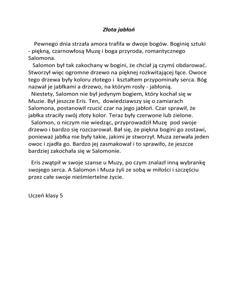 Złota jabłoń Pewnego dnia strzała amora trafiła w dwoje bogów. Boginię sztuki - piękną, czarnowłosą Muzę i boga przyroda, romantycznego Salomona. Salomon był tak zakochany w bogini, że chciał ją czymś obdarować. Stworzył więc ogromne drzewo na pięknej rozkwitającej łące. Owoce tego drzewa były koloru złotego i kształtem przypominały serca. Bóg nazwał je jabłkami a drzewo, na którym rosły - jabłonią. Niestety, Salomon nie był jedynym bogiem, który kochał się w Muzie. Był jeszcze Eris. Ten, dowiedziawszy się o zamiarach Salomona, postanowił rzucić czar na jego jabłoń. Czar sprawił, że jabłka straciły swój złoty kolor. Teraz były czerwone lub zielone. Salomon, o niczym nie wiedząc, przyprowadził Muzę pod swoje drzewo i bardzo się rozczarował. Bał się, że piękna bogini go zostawi, ponieważ jabłka nie były takie, jakimi je stworzył. Muza zerwała jeden owoc i zjadła go. Bardzo jej zasmakował i to sprawiło, że jeszcze bardziej zakochała się w Salomonie. Eris zwątpił w swoje szanse u Muzy, po czym znalazł inną wybrankę swojego serca. A Salomon i Muza żyli ze sobą w miłości i szczęściu przez całe swoje nieśmiertelne życie. Uczeń klasy 5