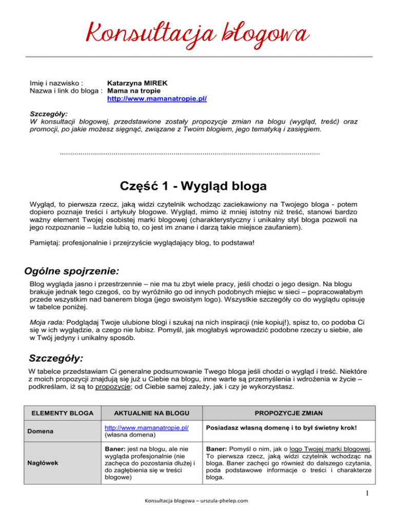 Konsultacja blogowa _______________________________________________________________________________________________ Imię i nazwisko : Katarzyna MIREK Nazwa i link do bloga : Mama na tropie http://www.mamanatropie.pl/ Szczegóły: W konsultacji blogowej, przedstawione zostały propozycje zmian na blogu (wygląd, treść) oraz promocji, po jakie możesz sięgnąć, związane z Twoim blogiem, jego tematyką i zasięgiem. .............................................................................................................................. Część 1 - Wygląd bloga Wygląd, to pierwsza rzecz, jaką widzi czytelnik wchodząc zaciekawiony na Twojego bloga - potem dopiero poznaje treści i artykuły blogowe. Wygląd, mimo iż mniej istotny niż treść, stanowi bardzo ważny element Twojej osobistej marki blogowej (charakterystyczny i unikalny styl bloga pozwoli na jego rozpoznanie – ludzie lubią to, co jest im znane i darzą takie miejsce zaufaniem). Pamiętaj: profesjonalnie i przejrzyście wyglądający blog, to podstawa! Ogólne spojrzenie: Blog wygląda jasno i przestrzennie – nie ma tu zbyt wiele pracy, jeśli chodzi o jego design. Na blogu brakuje jednak tego czegoś, co by wyróżniło go od innych podobnych miejsc w sieci – popracowałabym przede wszystkim nad banerem bloga (jego swoistym logo). Wszystkie szczegóły co do wyglądu opisuję w tabelce poniżej. Moja rada: Podglądaj Twoje ulubione blogi i szukaj na nich inspiracji (nie kopiuj!), spisz to, co podoba Ci się w ich wyglądzie, a czego nie lubisz. Pomyśl, jak mogłabyś wprowadzić podobne rzeczy u siebie, ale w Twój jedyny i unikalny sposób. Szczegóły: W tabelce przedstawiam Ci generalne podsumowanie Twego bloga jeśli chodzi o wygląd i treść. Niektóre z moich propozycji znajdują się już u Ciebie na blogu, inne warte są przemyślenia i wdrożenia w życie – podkreślam, iż są to propozycje; od Ciebie samej zależy, jak i czy je wykorzystasz. ELEMENTY BLOGA AKTUALNIE NA BLOGU PROPOZYCJE ZMIAN Domena http://www.mamanatropie.pl/ (własna domena) Posiadasz własną domenę i to był świetny krok! Nagłówek Baner: jest na blogu, ale nie wygląda profesjonalnie (nie zachęca do pozostania dłużej i do zagłębienia się w treści blogowe) Baner: Pomyśl o nim, jak o logo Twojej marki blogowej. To pierwsza rzecz, jaką widzi czytelnik wchodząc na bloga. Baner zachęci go również do dalszego czytania, poda podstawowe informacje o treści i charakterze bloga. 1 Konsultacja blogowa – urszula-phelep.com Baner może być prosty, ale elegancki. Motto: brak Motto: to krótkie hasło, czy kilka przymiotników w banerze bloga (pod jego nazwą) - nie jest obowiązkowe, ale od razu przedstawia czytelnikowi charakter i tematykę bloga. Nie potrzebujesz go u siebie, bowiem nazwa bloga mówi wszystko. Aktualne kolory: biały (tło) – czarny (tekst) – czerwony (dodatki) Kolory Stanowią markę Twoją i Twego bloga (razem z banerem, jako logo). Wyróżniają go od innych. Na Twoim blogu istnieją trzy kolory i mam małe zastrzeżenie co do koloru czerwonego – który jest dosyć agresywną barwą. Jako, że prowadzisz blog parentingowy, powinnaś zrezygnować z czerwonegoatakującego koloru na rzecz podobnej, ale łagodniejszej barwy (np. pastelowa czerwień, jak tutaj: http://savethemagicmoments.blogspot.com), albo w ogóle zamienić czerwień na inną barwę lub dodać jeszcze kilka innych mocniejszych kolorów (efekt tęczy, jak na tym blogu: http://mylittlemadnessuk.blogspot.co.uk/ ) Tych samych kolorów, co na blogu, używaj jeśli przedstawiasz gdzieś swój baner (np. wywiad, konkurs, reklama, itp.) lub jeśli posiadasz fan-stronę bloga na Facebooku. Czcionka Strony statyczne Aktualne czcionki: 1 rodzaj – czcionka klasyczna (tytuły postów i treść postów) Czcionka na blogu powinna być prosta i czytelna – u Ciebie jest. „O Mnie” – brak To bardzo ważna część bloga. „Kontakt/współpraca” - brak Strona „O Mnie”, to podstawa! Osoby odwiedzające Twego bloga i lubiące go, mają ochotę na poznanie bliżej jego autora (tak, jak Ty z pewnościa lubisz czytać profil pisarza, po przeczytaniu jego książki). Bez tej strony, blog jest tylko elektronicznym dziennikiem i poradnikiem. Twoja strona „O Mnie” nie istnieje (Profil Bloggera nie jest tu wystarczający). Możesz wstawić również stronę „Kontakt”, gdzie napiszesz kilka słów do swoich czytelników informując ich w jakiej sprawie mogą do Ciebie napisać i podając adres email. Pamiętaj: strona „Kontakt” nie może być stroną proponująca współpracę! Do zrobienia! w jednym z załączników przesyłam Ci informacje na temat tworzenia strony „O Mnie”. KOLUMNY Wstaw w górnej części kolumny (pod Twoim zdjęciem i opisem autorki) to, co wydaje Ci się być naważniejsze, gdzie chciałabyś przekierować czytelników, w co chciałabyś 2 Konsultacja blogowa – urszula-phelep.com by kliknęli. MUST! Radzę Ci wstawić zdjęcie Twojej osoby w kolumnie (na szerokość kolumny), spoglądającej, z dużym uśmiechem, w obiektyw – to budzi zaufanie i powoduje nawiązanie pierwszego kontaktu wzrokowego z czytelnikiem. Zdjęcie i profil autorki - brak Do zrobienia! Aktualnie znajdują się w górnym menu bloga i to jest dobre miejsce. Możesz wówczas przenieść do bocznej kolumny strony statyczne takie, jak: O Mnie, Współpraca, Kontakt, a zostawić kategorie – takie menu będzie bardziej zrozumiałe dla czytelnika. Kategorie/Etykiety Linki do mediów społecznościowych Znajdują się już w kolumnie – ok. To świetna rzecz do wygrzebania z czeluści archiwum Twoich najlepszych postów. Dzięki temu nie zostaną one zapomniane i przyniosą blogowi więcej odwiedzin i większe statystyki. Do zrobienia! Lista popularnych/ulubionych postów Baner do innej Twojej działalności (sklep, inny blog, warsztaty, itp.) Archiwum Jeśli prowadzisz inną działalność, poza blogiem, wstaw do niej baner 
