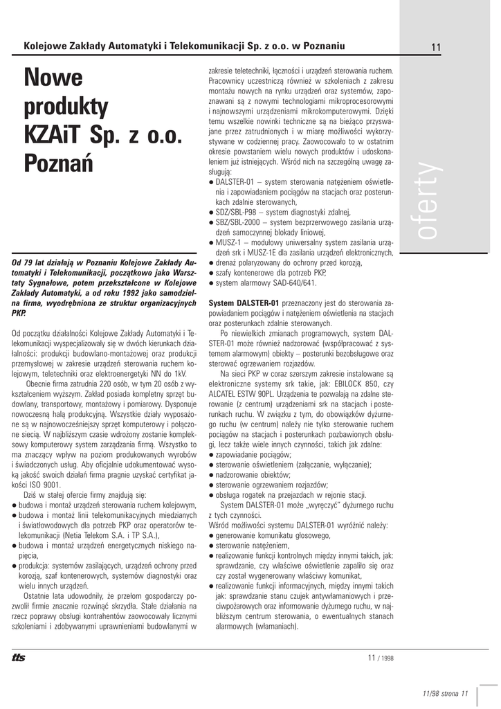 Kolejowe Zak³ady Automatyki i Telekomunikacji Sp. z o.o. w Poznaniu Od 79 lat dzia³aj¹ w Poznaniu Kolejowe Zak³ady Automatyki i Telekomunikacji, pocz¹tkowo jako Warsztaty Sygna³owe, potem przekszta³cone w Kolejowe Zak³ady Automatyki, a od roku 1992 jako samodzielna firma, wyodrêbniona ze struktur organizacyjnych PKP. Od pocz¹tku dzia³alnoœci Kolejowe Zak³ady Automatyki i Telekomunikacji wyspecjalizowa³y siê w dwóch kierunkach dzia³alnoœci: produkcji budowlano-monta¿owej oraz produkcji przemys³owej w zakresie urz¹dzeñ sterowania ruchem kolejowym, teletechniki oraz elektroenergetyki NN do 1kV. Obecnie firma zatrudnia 220 osób, w tym 20 osób z wykszta³ceniem wy¿szym. Zak³ad posiada kompletny sprzêt budowlany, transportowy, monta¿owy i pomiarowy. Dysponuje nowoczesn¹ hal¹ produkcyjn¹. Wszystkie dzia³y wyposa¿one s¹ w najnowoczeœniejszy sprzêt komputerowy i po³¹czone sieci¹. W najbli¿szym czasie wdro¿ony zostanie kompleksowy komputerowy system zarz¹dzania firm¹. Wszystko to ma znacz¹cy wp³yw na poziom produkowanych wyrobów i œwiadczonych us³ug. Aby oficjalnie udokumentowaæ wysok¹ jakoœæ swoich dzia³añ firma pragnie uzyskaæ certyfikat jakoœci ISO 9001. Dziœ w sta³ej ofercie firmy znajduj¹ siê: budowa i monta¿ urz¹dzeñ sterowania ruchem kolejowym, budowa i monta¿ linii telekomunikacyjnych miedzianych i œwiat³owodowych dla potrzeb PKP oraz operatorów telekomunikacji (Netia Telekom S.A. i TP S.A.), budowa i monta¿ urz¹dzeñ energetycznych niskiego napiêcia, produkcja: systemów zasilaj¹cych, urz¹dzeñ ochrony przed korozj¹, szaf kontenerowych, systemów diagnostyki oraz wielu innych urz¹dzeñ. Ostatnie lata udowodni³y, ¿e prze³om gospodarczy pozwoli³ firmie znacznie rozwin¹æ skrzyd³a. Sta³e dzia³ania na rzecz poprawy obs³ugi kontrahentów zaowocowa³y licznymi szkoleniami i zdobywanymi uprawnieniami budowlanymi w zakresie teletechniki, ³¹cznoœci i urz¹dzeñ sterowania ruchem. Pracownicy uczestnicz¹ równie¿ w szkoleniach z zakresu monta¿u nowych na rynku urz¹dzeñ oraz systemów, zapoznawani s¹ z nowymi technologiami mikroprocesorowymi i najnowszymi urz¹dzeniami mikrokomputerowymi. Dziêki temu wszelkie nowinki techniczne s¹ na bie¿¹co przyswajane przez zatrudnionych i w miarê mo¿liwoœci wykorzystywane w codziennej pracy. Zaowocowa³o to w ostatnim okresie powstaniem wielu nowych produktów i udoskonaleniem ju¿ istniej¹cych. Wœród nich na szczególn¹ uwagê zas³uguj¹: DALSTER-01 – system sterowania natê¿eniem oœwietlenia i zapowiadaniem poci¹gów na stacjach oraz posterunkach zdalnie sterowanych, SDZ/SBL-P98 – system diagnostyki zdalnej, SBZ/SBL-2000 – system bezprzerwowego zasilania urz¹dzeñ samoczynnej blokady liniowej, MUSZ-1 – modu³owy uniwersalny system zasilania urz¹dzeñ srk i MUSZ-1E dla zasilania urz¹dzeñ elektronicznych, drena¿ polaryzowany do ochrony przed korozj¹, szafy kontenerowe dla potrzeb PKP, system alarmowy SAD-640/641. oferty Nowe produkty KZAiT Sp. z o.o. Poznañ 11 System DALSTER-01 przeznaczony jest do sterowania zapowiadaniem poci¹gów i natê¿eniem oœwietlenia na stacjach oraz posterunkach zdalnie sterowanych. Po niewielkich zmianach programowych, system DALSTER-01 mo¿e równie¿ nadzorowaæ (wspó³pracowaæ z systemem alarmowym) obiekty – posterunki bezobs³ugowe oraz sterowaæ ogrzewaniem rozjazdów. Na sieci PKP w coraz szerszym zakresie instalowane s¹ elektroniczne systemy srk takie, jak: EBILOCK 850, czy ALCATEL ESTW 90PL. Urz¹dzenia te pozwalaj¹ na zdalne sterowanie (z centrum) urz¹dzeniami srk na stacjach i posterunkach ruchu. W zwi¹zku z tym, do obowi¹zków dy¿urnego ruchu (w centrum) nale¿y nie tylko sterowanie ruchem poci¹gów na stacjach i posterunkach pozbawionych obs³ugi, lecz tak¿e wiele innych czynnoœci, takich jak zdalne: zapowiadanie poci¹gów; sterowanie oœwietleniem (za³¹czanie, wy³¹czanie); nadzorowanie obiektów; sterowanie ogrzewaniem rozjazdów; obs³uga rogatek na przejazdach w rejonie stacji. System DALSTER-01 mo¿e „wyrêczyæ” dy¿urnego ruchu z tych czynnoœci. Wœród mo¿liwoœci systemu DALSTER-01 wyró¿niæ nale¿y: generowanie komunikatu g³osowego, sterowanie natê¿eniem, realizowanie funkcji kontrolnych miêdzy innymi takich, jak: sprawdzanie, czy w³aœciwe oœwietlenie zapali³o siê oraz czy zosta³ wygenerowany w³aœciwy komunikat, realizowanie funkcji informacyjnych, miêdzy innymi takich jak: sprawdzanie stanu czujek antyw³amaniowych i przeciwpo¿arowych oraz informowanie dy¿urnego ruchu, w najbli¿szym centrum sterowania, o ewentualnych stanach alarmowych (w³amaniach). 11 / 1998 11/98 strona 11 12 drukowanie raportów o stanie odcinków izolowanych (wielkoœci napiêæ wystêpuj¹cych na uzwojeniach torowych przekaŸników torowych), drukowanie raportów o stanie linii transmisyjnych sbl i wielkoœci napiêæ wystêpuj¹cych w liniach transmisyjnych, wielokrotn¹ analizê parametrów sbl w dowolnym przedziale czasowym z ostatnich 72 godzin. System ten mo¿e byæ równie¿ przystosowany do diagnozowania innego rodzaju urz¹dzeñ infrastruktury. Rys. 1. Schemat blokowy DALSTER-01 System diagnostyki zdalnej SDZ/SBL – P98 umo¿liwia automatyczne sprawdzanie parametrów diagnozowanych urz¹dzeñ sbl (np. Eac, Eac 95) znajduj¹cych siê w kontenerach, zwanych punktami terenowymi i przesy³anie ich do wyznaczonego miejsca zwanego centrum diagnostyki. System ten umo¿liwia do³¹czenie dowolnej liczby centr diagnostycznych i urz¹dzeñ diagnozowanych. System diagnostyki zdalnej SDZ – P98 umo¿liwia pod³¹czenie przez s³u¿by utrzymania komputera przenoœnego w dowolnym punkcie terenowym i przejêcie funkcji lokalnego centrum, co daje mo¿liwoœæ diagnostyki systemu z dowolnego miejsca. Podstawowe funkcje systemu: informowanie personelu o stanie diagnozowanych urz¹dzeñ, rejestracja powsta³ych usterek z zaznaczeniem czasu ich wyst¹pienia oraz czasu ich usuniêcia, Rys. 