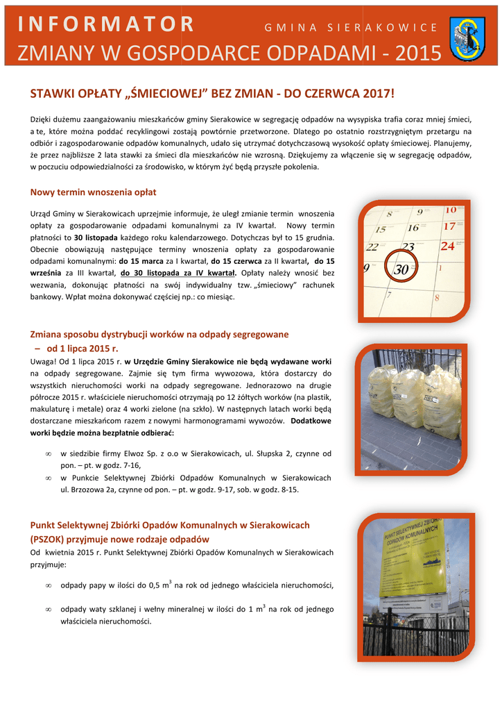 INFORMATOR GMINA SIERAKOWICE ZMIANY W GOSPODARCE ODPADAMI - 2015 STAWKI OPŁATY „ŚMIECIOWEJ” BEZ ZMIAN - DO CZERWCA 2017! 2017 Dzięki dużemu zaangażowaniu mieszkańców gminy Sierakowice w segregację odpadów na wysypiska trafia coraz mniej śmieci, a te, które można poddać recyklingowi zostają powtórnie przetworzone. Dlatego po ostatnio rozstrzygniętym przetargu na odbiór i zagospodarowanie odpadów komunalnych, udało się utrzymać dotychczasową wysokość opłaty śmieciowej. Planujemy, że przez najbliższe 2 lata stawki za śmieci dla mieszkańców nie wzrosną. Dziękujemy Dzię za włączenie łączenie się w segregację odpadów, w poczuciu odpowiedzialności za środowisko, środowisko w którym żyć będą przyszłe pokolenia. Nowy termin wnoszenia opłat Urząd Gminy w Sierakowicach uprzejmie informuje, że uległ zmianie termin wnoszenia opłaty za gospodarowanie wanie odpadami komunalnymi za IV kwartał. Nowy termin płatności to 30 listopada każdego roku kalendarzowego. Dotychczas był to 15 grudnia. Obecniee obowiązują następujące terminy wnoszenia opłaty za gospodarowanie odpadami komunalnymi: do 15 marca za I kwartał, do 15 czerwca za II kwartał, do 15 września za III kwartał, do 30 listopada za IV kwartał. kwar Opłaty należy wnosić bez wezwania, dokonując płatności na swój indywidualny tzw. „śmieciowy” rachunek bankowy. Wpłat można ożna dokonywać częściej np.: co miesiąc. Zmiana sposobu dystrybucji worków na odpady segregowane se – od 1 lipca 2015 r. Uwaga! Od 1 lipca 2015 r. w Urzędzie Gminy Sierakowice nie będą wydawane worki na odpady segregowane. Zajmie się tym firma wywozowa, wywozowa która dostarczy do wszystkich nieruchomości worki na odpady segregowane. segregowane Jednorazowo na drugie półrocze 2015 r. właściciele nieruchomości otrzymają po 12 żółtych worków (na plastik, makulaturę i metale) oraz 4 worki zielone (na ( szkło). W następnych latach worki będą dostarczane mieszkańcom razem z nowymi harmonogramami wywozów. Dodatkowe worki będzie można bezpłatnie odbierać: • • w siedzibie firmy Elwoz Sp. z o.o w Sierakowicach, ul. Słupska 2, czynne od pon. – pt. w godz. 7-16, w Punkcie Selektywnej Zbiórki Odpadów Komunalnych w Sierakowicach ul. Brzozowa 2a, czynne od pon. – pt. w godz. 9-17, 9 sob. w godz. 8-15. Punkt Selektywnej Zbiórki Opadów Komunalnych w Sierakowicach Sierakowic (PSZOK) przyjmuje nowe rodzaje odpadów Od kwietnia 2015 r. Punkt Selektywnej Zbiórki Opadów Komunalnych w Sierakowicach Sierakowic przyjmuje: 3 • odpady papy w ilości do 0,5 m na rok od jednego właściciela nieruchomości, • odpady waty szklanej i wełny mineralnej w ilości do 1 m na rok od jednego właściciela nieruchomości. 3 Ponadto Punkt Selektywnej Zbiórki Odpadów Komunalnych Komuna w Sierakowicach przyjmuje: • • • • • ODPADY KOMUNALNE POSEGREGOWANE GOWANE – odzież, plastik, papier, metal i szkło, ODPADY WIELKOGABARYTOWE – meble, dywany, duże opakowania, w tym opakowania ze styropianu, ZSEE - Zużyte sprzęty elektryczne i elektroniczne - telewizory, pralki, lodówki, komputery, monitory onitory oraz drobny sprzęt sprz AGD, ODPADY PROBLEMOWE – odpady niebezpieczne, w tym: tym baterie, akumulatory, żarówki, świetlówki, resztki farb, lakierów, rozpuszczalników, środki ochrony roślin i nawozy, pojemniki po olejach mineralnych i syntetycznych, pojemniki po tłuszczach, benzynie, e, środkach chemicznych, stare kosmetyki, przeterminowane leki, tusze do drukarek, tonery, taśmy wideo, kasety magnetofonowe, taśmy barwiące, opony. 3 ODPADY Z REMONTÓW – w ilości do 3 m od jednego właściciela nieruchomości, przy czym wymaga się odrębnego wydzielenia gruzu budowlanego, tworzyw sztucznych, styropianu i odpadów niebezpiecznych. Punkt nie przyjmuje odpadów zawierających azbest (eternit). PSZOK jest czynny od poniedziałku do piątku w godz. 9-17, 9 a w soboty w godz. 8-15. Co zrobić ze skoszoną trawą i innymi odpadami z ogrodu? Zgodnie Regulaminem Utrzymania Czystości i Porządku na terenie Gminy Sierakowice zgrabione liście czy też skoszona trawa nie mogą trafiać do pojemników na odpady zmieszane. Jeżeli wystawimy worki z odpadami zielonymi lub umieścimy odpady zielone w pojemniku przeznaczonym na odpady zmieszane, zmieszane to firma wywozowa takich odpadów nie odbierze, odbierze a informacja, że takie odpady zostały wystawione trafi do Referatu Ochrony Środowiska Urzędu Gminy. Wszelkie odpady zielone powstające na naszych posesjach powinny zostać poddane kompostowaniu w przydomowych kompostownikach, kompostownikach albo należy je oddać do Punktu Selektywnej Zbiórki Odpadów Komunalnych (PSZOK-u). (PSZOK Można przywieźćć tam dowolną ilość odpadów zielonych i złożyć je w przygotowanym kontenerze. Do kontenera wrzucamy luzem czyste odpady zielone, bez worków i innych zanieczyszczeń. Jak prawidłowo stosować naklejki z kodem kreskowym? ŻÓŁTA NAKLEJKA – ZAWSZE NA POJEMNIK!! Żółtą naklejkę z kodem kreskowym przyklejamy na pojemniki do odpadów zmieszanych oraz na pojemniki do odpadów segregowanych, jeżeli takowe posiadamy. BIAŁA NAKLEJKA – ZAWSZE NA WOREK!! Białe Bia naklejki przyklejamy lejamy na worki do odpadów segregowanych oraz na worki czarne, jeżeli sporadycznie na posesji będzie do odbioru o bioru większa ilość odpadów zmieszanych. Worki i pojemniki nie oznakowane naklejką z kodem kreskowym nie będą odbierane. Urząd Gminy Sierakowice • ul. Lęborska 30, 83-340 Sierakowice •Referat Ochrony Środowiska- przyjmowanie deklaracji i ustalanie wysokości opłaty, pok 111, tel: 58 681-95-66, [email protected] •Referat Finansowy - informacja o zaksięgowanych wpłatach, zaległościach i windykacji należności, pok. 205 tel: 58 681-95-17, [email protected] • www.sierakowice.biuletyn.net Punkt Selektywnej Zbiórki Odpadów Komunalnych w Sierakowicach • ul. Brzozowa 2a (za bazą Rejonu