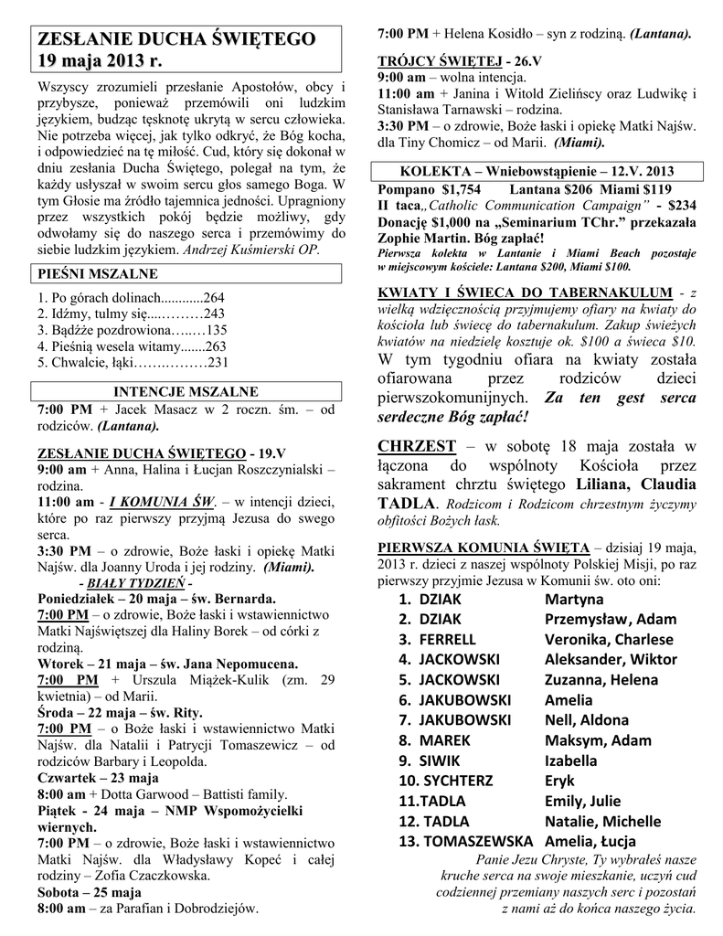 ZESŁANIE DUCHA ŚWIĘTEGO 19 maja 2013 r. Wszyscy zrozumieli przesłanie Apostołów, obcy i przybysze, ponieważ przemówili oni ludzkim językiem, budząc tęsknotę ukrytą w sercu człowieka. Nie potrzeba więcej, jak tylko odkryć, że Bóg kocha, i odpowiedzieć na tę miłość. Cud, który się dokonał w dniu zesłania Ducha Świętego, polegał na tym, że każdy usłyszał w swoim sercu głos samego Boga. W tym Głosie ma źródło tajemnica jedności. Upragniony przez wszystkich pokój będzie możliwy, gdy odwołamy się do naszego serca i przemówimy do siebie ludzkim językiem. Andrzej Kuśmierski OP. PIEŚNI MSZALNE 1. Po górach dolinach............264 2. Idźmy, tulmy się....………243 3. Bądźże pozdrowiona…..…135 4. Pieśnią wesela witamy.......263 5. Chwalcie, łąki…….………231 INTENCJE MSZALNE 7:00 PM + Jacek Masacz w 2 roczn. śm. – od rodziców. (Lantana). ZESŁANIE DUCHA ŚWIĘTEGO - 19.V 9:00 am + Anna, Halina i Łucjan Roszczynialski – rodzina. 11:00 am - I KOMUNIA ŚW. – w intencji dzieci, które po raz pierwszy przyjmą Jezusa do swego serca. 3:30 PM – o zdrowie, Boże łaski i opiekę Matki Najśw. dla Joanny Uroda i jej rodziny. (Miami). - BIAŁY TYDZIEŃ - Poniedziałek – 20 maja – św. Bernarda. 7:00 PM – o zdrowie, Boże łaski i wstawiennictwo Matki Najświętszej dla Haliny Borek – od córki z rodziną. Wtorek – 21 maja – św. Jana Nepomucena. 7:00 PM + Urszula Miążek-Kulik (zm. 29 kwietnia) – od Marii. Środa – 22 maja – św. Rity. 7:00 PM – o Boże łaski i wstawiennictwo Matki Najśw. dla Natalii i Patrycji Tomaszewicz – od rodziców Barbary i Leopolda. Czwartek – 23 maja 8:00 am + Dotta Garwood – Battisti family. Piątek - 24 maja – NMP Wspomożycielki wiernych. 7:00 PM – o zdrowie, Boże łaski i wstawiennictwo Matki Najśw. dla Władysławy Kopeć i całej rodziny – Zofia Czaczkowska. Sobota – 25 maja 8:00 am – za Parafian i Dobrodziejów. 7:00 PM + Helena Kosidło – syn z rodziną. (Lantana). TRÓJCY ŚWIĘTEJ - 26.V 9:00 am – wolna intencja. 11:00 am + Janina i Witold Zielińscy oraz Ludwikę i Stanisława Tarnawski – rodzina. 3:30 PM – o zdrowie, Boże łaski i opiekę Matki Najśw. dla Tiny Chomicz – od Marii. (Miami). KOLEKTA – Wniebowstąpienie – 12.V. 2013 Pompano $1,754 Lantana $206 Miami $119 II taca„Catholic Communication Campaign” - $234 Donację $1,000 na „Seminarium TChr.” przekazała Zophie Martin. Bóg zapłać! Pierwsza kolekta w Lantanie i Miami Beach pozostaje w miejscowym kościele: Lantana $200, Miami $100. KWIATY I ŚWIECA DO TABERNAKULUM - z wielką wdzięcznością przyjmujemy ofiary na kwiaty do kościoła lub świecę do tabernakulum. Zakup świeżych kwiatów na niedzielę kosztuje ok. $100 a świeca $10. W tym tygodniu ofiara na kwiaty została ofiarowana przez rodziców dzieci pierwszokomunijnych. Za ten gest serca serdeczne Bóg zapłać! CHRZEST – w sobotę 18 maja została w łączona do wspólnoty Kościoła przez sakrament chrztu świętego Liliana, Claudia TADLA. Rodzicom i Rodzicom chrzestnym życzymy obfitości Bożych łask. PIERWSZA KOMUNIA ŚWIĘTA – dzisiaj 19 maja, 2013 r. dzieci z naszej wspólnoty Polskiej Misji, po raz pierwszy przyjmie Jezusa w Komunii św. oto oni: 1. DZIAK 2. DZIAK 3. FERRELL 4. JACKOWSKI 5. JACKOWSKI 6. JAKUBOWSKI 7. JAKUBOWSKI 8. MAREK 9. SIWIK 10. SYCHTERZ 11.TADLA 12. TADLA 13. TOMASZEWSKA Martyna Przemysław , Adam Veronika, Charlese Aleksander, Wiktor Zuzanna, Helena Amelia Nell, Aldona Maksym, Adam Izabella Eryk Emily, Julie Natalie, Michelle Amelia, Łucja Panie Jezu Chryste, Ty wybrałeś nasze kruche serca na swoje mieszkanie, uczyń cud codziennej przemiany naszych serc i pozostań z nami aż do końca naszego życia. Odeszła do wieczności 12 maja śp. Maria DĄBKOWSKA (87). W ostatnią środę 15 maja w kaplicy cmentarnej „Our Lady Queen of Heaven‖, odbyła się Msza św. pogrzebowa. Wieczny odpoczynek racz zmarłym dać Panie, a światłość wiekuista niechaj im świeci. oraz rodziców i nauczycielki, którzy pomogli w opanowaniu tak pokaźnego materiału. Wynik bardzo dobry świadczy o pełnym sukcesie. Jesteśmy dumni z tak zdolnej młodzieży, zostały przetarte szlaki dla tych uczniów, którzy w kolejnych latach podejmą się takiego zadania. Przypomnienie, warunkiem przystąpienia do egzaminów jest zachowana ciągłość nauki w szkole polskiej przez 12 lat: (Jessica-13 lat, Bartek-12 lat). Do związku małżeńskiego przygotowują się Sylwia PRUCHNIK i Angel TUANAMA – zapowiedź III. Na czas wakacyjny już dziś życzę Nauczycielkom, młodzieży i wszystkim dzieciom pogodnych i długich WAKACJI! Zdjęcia z bierzmowania – do odebrania w zakrystii. KAWIARENKA - Zgłoszenia dyżurów proszę POLSKA SZKOŁA – Tydzień temu w sobotę 11 maja nastąpiło zakończenie roku szkolnego i katechetycznego w polskiej szkole: naukę ukończyło 46 uczniów (w tym 5 przygotowujących się do I komunii świętej). Dzieci uczyły się w sześciu grupach wiekowych, od 5-16 lat. Nauczyciele: grupa 1 - Małgorzata Kowalska; grupa 2 - Dorota Bogdziewicz; grupa 3 - Irena Karwacka; grupa 4 - Ewa Otfinowska; grupa 5 - Katarzyna Kaczmarek; grupa 6 – Edyta Klimczak. Rada Rodziców - Karina Stenger, Wiesława Kotarska, Ewa Sewioł oraz Jadwiga Charkiewicz. Dziękujemy młodzieży asystującym nauczycielkom: Anita Grabowska, Hubert Chibowski i Katarzynie Kasperskiej, dziękujemy lektorom z grupy młodzieżowej: Jessica Malinowska, Bartek Bogdziewicz, Katarzyna Kasperska, Patryk Malinowski, Sarah Araujo i Hubert Chibowski. Katechezę prowadził ks. Klemens Dąbrowski, TChr. (9:00-9:20 dzieci szkolne, 12:05-13:00 - dzieci pierwszokomunijne, dodatkowo 8 dzieci, w piątki 11 młodzieży do bierzmowana. Razem 65 dzieci i młodzieży uczęszczało do Polskiej Sobotniej Szkoły i na katechizację w tym roku szkolnym. tygodniu w kawiarence posługiwały następujące osoby: Anita i Ewelina Gr