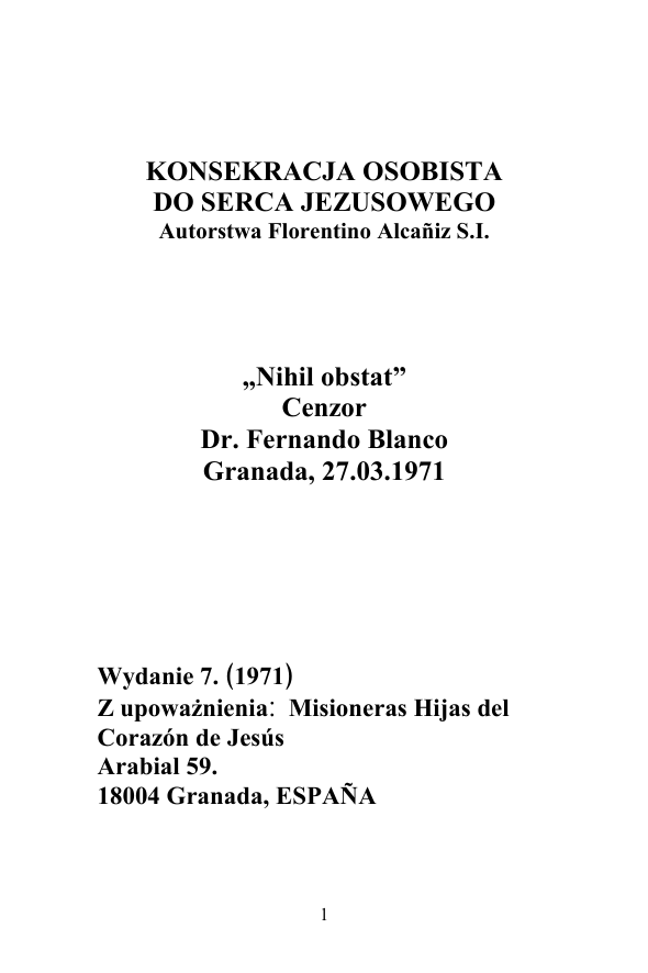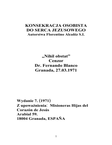 KONSEKRACJA OSOBISTA DO SERCA JEZUSOWEGO Autorstwa Florentino Alcañiz S.I. „Nihil obstat” Cenzor Dr. Fernando Blanco Granada, 27.03.1971 Wydanie 7. ﴾1971﴿ Z upoważnienia ׃Misioneras Hijas del Corazón de Jesús Arabial 59. 18004 Granada, ESPAÑA 1 2 Ι ZNACZENIE TRZY KATEGORE DUSZ Odpocznij chwilkę, duszo chrześcijańska, od podróży życia i posłuchaj pełnych miłości słów Serca Jezusowego, od Boga Miłości i Miłosierdzia, którego dusza Twoja tak pragnie. Powiedz mi, dziecko moje; Czy jesteś szczęśliwe? Czy jesteś zadowolone? Czy serce Twe jest spokojne? Czy żyjesz pełnią głębokiego spokoju ducha, jak ziarna piasku dna morza głębokiego? Czasami jesteś nieszczęśliwą duszą, która płacze po zrobieniu każdego kroku w grzechu, na podobieństwo gołębi, których skrzydła oblepione błotem nie mogą wynieść ich do lotu. Czasami jesteś jedną z tych dusz, która włócząc sie drogami stromymi, ogranicza swe uzdolnienia z oziębłą ospałością umysłu, która zobojętnieniem się nazywa. W końcu, czasami jesteś jedną z tych, które nie grzeszą i nie obojętnieją, ale w 3 spojrzeniach Twych smutnych, można dostrzec odzwierciedlenie zwątpienia. Dusze, które na podobieństwo orłów z obciętymi skrzydłami całe życie opadają na ziemię i potykają sie tysiące razy pełne zwątpienia, albo na wzór podróżników, którzy mając do pokonania obszar nieograniczony, tracą zapał i mają dosyć marszu, a maszerując latami pokonują odległość zaledwie paru kroków. Ileż współczucia mam dla tych biednych duszyczek! One istnieją! WIELKIE WSPOMORZENIE Jednakże zważ na pocieszenie, które udzielam moim zaufanym, aby wzrastali jak akwedukty ze złota, albo jak kable elektryczne, które rozprowadzają w świat światło i żar mojego ukochanego Serca. „Skarby płynące z Błogosławieństwa i litość, jaką zawiera w sobie Święte Serce, są niewyczerpalne. Nie wiem czy istnieje jakakolwiek praktyka religijna w życiu duchownym, która byłaby odpowiedniejsza, aby dusza osiągnęła w krótkim czasie stan idealny i mogła się cieszyć szczerze 4 słodyczą, która zawarta jest w Słowie Jezusa Chrystusa.”1 „Nie wiem, Matko Moja Ukochana, czy zrozumiecie Państwo, co to jest wiara w Serce Jezusowe, o którym mówię, które jest owocem i odmienia wszystkich którzy wezmą go do siebie i mu się ofiarują z silnym przekonaniem.“2 „Ileż z osób świeckich znalazło w tej dobroczynnej pobożnosci sposób na osiągniecie stanu pokoju w rodzinie, odciążenie w pracy, skarby Nieba we wszystkim co czynią, pocieszenie w troskach, i w tym Świętym Sercu, odnajdują miejsce schronienia za życia i w godzinę śmierci swojej. Oh! Jak sodko jest umierać po głębokiej i stałej modlitwie do Serca Jezusowego! “3 Spróbuj, aby osoby, które Cię otaczają, nawróciły się na drogę Jezusa, ponieważ oferuje to wiele uprzywilejowań i jest to rozwązanie, aby zgromadzenie żyło w gorliwości i przybliżyło się do perfekcyjności. “4 W piątek po Ostatnij Wieczerzy powiedział do swych uczniów te słowa: ”Obiecuję, że nieograniczone Miłosierdzia płynące z Serca 5 Mego i jego miłość wszechmogąca obdarzona mocą odpuszczania grzechów tym, którzy przyjmują Komunię Świętą w pierwszy piątek miesiąca w ciągu dziewęciu kolejnych miesięcy. Ci, którzy to czynią, nie umrą w niełasce bez otrzymania Sakramentów, a Serce Moje stanie sie azylem dla nich, aż do ostatnich dni. “5 Nasz wspaniały protektor Święty Michał, wspierany przez niezliczone anielskie dusze, przekonał mnie zostać zwolennikiem Serca Jezusowego, jako jedne z głównych zadań Chwały Niebios i rola Kościoła jaką pełni w tym przez wieki od powstania świata...To Misterium, zachowane przez wieki, ten Sakrament odnawialny na całym świecie, to postanowienie uformowane w umysłach ludzkich i odkrywane obecnie w Kościele, można powiedzieć, że jest tym, co skupia uwage opatrznosci Boskiej dla naszego dobra i chwałę Zbawiciela.”6 „Zdawalo mi się widzieć to światło bijące od Serca Jezusowego, to Słońce wspaniałe, rozpościerało swe promienie na Ziemię, najpierw na obszarze ograniczonym i potem rozlało się na cały świat. Do mnie 6 powiedział: z blaskiem tego światła, wioski i całe nacje bedą opromienione i jego żarem nasiąknięte.” 7 Powiedz mi teraz, dziecko moje, cała prawdę, czy po przeczytaniu tych myśli, nie zaczynasz przekonywać się, że wiara w Serce Jezusowe jest czymś potężnym na świecie? Tak, dziecko moje, jeśli masz wątpliwości, poczytaj w skupieniu tę lekture, a sam sie przekonasz. To przekonanie osobiste życzyłbym sobie u wszystkich moich wiernych, wszystkich mych kapłanów: nie wierzyć, dlatego że się słyszało, lecz wiedzieć ponieważ się widziało.Tym sposobem formują się wyznawcy, którzy robią coś na Ziemi. Oh! Gdyby udało się, abyś Ty był jednym z tych wierzących w Moje Serce. DWIE KLASY WIARY Leżą złożone moje najpiękniejsze klejnoty na dnie torby, ponieważ ciągle jeszcze o tym nikt nie wie. Ta modlitwa jest bogatą w złoto kopalnią, która obejmuje cały areał Kościoła. 7 W gruncie rzeczy eksploatuje się warstwy zewnętrzne, które leżą bliżej powierzchni ziemi, dlatego cały świat je odkrywa i bez większego wysiłku korzysta z nich. Kto z Was nie zna na przykład Komunii w pierwszy piątek miesiąca? Kto nie uczestniczy od czasu do czau w Swiętach ku Mojej Czci? Czyje imię nie znajduje się na liście Sakramentów Świętych i nie praktykuje obrzędów? Ci wszyscy są jak podróżni, którzy przechodząc przez tę kopalnię, zatrzymują sie na moment, wzruszają piasek, odkrywają parę okruszyn złota i kontynuują swą podróż. Mniej jest tych, dziecko moje, którzy zagłębiają sie całkowicie w tym dziele, ci którzy mogliby się nazywać górnikami z powołania. ΙΙ KONSEKRACJA W efekcie Konsekracja jest fundamentalnym aktem ku 
