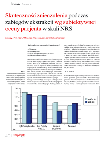 I Praktyka _ Znieczulenia Skuteczność znieczulenia podczas zabiegów ekstrakcji wg subiektywnej oceny pacjenta w skali NRS Autorzy _ Prof. ndzw. AM Andrzej Wojtowicz, Lek. dent. Barbara Wandzel _Znieczulenie w stomatologii powinno być: • efektywne, • atraumatyczne, • dobrze tolerowane przez pacjenta, • aplikowane bezboleśnie. Ryc.1_ Subiektywna ocena intensywnoÊci czucia bólu (wg 10-stopniowej skali NRS) w trakcie aplikacji (ig∏a/strzykawka, system Ultra Safety Plus XL, karpula Êródwi´zad∏owa, automat Anaeject) oraz w trakcie zabiegu. Wymienione efekty znieczulania do zabiegu zależą od dwóch grup czynników – jedna z nich to: natura, kondycja, fizjologia pacjenta, na którą składają się m.in. jego stan neuropsychologiczny i ogólny stan zdrowia; druga to czynniki niezależne od pacjenta,a oceniane przez niego subiektywnie: rodzaj środka znieczulającego, siła środka wyrażanego jego stężeniem i dodatkiem lub brakiem środków obkurczających naczynia, a także sposób podawania środka znieczulającego. Postęp w stomatologii mierzy się także pojawianiem się procesorów do atraumatycznego podawania środka znieczulającego. Należy jednak w tym aspekcie uwzględniać anatomiczne miejsce aplikacji (np.: ekstrakcja operacyjna dolnego zęba mądrości,w której bezzasadna jest próba podania znieczulenia śródwięzadłowego, gdyż wymagane jest m.in. znieczulenie otaczającej ząb okostnej z uwagi na konieczność zdjęcia blaszki kostnej). Wykorzystanie automatu nie jest uzasadnione w trakcie zabiegu operacyjnego, podczas którego niejednokrotnie należy podać dodatkową porcję znieczulenia, a automat (forma pistoletu) nie jest autoklawowalny z uwagi na delikatne wewnętrzne procesory. _Cel pracy Celem badania była ocena porównawcza skuteczności 4 metod aplikacji środka znieczulającego podczas ekstrakcji zębów oraz analiza zależności między techniką podanego znieczulenia a obiektywną oceną i subiektywnym odczuciem bólu 1,6 1,4 1,2 wk∏ucie zabieg 1 0,8 0,6 0,4 0,2 0 Ryc. 1 ig∏a/strzykawka Ultra Safety Plus XL 40 I implants 2_ 2007 karpula Êròdwi´z. Anaeject I Praktyka _ Znieczulenia przez pacjenta w trakcie iniekcji i zabiegu. _Pacjenci i metody W badaniu uczestniczyło 40 osób (20 kobiet i 20 mężczyzn) o średniej wieku 40 lat, podzielonych na 4 grupy, otrzymujących znieczulenie przy wykorzystaniu jednej z metod aplikacji znieczulenia: • znieczulenie igłą i strzykawką, • karpula do znieczyleń śródwięzadłowych, • system Ultra Safety Plus XL, • automat Anaeject. Ryc. 2a i 2b _ Automat Anaeject. 42 I implants 2_ 2007 Ryc. 2a Wyselekcjonowano osoby z brakiem przeciwwskazań do zastosowania dodatku środka obkurczającego w znieczuleniu. Do znieczulenia w każdej grupie pacjentów użyto 2% Xylonor, podając stopniowo miejscowe znieczulenie w szczęce. Wykonano zabiegi ekstrakcji zębów trzonowych ze wskazań protetycznych w warunkach ambulatoryjnych bez dodawania środków znieczulających w trakcie zabiegu, zakładając podobny czas zabiegu i analogiczne warunki jego wykonania (godziny poranne,bez uprzedniej antybiotykoterapii osłonowej i środków przeciwbólowych). Pacjenci tuż po zabiegu otrzymali do wypełnie- AD Ryc. 2b nia ankiety zawierające m.in. dwie 10-stopniowe skale bólu NRS w postaci dwóch 10 cm linii,na których „0” oznacza brak dolegliwości bólowych,a 10 maksymalny wyobrażalny przez pacjenta ból. Jest to prosty test kliniczny,wykorzystywany m.in. do badań klinicznych wg standardów GCP (Good Clinical Practice) leków przeciwbólowych. Na pierwszej linii pacjenci zaznaczali punkt oceny subiektywnej intensywności bólu podczas wkłucia igły i w trakcie zabiegu w 10-stopniowej numerycznej skali bólu (NRS). Na drugiej linii - punkt subiektywnej oceny intensywności bólu podczas zabiegu przed założeniem szwów chirurgicznych. Uzyskane wyniki testów NRS dla poszczególnych metod aplikacji znieczuleń przedstawiono w postaci histogramów średniej X+_SD. _Dyskusja Na podstawie przeprowadzonej subiektywnej analizy bólu w trakcie znieczulenia można stwierdzić, iż najbardziej komfortową metodą podawania znieczulenia jest aplikacja znieczulenia śródwięzadłowego przy wykorzystaniu karpuli. Ta pozytywna ocena pacjentów wynika z kilku powodów: 1. znieczulenie śródwięzadłowe znieczula skutecznie pojedynczy ząb (wkłucie do ozębnej odbywa się w 4 punktach wokół 3 korzeni górnych zębów trzonowych i jest wystarczające), 2. nie ma potrzeby dodatkowego znieczulenia okostnej dystalnie od strony przedsionka i podniebienia (nie ma efektu znieczulenia tylnej części podniebienia i czasowego dyskomfortu w przełykaniu śliny), 3. objętość podawanego środka znieczulającego jest o ok. 70% niższa niż w przypadku klasycznego znieczulenia okostnej i ozębnej. I Praktyka _ Znieczulenia Ryc.3_ System do wykonywania znieczuleƒ Ultra Safety Plus XL. Ryc. 3 _Kontakt Prof. ndzw. AM Andrzej Wojtowicz– Kierownik Zak∏adu Chirurgii Stomatologicznej Akademii Medycznej w Warszawie. Lek. dent. Barbara Wandzel – Zak∏ad Chirurgii Stomatologicznej Akademii Medycznej w Warszawie. 44 I implants 2_ 2007 Nie analizowano czasu, po jakim ustępuje znieczulenie śródwięzadłowe aplikowane w celu ekstrakcji zęba. Analizując nasilenie bólu związanego z aplikacją znieczulenia przy wykorzystaniu procesora automatu Anaeject, stwierdzono zbliżoną wartość punktu NRS, jak dla znieczulenia śródwięzadłowego. Wartość punktu NRS była wyższa w znieczuleniu automatem,co wynika prawdopodobnie z konieczności wkłuć igły zarówno od strony przedsionka, jak i podniebienia. Istnieją obserwacje, z których wynika, iż znieczulenie gałęzi nn. zębodołowych górnych może być całkowicie wykonane wkłuciem igły do okostnej od strony przedsionkowej, bez potrzeby wtłaczania środka w podniebienie. Samo urządzenie o dużej estetyce i ergonomii zmniejsza stres pacjenta związany z o
