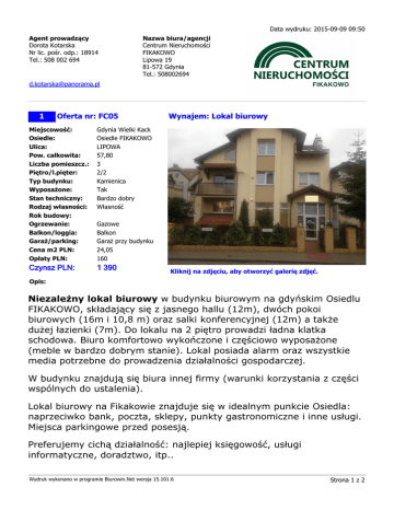 Data wydruku: 2015-09-09 09:50 Agent prowadzący Dorota Kotarska Nr lic. pośr. odp.: 18914 Tel.: 508 002 694 Nazwa biura/agencji Centrum Nieruchomości FIKAKOWO Lipowa 19 81-572 Gdynia Tel.: 508002694 [email protected] 1 Oferta nr: FC05 Miejscowość: Osiedle: Ulica: Pow. całkowita: Liczba pomieszcz.: Piętro/l.pięter: Typ budynku: Wyposażone: Stan techniczny: Rodzaj własności: Rok budowy: Ogrzewanie: Balkon/loggia: Garaż/parking: Cena m2 PLN: Opłaty PLN: Gdynia Wielki Kack Osiedle FIKAKOWO LIPOWA 57,80 3 2/2 Kamienica Tak Bardzo dobry Własność Czynsz PLN: 1 390 Wynajem: Lokal biurowy Gazowe Balkon Garaż przy budynku 24,05 160 Kliknij na zdjęciu, aby otworzyć galerię zdjęć. Opis: Niezależny lokal biurowy w budynku biurowym na gdyńskim Osiedlu FIKAKOWO, składający się z jasnego hallu (12m), dwóch pokoi biurowych (16m i 10,8 m) oraz salki konferencyjnej (12m) a także dużej łazienki (7m). Do lokalu na 2 piętro prowadzi ładna klatka schodowa. Biuro komfortowo wykończone i częściowo wyposażone (meble w bardzo dobrym stanie). Lokal posiada alarm oraz wszystkie media potrzebne do prowadzenia działalności gospodarczej. W budynku znajdują się biura innej firmy (warunki korzystania z części wspólnych do ustalenia). Lokal biurowy na Fikakowie znajduje się w idealnym punkcie Osiedla: naprzeciwko bank, poczta, sklepy, punkty gastronomiczne i inne usługi. Miejsca parkingowe przed posesją. Preferujemy cichą działalność: najlepiej księgowość, usługi informatyczne, doradztwo, itp.. Wydruk wykonano w programie Biurowin.Net wersja 15.101.6 Strona 1 z 2 Niskie opłaty eksploatacyjne: ok 160 zł plus prąd. Czynsz dla właściciela netto 1390 zł + 23% Vat. Hall recepcyjny salka konferencyjna Klatka schodowa Klatka schodowa wejscie do biur łazienka Dane właściciela nieruchomości Nazwa i adres właściciela: Telefony właściciela: E-mail właściciela: Wydrukowane informacje nie są ofertą w rozumieniu przepisów prawa. Mają one jedynie charakter informacyjny. Wydruk wykonano w programie Biurowin.Net wersja 15.101.6 Strona 2 z 2