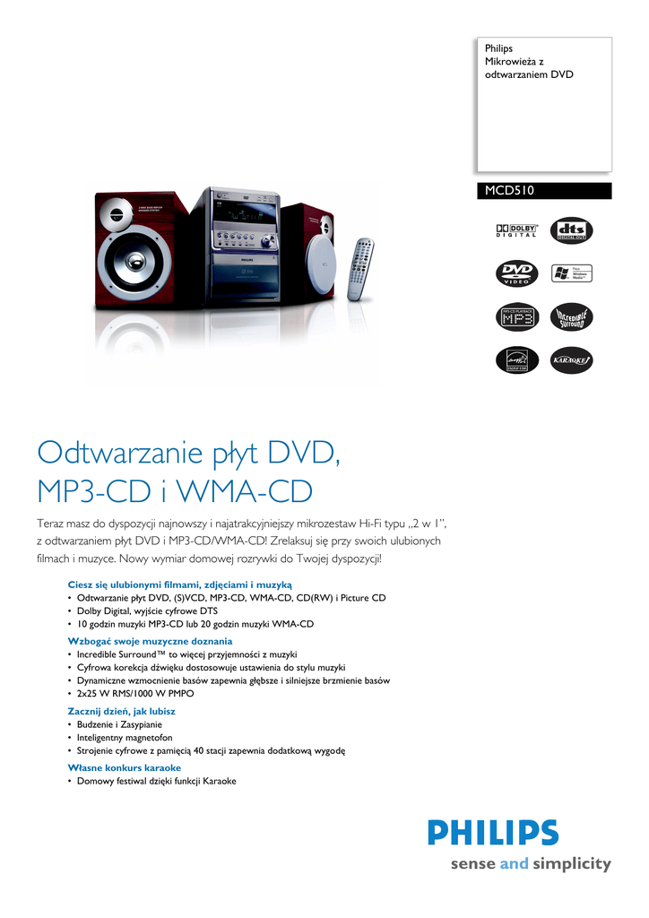Philips Mikrowieża z odtwarzaniem DVD MCD510 Odtwarzanie płyt DVD, MP3-CD i WMA-CD Teraz masz do dyspozycji najnowszy i najatrakcyjniejszy mikrozestaw Hi-Fi typu „2 w 1”, z odtwarzaniem płyt DVD i MP3-CD/WMA-CD! Zrelaksuj się przy swoich ulubionych filmach i muzyce. Nowy wymiar domowej rozrywki do Twojej dyspozycji! Ciesz się ulubionymi filmami, zdjęciami i muzyką • Odtwarzanie płyt DVD, (S)VCD, MP3-CD, WMA-CD, CD(RW) i Picture CD • Dolby Digital, wyjście cyfrowe DTS • 10 godzin muzyki MP3-CD lub 20 godzin muzyki WMA-CD Wzbogać swoje muzyczne doznania • Incredible Surround™ to więcej przyjemności z muzyki • Cyfrowa korekcja dźwięku dostosowuje ustawienia do stylu muzyki • Dynamiczne wzmocnienie basów zapewnia głębsze i silniejsze brzmienie basów • 2x25 W RMS/1000 W PMPO Zacznij dzień, jak lubisz • Budzenie i Zasypianie • Inteligentny magnetofon • Strojenie cyfrowe z pamięcią 40 stacji zapewnia dodatkową wygodę Własne konkurs karaoke • Domowy festiwal dzięki funkcji Karaoke MCD510/14 Mikrowieża z odtwarzaniem DVD Dane techniczne Zalety produktu Dźwięk • Funkcje poprawy dźwięku: Incredible Surround, 4 tryby cyfrowej korekcji dźwięku, Dynamiczne wzmocnienie basów • System dźwięku: Dolby Digital, Wyjście cyfrowe DTS • Moc wyjściowa: 2x25 W RMS, 1000 W PMPO Głośniki • Główny głośnik: 2-drożny, Niskotonowy 4 cale, Zest. gł. z syst. Bass Reflex, Wysokotonowy piezo, Odłączane osłony głośników Odtwarzanie wideo • Odtwarzane nośniki: DVD+RW, DVD-Video, Video CD/SVCD, Picture CD • Region DVD: 5 linii • Tryby odtwarzania płyt: Powiększenie, Odtwarzanie w zwolnionym tempie, Odtwarzanie od momentu zatrzymania, Odtwarzanie wielokrotne A-B Odtwarzanie audio • Odtwarzane nośniki: WMA-CD, MP3-CD, CD-R, CD-RW, płyta CD • Tryby odtwarzania płyt: Programowanie 20 utworów, Odtw. wielokr./ścieżki/wszys./płyty, Odtwarzanie w kolejności losowej • Sposób ładowania: Góra • technologia magnetofonów kasetowych: Sterowanie cyfrowe • Tryby odtwarzania kasety: Elektroniczna regulacja prędkości, Full Auto Stop, Licznik taśmy Nagrywanie audio • Nośnik nagrywania: Taśma • Funkcje dotyczące nagryw. na kasecie: zsynchronizowane nagrywanie z CD, Timer nagrywania z tunera, automatyczny poziom nagrywania Tuner/odbiór/transmisja • • • • Pasma tunera: UKF Stereo, ŚR. Automatyczne dostrajanie cyfrowe Pamięć stacji: 40 Funkcje i cechy dotyczące tunera: Automatyczny zapis stacji Możliwości połączeń • Wyjście wideo – analogowe: Wyjście składowych Y Pb Pr (cinch), Kompozytowe CVBS (żółty cinch), S-Video (Hosiden) • Inne połączenia: Wyjście aktywnego subwoofera, Koncentryczne wyjście cyfrowe, Wyjście liniowe, Antena zakresu UKF, Antena zakresu fal ŚR. • Wejście AUX: 2x(L/P) / RCA • Słuchawki: 3,5 mm Wygoda • Karaoke: Głośność mikrofonu, Regulacja tonacji, Regulacja echa • Budzenie: Wyłącznik czasowy • Zegar: Na wyświetlaczu głównym • Typ wyświetlacza: Wyświetlacz VFD • Języki menu ekranowego: angielski, francuski, hiszpański, portugalski • zasilanie Eco Power Standby: 1 W Akcesoria • Akcesoria w zestawie: Kompozytowy przewód wideo (Y), Przewód audio, Antena zakresu UKF/ ŚR. • Pilot zdalnego sterowania: 45-przyciskowy z 2 bateriami AA Wymiary • Wymiary zestawu (szer. x wys. x gł.): 175 x 254 x 315 mm • Wymiary głośnika głównego (szer. x wys. x gł.): 175 x 254 x 214 mm • Wymiary opakowania (szer. x wys. x gł.): 408 x 348 x 524 mm • Waga wraz z opakowaniem: 12 9 kg • Odtwarzacz płyt MP3-CD i WMA-CD MP3 to rewolucyjna technologia kompresji, dzięki której duże pliki muzyczne można 10-krotnie pomniejszyć, nie tracąc prawie nic na jakości dźwięku. Na pojedynczej płycie CD można zapisać do 10 godzin muzyki. Dzięki możliwości szybkiego i łatwego przesyłania dźwięku, format MP3 stał się standardowym sposobem kompresji dźwięku. Windows Media Audio (WMA) to format kompresji dźwięku firmy Microsoft zapewniający świetną jakość dźwięku przy dwukrotnie zmniejszonej objętości pliku. Na jednej płycie CD można zapisać do 20 godzin muzyki w formacie WMA nagranej z szybkością przesyłu 64 kb/s. Technologia Incredible Surround™ Incredible Surround™ to technologia audio firmy Philips, która, za pomocą najnowocześniejszych metod elektronicznego przesunięcia fazowego, sprawia, że dźwięk z lewego i prawego kanału jest miksowany w ten sposób, aby zwiększyć wirtualną odległość między dwoma głośnikami. Większa rozpiętość znacznie uwydatnia efekt stereofoniczny i tworzy naturalniejszy wymiar dźwięku. Incredible Surround™ umożliwia przeżywanie całkowicie przestrzennego efektu z większą głębią i rozpiętością dźwięku, bez korzystania z dodatkowych głośników. Cyfrowa korekcja dźwięku (DSCl) Funkcja cyfrowej korekcji dźwięku oferuje wybór wstępnie zaprogramowanych ustawień korektora — jazz, rock, pop i muzyka klasyczna — pozwalających na zoptymalizowanie zakresów częstotliwości dla różnych stylów muzycznych. Każdy tryb wykorzystuje technologię korekcji graficznej w celu automatycznego dostrojenia balansu dźwięku i uwydatnienia jego częstotliwości mających największe znaczenie w danym stylu. Dzięki precyzyjnemu dostosowaniu balansu dźwięku do gatunku muzycznego, funkcja korekcji dźwięku pozwala czerpać maksymalną przyjemność ze słuchania muzyki. Dynamiczne wzmocnienie basów Dynamiczne wzmocnienie tonów niskich (DBB) to robiące duże wrażenie uwydatnienie basów w nagraniu muzycznym w całym zakresie ustawień głośności — od niskiego do wysokiego — za jednym naciśnięciem przycisku! Ustawienie głośności na niskim poziomie powoduje zazwyczaj utratę dolnych niskotonowych częstotliwości dźwięku. Aby do tego nie dopuścić, można włączyć dynamiczne wzmocnienie basów, które pozwala słuchać pełnego dźwięku nawet