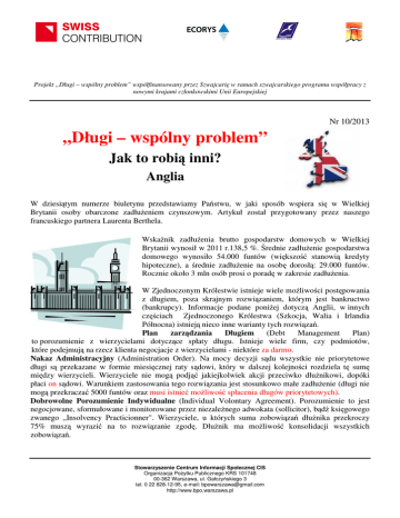 Projekt „Długi – wspólny problem” współfinansowany przez Szwajcarię w ramach szwajcarskiego programu współpracy z nowymi krajami członkowskimi Unii Europejskiej Nr 10/2013 „Długi – wspólny problem” Jak to robią inni? Anglia W dziesiątym numerze biuletynu przedstawiamy Państwu, w jaki sposób wspiera się w Wielkiej Brytanii osoby obarczone zadłużeniem czynszowym. Artykuł został przygotowany przez naszego francuskiego partnera Laurenta Berthela. Wskaźnik zadłużenia brutto gospodarstw domowych w Wielkiej Brytanii wynosił w 2011 r.138,5 %. Średnie zadłużenie gospodarstwa domowego wynosiło 54.000 funtów (większość stanowią kredyty hipoteczne), a średnie zadłużenie na osobę dorosłą: 29.000 funtów. Rocznie około 3 mln osób prosi o poradę w zakresie zadłużenia. W Zjednoczonym Królestwie istnieje wiele możliwości postępowania z długiem, poza skrajnym rozwiązaniem, którym jest bankructwo (bankrupcy). Informacje podane poniżej dotyczą Anglii, w innych częściach Zjednoczonego Królestwa (Szkocja, Walia i Irlandia Północna) istnieją nieco inne warianty tych rozwiązań. Plan zarządzania Długiem (Debt Management Plan) to porozumienie z wierzycielami dotyczące spłaty długu. Istnieje wiele firm, czy podmiotów, które podejmują na rzecz klienta negocjacje z wierzycielami - niektóre za darmo. Nakaz Administracyjny (Administration Order). Na mocy decyzji sądu wszystkie nie priorytetowe długi są przekazane w formie miesięcznej raty sądowi, który w dalszej kolejności rozdziela tę sumę między wierzycieli. Wierzyciele nie mogą podjąć jakiejkolwiek akcji przeciwko dłużnikowi, dopóki płaci on sądowi. Warunkiem zastosowania tego rozwiązania jest stosunkowo małe zadłużenie (długi nie mogą przekraczać 5000 funtów oraz musi istnieć możliwość spłacenia długów priorytetowych). Dobrowolne Porozumienie Indywidualne (Individual Volontary Agreement). Porozumienie to jest negocjowane, sformułowane i monitorowane przez niezależnego adwokata (sollicitor), bądź księgowego zwanego „Insolvency Practicionner". Wierzyciele, u których suma zobowiązań dłużnika przekroczy 75% muszą wyrazić na to rozwiązanie zgodę. Dłużnik ma możliwość konsolidacji wszystkich zobowiązań. Stowarzyszenie Centrum Informacji Społecznej CIS Organizacja Pożytku Publicznego KRS 101748 00-362 Warszawa, ul. Gałczyńskiego 3 tel. 0 22 828-12-95, e-mail: [email protected] http://www.bpo.warszawa.pl Projekt „Długi – wspólny problem” współfinansowany przez Szwajcarię w ramach szwajcarskiego programu współpracy z nowymi krajami członkowskimi Unii Europejskiej Nakaz o Umorzenie Długu (Debt Relief Order). Rozwiązanie to stosowane jest w przypadku osób średnio zadłużonych (do 15000 funtów zadłużenia), z bardzo ograniczonymi możliwościami spłaty, wynoszącymi mniej niż 50 funtów miesięcznie dostępnych po zapłaceniu rachunków domowych. Po roku wszystkie długi zapisane w tym nakazie są umorzone. Można ubiegać się o Debt Relief Order tylko za pośrednictwem wykwalifikowanego doradcy. W Wielkiej Brytanii istnieje również wiele organizacji, które pomagają osobom zadłużonym. Niektóre z nich świadczą usługi przede wszystkim określonym grupom dłużników, bądź w kontekście uruchomienia i przeprowadzenia określonej procedury oddłużeniowej. Informacje o poradnictwie dla osób zadłużonych są dostępne w raporcie „Debt Advice in the UK” przygotowanym na zlecenie Money Advice Service (niezależna organizacja, powołana przez rząd w 2010 r., która działa w zakresie edukacji finansowej dla mieszkańców Wielkiej Brytanii). Wiele podmiotów świadczy usługi osobom zadłużonym w ramach działalności komercyjnej. Jednak w większości przypadków, opłata jest podnoszona jedynie w przypadku zawarcia porozumienia z wierzycielami (Debt Management Plan, Individual Voluntary Agreement). Funkcjonuje też wiele podmiotów, świadczących osobom zadłużonym bezpłatne usługi: • Citizens Advice Bureaux (odpowiedniki i pierwowzór polskich Biur Porad Obywatelskich). Organizacje te przyjmują najwięcej (31%) gospodarstw domowych szukających porad w zakresie zadłużenia. Organizacje te finansowane są w większości przez rząd, jednak otrzymują również znaczne dotacje z sektora prywatnego. CAB są najczęściej wymieniane w literaturze jako świadczące porady i są najbardziej znane wśród mieszkańców Wysp Brytyjskich. • Consumer Credit Counselling Service (CCCS), do których się zwraca 24% zadłużonych gospodarstw domowych. Mają największy udział w opracowaniu bezpłatnych Planów Zarządzania Długiem (Debt Management Plan). Jedynym źródłem finansowania ich działalności doradczej jest tzw. schemat „FairShare”, w ramach którego 10% odzyskanego długu zostanie wpłacone przez wierzyciela jako darowizna. • Money Advice Trust (MAT) przyjmuje 12% osób zadłużonych. MAT uruchomiło poradnictwo telefoniczne Business Debtline (BDL) oraz National Debtline (NDL). Organizacja otrzymuje dotacje zarówno z sektora prywatnego (52%) jak i publicznego (48%). • Payplan obsługuje ok. 9% osób zadłużonych. Stosuje również schemat „FairShare”. Organizacja działa przede wszystkim przy zawarciu Debt Management Plans. Jeśli powyżej opisane rozwiązania są dla Państwa interesujące, lub nasuwają się jakieś pytania, prosimy - piszcie do nas. Zapraszamy również do wypełnienia ankiety umieszczonej na stronie internetowej projektu. Stowarzyszenie Centrum Informacji Społecznej CIS Organizacja Pożytku Publicznego KRS 101748 00-362 Warszawa, ul. Gałczyńskiego 3 tel. 0 22 828-12-95, e-mail: [email protected] http://www.bpo.warszawa.pl