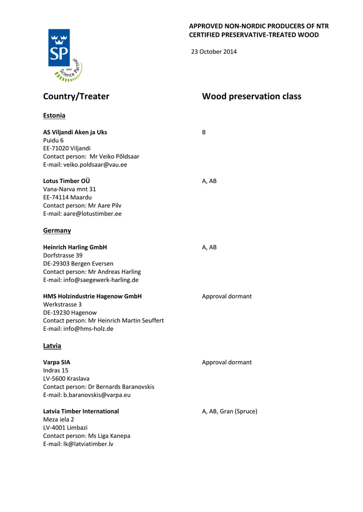 APPROVED NON-NORDIC PRODUCERS OF NTR CERTIFIED PRESERVATIVE-TREATED WOOD 23 October 2014 Country/Treater Wood preservation class Estonia AS Viljandi Aken ja Uks Puidu 6 EE-71020 Viljandi Contact person: Mr Veiko Põldsaar E-mail: [email protected] B Lotus Timber OÜ Vana-Narva mnt 31 EE-74114 Maardu Contact person: Mr Aare Pilv E-mail: [email protected] A, AB Germany Heinrich Harling GmbH Dorfstrasse 39 DE-29303 Bergen Eversen Contact person: Mr Andreas Harling E-mail: [email protected] A, AB HMS Holzindustrie Hagenow GmbH Werkstrasse 3 DE-19230 Hagenow Contact person: Mr Heinrich Martin Seuffert E-mail: [email protected] Approval dormant Latvia Varpa SIA Indras 15 LV-5600 Kraslava Contact person: Dr Bernards Baranovskis E-mail: [email protected] Approval dormant Latvia Timber International Meza iela 2 LV-4001 Limbazi Contact person: Ms Liga Kanepa E-mail: [email protected] A, AB, Gran (Spruce) APPROVED NON-NORDIC PRODUCERS OF NTR CERTIFIED PRESERVATIVE-TREATED WOOD 23 October 2014 Country/Treater Wood preservation class Latvia, cont’d SIA Biko-Lat Lačpleša iela 75-5 LV-1011 Riga Contact person: Mr Raitis Zaka E-mail: [email protected] A, AB Lithuania UAB Polywood Kestucio 51 LT-08124 Vilnius Contact person: Mr Rolandas Zachrevicius E-mail: [email protected] A, AB Poland Dankros Sp. Z.o.o. Ustanowa Górna 98B PL-38-700 Ustrzyki Dolne Contact person: Mr Ryszard Szukalski E-mail: [email protected] M, A Lechma Industry Sp. Z.o.o. Swidowiec 38 PL-66-320 Trzciel Contact person: Mr Radoslaw Kudla E-mail: [email protected] AB Martyna Sp. z o.o. PL-62-106 Rąbczyn 22 Contact: Mr Marcin Switajski E-mail [email protected] AB Nor-Dan Sp. z o.o. ul. Fabryczna 16 PL-64-200 Wolsztyn Contact person: Maciej Sosinski E-mail: [email protected] B APPROVED NON-NORDIC PRODUCERS OF NTR CERTIFIED PRESERVATIVE-TREATED WOOD 23 October 2014 Country/Treater Wood preservation class Poland, cont’d PPD Poltarex Sp. z o.o. ul. Zeromskiego 9/10 PL-84-300 Lebork Contact person: Ms Malgorzata Kubiak E-mail: [email protected] PPD Poltarex Sp. z o.o./Sawmill Damnica ul. Przemyslowa 4 PL-76-231 Damnica Contact person: Mr Dariusz Plaga E-mail: [email protected] A, AB PPD Poltarex Sp. z o.o./Sawmill Polnica PL-77-323 Polnica Contact person: Mr Krzysztof Majchrzak E-mail: [email protected] A, AB PPD Poltarex Sp. z o.o./Sawmill Bielsko Pomorskie A, AB PL-77-220 Koczala Contact person: Mr Tadeusz Lisowski E-mail: [email protected] Zetbeer Sp. z o.o. Orzeszkowo 29 PL-64-420 Kwilcz Contact person: Ms Katarzyna Sobieraj E-mail: [email protected] A