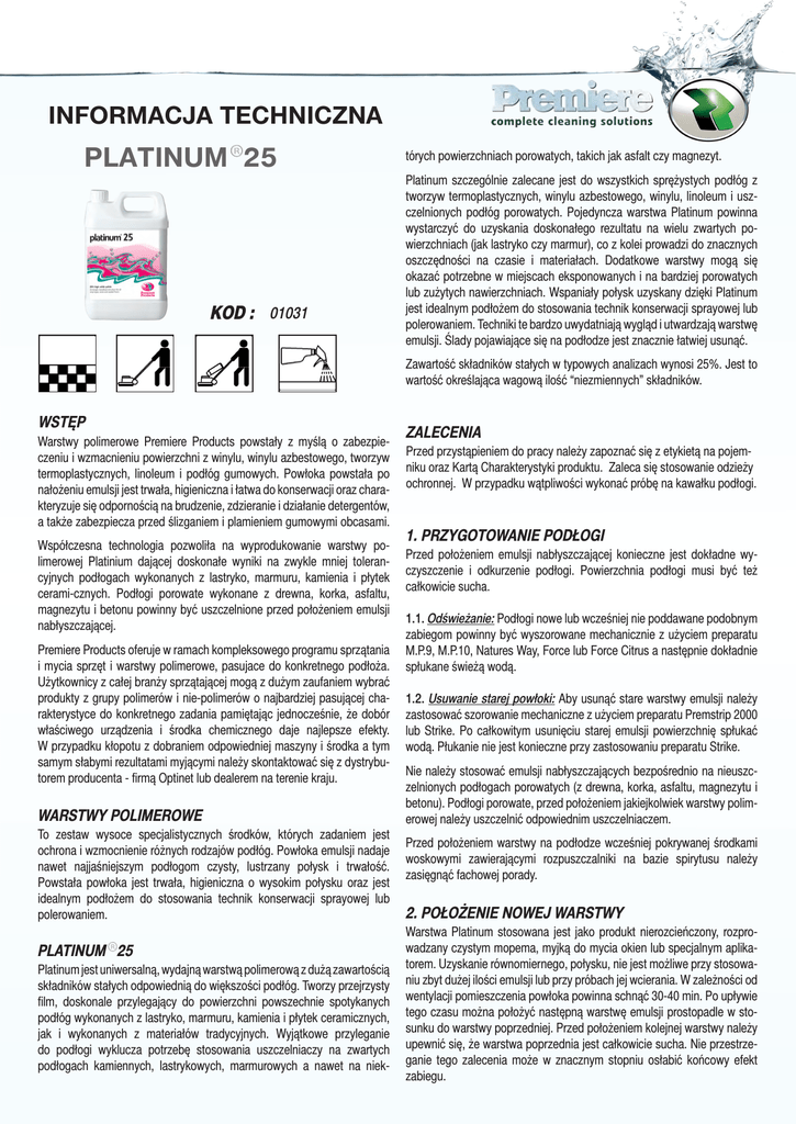 INFORMACJA TECHNICZNA PLATINUM 25 KOD : 01031 tórych powierzchniach porowatych, takich jak asfalt czy magnezyt. Platinum szczególnie zalecane jest do wszystkich sprężystych podłóg z tworzyw termoplastycznych, winylu azbestowego, winylu, linoleum i uszczelnionych podłóg porowatych. Pojedyncza warstwa Platinum powinna wystarczyć do uzyskania doskonałego rezultatu na wielu zwartych powierzchniach (jak lastryko czy marmur), co z kolei prowadzi do znacznych oszczędności na czasie i materiałach. Dodatkowe warstwy mogą się okazać potrzebne w miejscach eksponowanych i na bardziej porowatych lub zużytych nawierzchniach. Wspaniały połysk uzyskany dzięki Platinum jest idealnym podłożem do stosowania technik konserwacji sprayowej lub polerowaniem. Techniki te bardzo uwydatniają wygląd i utwardzają warstwę emulsji. Ślady pojawiające się na podłodze jest znacznie łatwiej usunąć. Zawartość składników stałych w typowych analizach wynosi 25%. Jest to wartość określająca wagową ilość “niezmiennych” składników. WSTĘP Warstwy polimerowe Premiere Products powstały z myślą o zabezpieczeniu i wzmacnieniu powierzchni z winylu, winylu azbestowego, tworzyw termoplastycznych, linoleum i podłóg gumowych. Powłoka powstała po nałożeniu emulsji jest trwała, higieniczna i łatwa do konserwacji oraz charakteryzuje się odpornością na brudzenie, zdzieranie i działanie detergentów, a także zabezpiecza przed ślizganiem i plamieniem gumowymi obcasami. Współczesna technologia pozwoliła na wyprodukowanie warstwy polimerowej Platinium dającej doskonałe wyniki na zwykle mniej tolerancyjnych podłogach wykonanych z lastryko, marmuru, kamienia i płytek cerami-cznych. Podłogi porowate wykonane z drewna, korka, asfaltu, magnezytu i betonu powinny być uszczelnione przed położeniem emulsji nabłyszczającej. Premiere Products oferuje w ramach kompleksowego programu sprzątania i mycia sprzęt i warstwy polimerowe, pasujace do konkretnego podłoża. Użytkownicy z całej branży sprzątającej mogą z dużym zaufaniem wybrać produkty z grupy polimerów i nie-polimerów o najbardziej pasującej charakterystyce do konkretnego zadania pamiętając jednocześnie, że dobór właściwego urządzenia i środka chemicznego daje najlepsze efekty. W przypadku kłopotu z dobraniem odpowiedniej maszyny i środka a tym samym słabymi rezultatami myjącymi należy skontaktować się z dystrybutorem producenta - firmą Optinet lub dealerem na terenie kraju. WARSTWY POLIMEROWE To zestaw wysoce specjalistycznych środków, których zadaniem jest ochrona i wzmocnienie różnych rodzajów podłóg. Powłoka emulsji nadaje nawet najjaśniejszym podłogom czysty, lustrzany połysk i trwałość. Powstała powłoka jest trwała, higieniczna o wysokim połysku oraz jest idealnym podłożem do stosowania technik konserwacji sprayowej lub polerowaniem. PLATINUM 25 Platinum jest uniwersalną, wydajną warstwą polimerową z dużą zawartością składników stałych odpowiednią do większości podłóg. Tworzy przejrzysty film, doskonale przylegający do powierzchni powszechnie spotykanych podłóg wykonanych z lastryko, marmuru, kamienia i płytek ceramicznych, jak i wykonanych z materiałów tradycyjnych. Wyjątkowe przyleganie do podłogi wyklucza potrzebę stosowania uszczelniaczy na zwartych podłogach kamiennych, lastrykowych, marmurowych a nawet na niek- ZALECENIA Przed przystąpieniem do pracy należy zapoznać się z etykietą na pojemniku oraz Kartą Charakterystyki produktu. Zaleca się stosowanie odzieży ochronnej. W przypadku wątpliwości wykonać próbę na kawałku podłogi. 1. PRZYGOTOWANIE PODŁOGI Przed położeniem emulsji nabłyszczającej konieczne jest dokładne wyczyszczenie i odkurzenie podłogi. Powierzchnia podłogi musi być też całkowicie sucha. 1.1. Odświeżanie: Podłogi nowe lub wcześniej nie poddawane podobnym zabiegom powinny być wyszorowane mechanicznie z użyciem preparatu M.P.9, M.P.10, Natures Way, Force lub Force Citrus a następnie dokładnie spłukane świeżą wodą. 1.2. Usuwanie starej powłoki: Aby usunąć stare warstwy emulsji należy zastosować szorowanie mechaniczne z użyciem preparatu Premstrip 2000 lub Strike. Po całkowitym usunięciu starej emulsji powierzchnię spłukać wodą. Płukanie nie jest konieczne przy zastosowaniu preparatu Strike. Nie należy stosować emulsji nabłyszczających bezpośrednio na nieuszczelnionych podłogach porowatych (z drewna, korka, asfaltu, magnezytu i betonu). Podłogi porowate, przed położeniem jakiejkolwiek warstwy polimerowej należy uszczelnić odpowiednim uszczelniaczem. Przed położeniem warstwy na podłodze wcześniej pokrywanej środkami woskowymi zawierającymi rozpuszczalniki na bazie spirytusu należy zasięgnąć fachowej porady. 2. POŁOŻENIE NOWEJ WARSTWY Warstwa Platinum stosowana jest jako produkt nierozcieńczony, rozprowadzany czystym mopema, myjką do mycia okien lub specjalnym aplikatorem. Uzyskanie równomiernego, połysku, nie jest możliwe przy stosowaniu zbyt dużej ilości emulsji lub przy próbach jej wcierania. W zależności od wentylacji pomieszczenia powłoka powinna schnąć 30-40 min. Po upływie tego czasu można położyć następną warstwę emulsji prostopadle w stosunku do warstwy poprzedniej. Przed położeniem kolejnej warstwy należy upewnić się, że warstwa poprzednia jest całkowicie sucha. Nie przestrzeganie tego zalecenia może w znacznym stopniu osłabić końcowy efekt zabiegu. PLATINUM 25 150 - 250 Poniższa tabela wskazuje sposób przygotowania roztworu preparatu: roztworem preparatu na powierzchni ok.3-5 m2 i jeszcze wilgotną polerować do sucha. Procedurę powtarzać na następnym, sąsiednim fragmencie podłogi. Należy stosować szorowarkę wysokoobrotową HS z czerwonym padem. O ile w szorowarka nie posiada odkurzacza, po zakończeniu zabiegu podłoga powinna zostać zamieciona mopem na sucho. wiadro 10 l. spryskiwacz 2 ml 40 ml