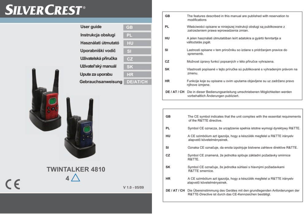 User guide GB Instrukcja obsługi PL Használati útmutató HU Uporabniški vodič SI Uživatelská příručka CZ Užívatel’ský manuál SK Upute za uporabu HR Gebrauchsanweisung DE/AT/CH GB The features described in this manual are published with reservation to modifications PL Właściwości opisane w niniejszej instrukcji obsługi są publikowane z zatrzeżeniem prawa wprowadzenia zmian. HU A jelen használati útmutatóban leírt adatokra a gyártó fenntartja a változtatás jogát. SI Lastnosti opisane v tem priročniku so izdane s pridržanjem pravice do sprememb. CZ Možnost úpravy funkcí popsaných v této příručce vyhrazena. SK Vlastnosti popísané v tejto príručke sú publikované s vyhradeným právom na zmenu. HR Funkcije koje su opisane u ovim uputama objavljene su uz zadržano pravo njihove izmjene. DE / AT / CH Die in dieser Bedienungsanleitung umschriebenen Möglichkeiten werden vorbehaltlich Änderungen publiziert. TWINTALKER 4810 4 V 1.0 - 05/09 GB The CE symbol indicates that the unit complies with the essential requirements of the R&TTE directive. PL Symbol CE oznacza, że urządzenie spełnia istotne wymogi dyrektywy R&TTE. HU A CE szimbólum azt igazolja, hogy a készülék megfelel a R&TTE irányelv alapvető követelményeinek. SI Oznaka CE označuje, da enota izpolnjuje bistvene zahteve direktive R&TTE. CZ Symbol CE znamená, že jednotka splòuje základní požadavky smìrnice R&TTE. SK Symbol CE označuje, že jednotka súhlasí s hlavnými požiadavkami R&TTE smernice. HR A CE szimbólum azt igazolja, hogy a készülék megfelel a R&TTE irányelv alapvető követelményeinek. DE / AT / CH Die Übereinstimmung des Gerätes mit den grundlegenden Anforderungen der R&TTE-Directive ist durch das CE-Kennzeichen bestätigt. A B 3 12 13 14 15 1 2 11 16 17 18 24 23 10 4 5 6 9 22 21 8 20 19 7 26 25 C D Twintalker 4810 Introduction 5 2 Intended purpose 5 3 CE Mark 5 4 4.1 4.2 4.3 4.4 4.5 4.6 4.7 Safety instructions General Burning injuries Injuries Danger of explosion Poisoning danger Legal Notes 5 5 5 5 6 6 6 6 5 Cleaning and maintenance 6 6 Disposal of the device (environment) 7 7 Using a PMR device 7 8 Included in the package 7 9 9.1 9.2 Getting started Installing/Removing the Belt Clip Battery Installation 8 8 8 10 Charging the batteries 9 11 Description 9 12 LCD display information 10 13 13.1 13.2 13.3 13.4 13.5 13.6 13.7 Using the Twintalker 4810 Turning the Unit ON/OFF Battery Charge Level/Low Battery Indication Adjusting Speaker Volume Receiving a Signal Transmitting a Signal Changing Channels CTCSS (Continious Tone Coded Squelch System) / DCS (Digital Coded Squelch) Monitor VOX Selection Channel Scan Call Tones Roger Beep On/Off Key-Tone On/Off Dual Channel Monitor function Button Lock Stopwatch function Display back light 10 10 10 11 11 11 12 13.8 13.9 13.10 13.11 13.12 13.13 13.14 13.15 13.16 13.17 Twintalker 4810 ENGLISH 1 12 13 13 14 15 15 16 16 16 17 17 3 Twintalker 4810 14 Earpiece connection 17 15 Troubleshooting 18 16 Technical specifications 18 17 Service address and hotline support 19 18 Declaration of conformity and manufacturer 19 19 19.1 19.2 19.3 Warranty Warranty period Warranty handling Warranty exclusions 20 20 20 20 4 Twintalker 4810 Twintalker 4810 Introduction Thank you for purchasing the Twintalker 4810. It’s a long range, low powered radio communication device with a range of maximum 8 Km. It has no running costs other than the minimal cost of re-charging the batteries. The Twintalker operates on 8 channels. The Twintalker is protected against vertically falling water drops when enclosure tilted up to 15° according to the IPX2 standard. 2 Intended purpose It can be used for recreational purposes. For example: to keep in contact during travelling with 2 or more cars, biking, skiing. It can be used to keep in contact with your children when they are playing outside, etc... 3 CE Mark The CE symbol on the unit, user guide and giftbox indicates that the unit complies with the essential requirements of the R&TTE directive 1995/5/EC. 4 Safety instructions 4.1 General Please read carefully through the following information concerning safety and proper use. Make yourself familiar with all functions of the device. Keep this manual in a safe place for future use. 4.2 Burning injuries • • 4.3 If the cover of the antenna is damaged, do not touch because when an antenna comes in contact with the skin, a minor burn may result when transmitting. Batteries can cause property damage such as burns if conductive material such as jewellery, keys or beaded chains touches exposed terminals.The material may complete an electrical circuit (short circuit) and become quite hot. Exercise care in handling any charged battery, particularly when placing it inside a pocket, purse or other container with metal objects. Injuries • • • Do not place your device in the area over an air bag or in the air bag deployment area. Air bags inflate with great force. If a PMR is placed in the bag deployment area and the air bag inflates, the communicator may be propelled with great force and cause serious injury to the occupants of the vehicle. Keep the PMR at least 15 centimetres away from a pacemaker. Turn your PMR OFF as soon as interference is taking place with medical equipment. Twintalker 4810 5 ENGLISH 1 Twintalker 4810 4.4 Danger of explosion • • • Do not replace batteries in a potentially explosive atmosphere. Contact sparking may occur while installing or removing batteries and cause an explosion. Turn your PMR off when in any area with a potentially explosive atmosphere. Sparks in such areas could cause an explosion or fire resulting in bodily injury or even death. Never throw batteries in fire as they may explode. Areas with potentially explosive atmospheres are often, but not always, clearly marked. They include fuelling areas such as below deck on boats, fuel or chemical transfer or storage facilities; areas where the air contains chemical