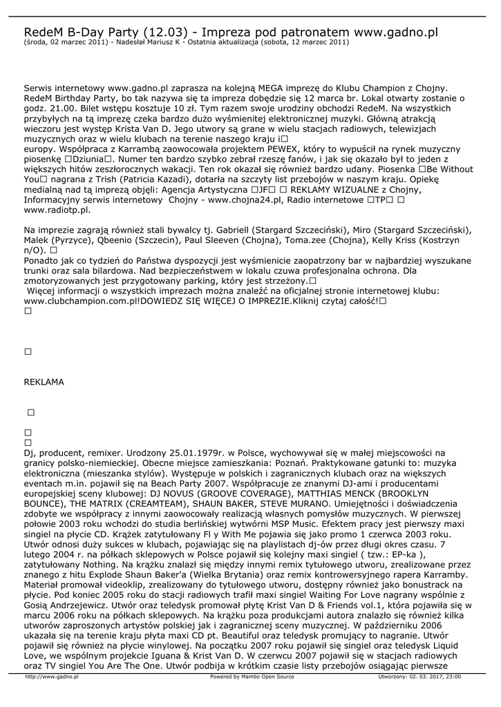 RedeM B-Day Party (12.03) - Impreza pod patronatem www.gadno.pl (środa, 02 marzec 2011) - Nadesłał Mariusz K - Ostatnia aktualizacja (sobota, 12 marzec 2011) Serwis internetowy www.gadno.pl zaprasza na kolejną MEGA imprezę do Klubu Champion z Chojny. RedeM Birthday Party, bo tak nazywa się ta impreza dobędzie się 12 marca br. Lokal otwarty zostanie o godz. 21.00. Bilet wstępu kosztuje 10 zł. Tym razem swoje urodziny obchodzi RedeM. Na wszystkich przybyłych na tą imprezę czeka bardzo dużo wyśmienitej elektronicznej muzyki. Główną atrakcją wieczoru jest występ Krista Van D. Jego utwory są grane w wielu stacjach radiowych, telewizjach muzycznych oraz w wielu klubach na terenie naszego kraju i europy. Współpraca z Karrambą zaowocowała projektem PEWEX, który to wypuścił na rynek muzyczny piosenkę Dziunia. Numer ten bardzo szybko zebrał rzeszę fanów, i jak się okazało był to jeden z większych hitów zeszłorocznych wakacji. Ten rok okazał się również bardzo udany. Piosenka Be Without You nagrana z Trish (Patricia Kazadi), dotarła na szczyty list przebojów w naszym kraju. Opiekę medialną nad tą imprezą objęli: Agencja Artystyczna JF REKLAMY WIZUALNE z Chojny, Informacyjny serwis internetowy Chojny - www.chojna24.pl, Radio internetowe TP www.radiotp.pl. Na imprezie zagrają również stali bywalcy tj. Gabriell (Stargard Szczeciński), Miro (Stargard Szczeciński), Malek (Pyrzyce), Qbeenio (Szczecin), Paul Sleeven (Chojna), Toma.zee (Chojna), Kelly Kriss (Kostrzyn n/O). Ponadto jak co tydzień do Państwa dyspozycji jest wyśmienicie zaopatrzony bar w najbardziej wyszukane trunki oraz sala bilardowa. Nad bezpieczeństwem w lokalu czuwa profesjonalna ochrona. Dla zmotoryzowanych jest przygotowany parking, który jest strzeżony. Więcej informacji o wszystkich imprezach można znaleźć na oficjalnej stronie internetowej klubu: www.clubchampion.com.pl!DOWIEDZ SIĘ WIĘCEJ O IMPREZIE.Kliknij czytaj całość! REKLAMA Dj, producent, remixer. Urodzony 25.01.1979r. w Polsce, wychowywał się w małej miejscowości na granicy polsko-niemieckiej. Obecne miejsce zamieszkania: Poznań. Praktykowane gatunki to: muzyka elektroniczna (mieszanka stylów). Występuje w polskich i zagranicznych klubach oraz na większych eventach m.in. pojawił się na Beach Party 2007. Współpracuje ze znanymi DJ-ami i producentami europejskiej sceny klubowej: DJ NOVUS (GROOVE COVERAGE), MATTHIAS MENCK (BROOKLYN BOUNCE), THE MATRIX (CREAMTEAM), SHAUN BAKER, STEVE MURANO. Umiejętności i doświadczenia zdobyte we współpracy z innymi zaowocowały realizacją własnych pomysłów muzycznych. W pierwszej połowie 2003 roku wchodzi do studia berlińskiej wytwórni MSP Music. Efektem pracy jest pierwszy maxi singiel na płycie CD. Krążek zatytułowany Fl y With Me pojawia się jako promo 1 czerwca 2003 roku. Utwór odnosi duży sukces w klubach, pojawiając się na playlistach dj-ów przez długi okres czasu. 7 lutego 2004 r. na półkach sklepowych w Polsce pojawił się kolejny maxi singiel ( tzw.: EP-ka ), zatytułowany Nothing. Na krążku znalazł się między innymi remix tytułowego utworu, zrealizowane przez znanego z hitu Explode Shaun Baker'a (Wielka Brytania) oraz remix kontrowersyjnego rapera Karramby. Materiał promował videoklip, zrealizowany do tytułowego utworu, dostępny również jako bonustrack na płycie. Pod koniec 2005 roku do stacji radiowych trafił maxi singiel Waiting For Love nagrany wspólnie z Gosią Andrzejewicz. Utwór oraz teledysk promował płytę Krist Van D & Friends vol.1, która pojawiła się w marcu 2006 roku na półkach sklepowych. Na krążku poza produkcjami autora znalazło się również kilka utworów zaproszonych artystów polskiej jak i zagranicznej sceny muzycznej. W październiku 2006 ukazała się na terenie kraju płyta maxi CD pt. Beautiful oraz teledysk promujący to nagranie. Utwór pojawił się również na płycie winylowej. Na początku 2007 roku pojawił się singiel oraz teledysk Liquid Love, we wspólnym projekcie Iguana & Krist Van D. W czerwcu 2007 pojawił się w stacjach radiowych oraz TV singiel You Are The One. Utwór podbija w krótkim czasie listy przebojów osiągając pierwsze http://www.gadno.pl Powered by Mambo Open Source Utworzony: 02. 03. 2017, 23:00 miejsca oraz grany jest na najwyższych rotacjach w Polsce oraz w wielu krajach na całym świecie. Uznawany był za hit lata 2007/2008. W marcu 2008 do stacji radiowych trafił singiel Keep Your Smile. W stacjach TV ukazał się również teledysk do tego nagrania. Jak w poprzednim hicie You Are The One wokal należał również do czarnoskórej wokalistki. Na początku września 2008 w rozgłośniach radiowych pojawił się singiel Sunshine. Cdn... Oficjalne strony: www.kristvand.com www.myspace.com/kristvand http://www.gadno.pl Powered by Mambo Open Source Utworzony: 02. 03. 2017, 23:00