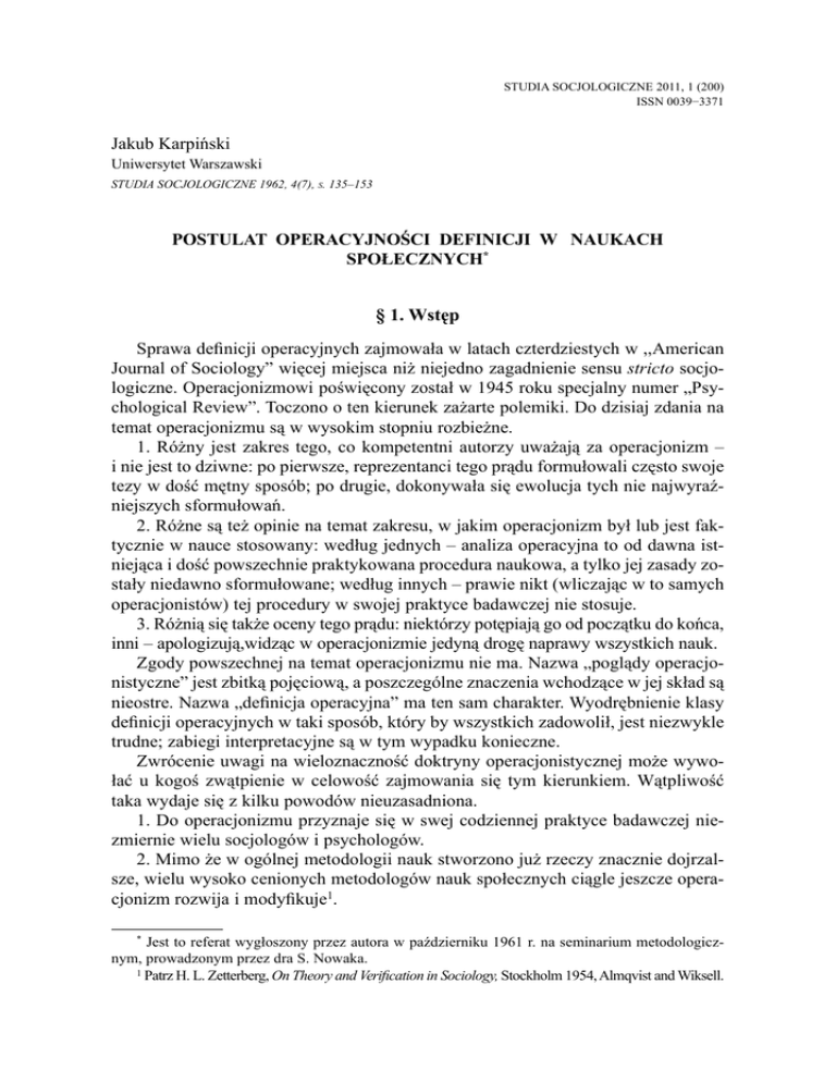 STUDIA SOCJOLOGICZNE 2011, 1 (200) ISSN 0039−3371 Jakub Karpiński Uniwersytet Warszawski STUDIA SOCJOLOGICZNE 1962, 4(7), S. 135–153 POSTULAT OPERACYJNOŚCI DEFINICJI W NAUKACH SPOŁECZNYCH* § 1. Wstęp Sprawa definicji operacyjnych zajmowała w latach czterdziestych w ,,American Journal of Sociology” więcej miejsca niż niejedno zagadnienie sensu stricto socjologiczne. Operacjonizmowi poświęcony został w 1945 roku specjalny numer „Psychological Review”. Toczono o ten kierunek zażarte polemiki. Do dzisiaj zdania na temat operacjonizmu są w wysokim stopniu rozbieżne. 1. Różny jest zakres tego, co kompetentni autorzy uważają za operacjonizm – i nie jest to dziwne: po pierwsze, reprezentanci tego prądu formułowali często swoje tezy w dość mętny sposób; po drugie, dokonywała się ewolucja tych nie najwyraźniejszych sformułowań. 2. Różne są też opinie na temat zakresu, w jakim operacjonizm był lub jest faktycznie w nauce stosowany: według jednych – analiza operacyjna to od dawna istniejąca i dość powszechnie praktykowana procedura naukowa, a tylko jej zasady zostały niedawno sformułowane; według innych – prawie nikt (wliczając w to samych operacjonistów) tej procedury w swojej praktyce badawczej nie stosuje. 3. Różnią się także oceny tego prądu: niektórzy potępiają go od początku do końca, inni – apologizują,widząc w operacjonizmie jedyną drogę naprawy wszystkich nauk. Zgody powszechnej na temat operacjonizmu nie ma. Nazwa „poglądy operacjonistyczne” jest zbitką pojęciową, a poszczególne znaczenia wchodzące w jej skład są nieostre. Nazwa „definicja operacyjna” ma ten sam charakter. Wyodrębnienie klasy definicji operacyjnych w taki sposób, który by wszystkich zadowolił, jest niezwykle trudne; zabiegi interpretacyjne są w tym wypadku konieczne. Zwrócenie uwagi na wieloznaczność doktryny operacjonistycznej może wywołać u kogoś zwątpienie w celowość zajmowania się tym kierunkiem. Wątpliwość taka wydaje się z kilku powodów nieuzasadniona. 1. Do operacjonizmu przyznaje się w swej codziennej praktyce badawczej niezmiernie wielu socjologów i psychologów. 2. Mimo że w ogólnej metodologii nauk stworzono już rzeczy znacznie dojrzalsze, wielu wysoko cenionych metodologów nauk społecznych ciągle jeszcze operacjonizm rozwija i modyfikuje1. * Jest to referat wygłoszony przez autora w październiku 1961 r. na seminarium metodologicznym, prowadzonym przez dra S. Nowaka. 1 Patrz H. L. Zetterberg, On Theory and Verification in Sociology, Stockholm 1954, Almqvist and Wiksell. 66 JAKUB KARPIŃSKI 3. Chociaż pierwotny operacjonizm niewiele spraw rozwiązał zadowalająco, to jednak zasługą zarówno ówczesnych operacjonistów, jak i ich krytyków było wysunięcie ogromnej ilości doniosłych zagadnień metodologicznych; dlatego też studia nad operacjonizmem są znakomitą inspiracją do rozmyślań nad sposobami doboru pojęć, wskaźników i metod w nauce, a także nad uzasadnianiem decyzji dotyczących takich doborów. Ukazanie problemów, które kryje w sobie polemika operacjonizm – antyoperacjonizm, jest naczelnym zadaniem niniejszych rozważań. Chciałbym także pokazać ciekawą, jak sądzę, ewolucję tego kierunku, z której zarówno jego zwolennicy, jak i przeciwnicy nie zawsze zdają sobie sprawę. § 2. Informacja o historii operacjonizmu Za twórcę operacjonizmu uważa się na ogół amerykańskiego fizyka Percy Bridgmana, a za datę powstania tego prądu – rok 1927, w którym ukazała się jego książka Logika fizyki nowoczesnej2. Poglądy podobne do bridgmanowskich głoszono jednak wcześniej. W roku 1878 bardzo wielostronny myśliciel amerykański Ch. S. Peirce, logik, matematyk i filozof zarazem, publikuje artykuł Jak uczynić nasze pojęcia jasnymi3. Pisze tam, że aby stwierdzić, czy dany przedmiot podpada pod dane pojęcie – należy to sprawdzić. Na jakiej drodze? Należy poddać ów przedmiot pewnej czynności i stwierdzić, jakie to dało efekty. W zależności od tego, jakie efekty stwierdziliśmy, nazywamy nasz przedmiot tak lub inaczej. Bridgman to etap następny. Książka jego inspirowana była przez burzliwy – i dla niektórych niepokojący – rozwój fizyki w owym okresie: twierdzenia teorii względności i badania nad zjawiskami mikroświata – każde na swój sposób – zakwestionowały cały szereg dotychczas niewzruszonych praw. Birdgman rozumował następująco: doświadczenie przemawia i za dotychczasowymi, i za nowymi prawami, nie odwołujmy więc ani jednych, ani drugich. By uchronić się od sprzeczności, musimy wtedy przyjąć, że jedne i drugie mówią zupełnie o czym innym. Długość czy masa w świecie atomów to wielkości zupełnie różne od długości czy masy w świecie znanym nam z codziennego doświadczenia, a w świecie słońc i planet są to również wielkości inne. Są one inne, ponieważ inne są operacje wykonywane dla pomiaru owych wielkości w różnych sferach doświadczenia i dlatego – konkluduje Bridgman – „pojęcie jest równoznaczne z odpowiednim zbiorem operacji”. Mówiąc „pojęcie” ma, oczywiście, na myśli wielkość fizykalną, a „operacje” – to operacje pomiaru tej wielkości. Pogląd operacjonistyczny został więc przez autora Logiki sformułowany w pewnym konkretnym celu – dla pogodzenia dawnej i nowej fizyki4. 2 P. W. Bridgman, The Logic of Modern Physics, New York 1948 The Mac-millan Company. Ch. S. Peirce, How tu Make our Ideas Clear, przedrukowane w Philosophical Writings of Peirce, selected and edited with an Introduction by J. Buchler, New York 1955 Dover Publications Inc., s. 23–41. 4 Ewolucję poglądów Bridgmana analizuje E. Poznański w artykule Operacjonalizm po trzydziestu latach, Fragmenty filozoficzne. Seria druga, Warszawa 1959 PWN. 3 POSTULAT OPERACYJNOŚCI DEFINICJI W NAUKACH SPOŁECZNYCH 67 Adaptacja operacjonizmu przez nauki zajmujące się człowiekiem jest t