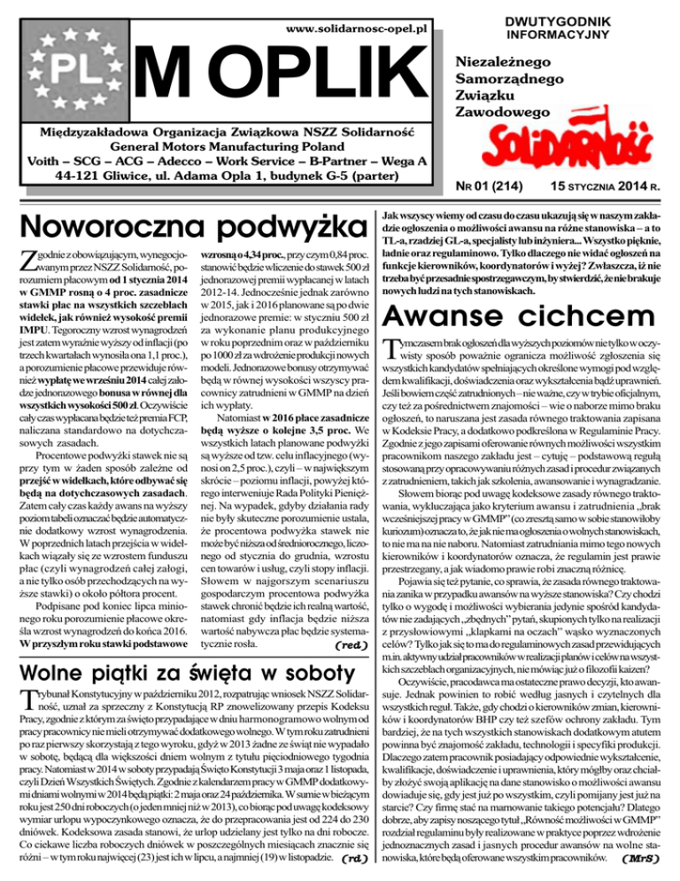 www.solidarnosc-opel.pl M OPLIK Miêdzyzak³adowa Organizacja Zwi¹zkowa NSZZ Solidarnoæ General Motors Manufacturing Poland Voith SCG ACG Adecco Work Service B-Partner Wega A 44-121 Gliwice, ul. Adama Opla 1, budynek G-5 (parter) Noworoczna podwy¿ka Z godnie z obowi¹zuj¹cym, wynegocjowanym przez NSZZ Solidarnoæ, porozumiem p³acowym od 1 stycznia 2014 w GMMP rosn¹ o 4 proc. zasadnicze stawki p³ac na wszystkich szczeblach wide³ek, jak równie¿ wysokoæ premii IMPU. Tegoroczny wzrost wynagrodzeñ jest zatem wyranie wy¿szy od inflacji (po trzech kwarta³ach wynosi³a ona 1,1 proc.), a porozumienie p³acowe przewiduje równie¿ wyp³atê we wrzeniu 2014 ca³ej za³odze jednorazowego bonusa w równej dla wszystkich wysokoci 500 z³. Oczywicie ca³y czas wyp³acana bêdzie te¿ premia FCP, naliczana standardowo na dotychczasowych zasadach. Procentowe podwy¿ki stawek nie s¹ przy tym w ¿aden sposób zale¿ne od przejæ w wide³kach, które odbywaæ siê bêd¹ na dotychczasowych zasadach. Zatem ca³y czas ka¿dy awans na wy¿szy poziom tabeli oznaczaæ bêdzie automatycznie dodatkowy wzrost wynagrodzenia. W poprzednich latach przejcia w wide³kach wi¹za³y siê ze wzrostem funduszu p³ac (czyli wynagrodzeñ ca³ej za³ogi, a nie tylko osób przechodz¹cych na wy¿sze stawki) o oko³o pó³tora procent. Podpisane pod koniec lipca minionego roku porozumienie p³acowe okrela wzrost wynagrodzeñ do koñca 2016. W przysz³ym roku stawki podstawowe wzrosn¹ o 4,34 proc., przy czym 0,84 proc. stanowiæ bêdzie wliczenie do stawek 500 z³ jednorazowej premii wyp³acanej w latach 2012-14. Jednoczenie jednak zarówno w 2015, jak i 2016 planowane s¹ po dwie jednorazowe premie: w styczniu 500 z³ za wykonanie planu produkcyjnego w roku poprzednim oraz w padzierniku po 1000 z³ za wdro¿enie produkcji nowych modeli. Jednorazowe bonusy otrzymywaæ bêd¹ w równej wysokoci wszyscy pracownicy zatrudnieni w GMMP na dzieñ ich wyp³aty. Natomiast w 2016 p³ace zasadnicze bêd¹ wy¿sze o kolejne 3,5 proc. We wszystkich latach planowane podwy¿ki s¹ wy¿sze od tzw. celu inflacyjnego (wynosi on 2,5 proc.), czyli w najwiêkszym skrócie poziomu inflacji, powy¿ej którego interweniuje Rada Polityki Pieniê¿nej. Na wypadek, gdyby dzia³ania rady nie by³y skuteczne porozumienie ustala, ¿e procentowa podwy¿ka stawek nie mo¿e byæ ni¿sza od redniorocznego, liczonego od stycznia do grudnia, wzrostu cen towarów i us³ug, czyli stopy inflacji. S³owem w najgorszym scenariuszu gospodarczym procentowa podwy¿ka stawek chroniæ bêdzie ich realn¹ wartoæ, natomiast gdy inflacja bêdzie ni¿sza wartoæ nabywcza p³ac bêdzie systematycznie ros³a. (red) Wolne pi¹tki za wiêta w soboty T rybuna³ Konstytucyjny w padzierniku 2012, rozpatruj¹c wniosek NSZZ Solidarnoæ, uzna³ za sprzeczny z Konstytucj¹ RP znowelizowany przepis Kodeksu Pracy, zgodnie z którym za wiêto przypadaj¹ce w dniu harmonogramowo wolnym od pracy pracownicy nie mieli otrzymywaæ dodatkowego wolnego. W tym roku zatrudnieni po raz pierwszy skorzystaj¹ z tego wyroku, gdy¿ w 2013 ¿adne ze wi¹t nie wypada³o w sobotê, bêd¹c¹ dla wiêkszoci dniem wolnym z tytu³u piêciodniowego tygodnia pracy. Natomiast w 2014 w soboty przypadaj¹ wiêto Konstytucji 3 maja oraz 1 listopada, czyli Dzieñ Wszystkich wiêtych. Zgodnie z kalendarzem pracy w GMMP dodatkowymi dniami wolnymi w 2014 bêd¹ pi¹tki: 2 maja oraz 24 padziernika. W sumie w bie¿¹cym roku jest 250 dni roboczych (o jeden mniej ni¿ w 2013), co bior¹c pod uwagê kodeksowy wymiar urlopu wypoczynkowego oznacza, ¿e do przepracowania jest od 224 do 230 dniówek. Kodeksowa zasada stanowi, ¿e urlop udzielany jest tylko na dni robocze. Co ciekawe liczba roboczych dniówek w poszczególnych miesi¹cach znacznie siê ró¿ni w tym roku najwiêcej (23) jest ich w lipcu, a najmniej (19) w listopadzie. (rd) DWUTYGODNIK INFORMACYJNY Niezale¿nego Samorz¹dnego Zwi¹zku Zawodowego NR 01 (214) 15 STYCZNIA 2014 R. Jak wszyscy wiemy od czasu do czasu ukazuj¹ siê w naszym zak³adzie og³oszenia o mo¿liwoci awansu na ró¿ne stanowiska a to TL-a, rzadziej GL-a, specjalisty lub in¿yniera... Wszystko piêknie, ³adnie oraz regulaminowo. Tylko dlaczego nie widaæ og³oszeñ na funkcje kierowników, koordynatorów i wy¿ej? Zw³aszcza, i¿ nie trzeba byæ przesadnie spostrzegawczym, by stwierdziæ, ¿e nie brakuje nowych ludzi na tych stanowiskach. Awanse cichcem T ymczasem brak og³oszeñ dla wy¿szych poziomów nie tylko w oczywisty sposób powa¿nie ogranicza mo¿liwoæ zg³oszenia siê wszystkich kandydatów spe³niaj¹cych okrelone wymogi pod wzglêdem kwalifikacji, dowiadczenia oraz wykszta³cenia b¹d uprawnieñ. Jeli bowiem czêæ zatrudnionych nie wa¿ne, czy w trybie oficjalnym, czy te¿ za porednictwem znajomoci wie o naborze mimo braku og³oszeñ, to naruszana jest zasada równego traktowania zapisana w Kodeksie Pracy, a dodatkowo podkrelona w Regulaminie Pracy. Zgodnie z jego zapisami oferowanie równych mo¿liwoci wszystkim pracownikom naszego zak³adu jest cytujê podstawow¹ regu³¹ stosowan¹ przy opracowywaniu ró¿nych zasad i procedur zwi¹zanych z zatrudnieniem, takich jak szkolenia, awansowanie i wynagradzanie. S³owem bior¹c pod uwagê kodeksowe zasady równego traktowania, wykluczaj¹ca jako kryterium awansu i zatrudnienia brak wczeniejszej pracy w GMMP (co zreszt¹ samo w sobie stanowi³oby kuriozum) oznacza to, ¿e jak nie ma og³oszenia o wolnych stanowiskach, to nie ma na nie naboru. Natomiast zatrudniania mimo tego nowych kierowników i koordynatorów oznacza, ¿e regulamin jest prawie przestrzegany, a jak wiadomo prawie robi znaczn¹ ró¿nicê. Pojawia siê te¿ pytanie, co sprawia, ¿e zasada równego traktowania zanika w przypadku awansów na wy¿sze stanowiska? Czy chodzi tylko o wygodê i mo¿liwoci wybierania jedynie sporód kandydatów nie zadaj¹cych zbêdnych pytañ, skupionych tylko na realizacji z przys³owiowymi klapkami na oczach w¹sko wyznac