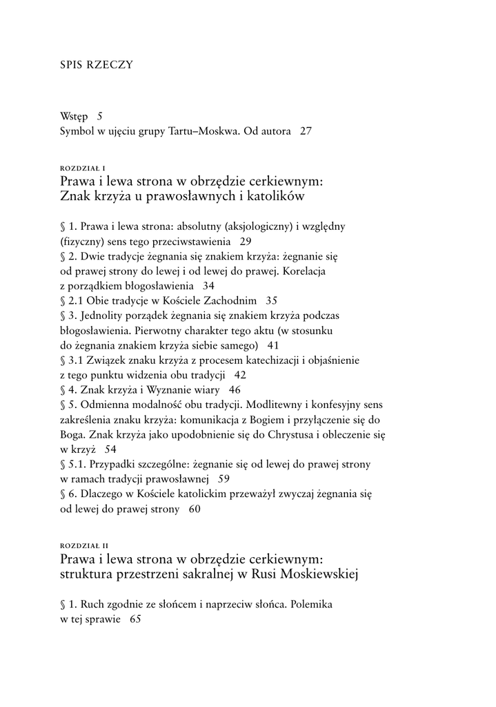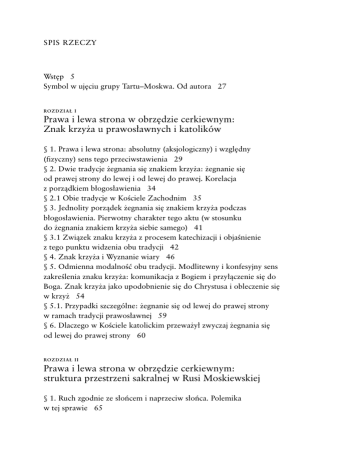SPIS RZECZY Wstęp 5 Symbol w ujęciu grupy Tartu–Moskwa. Od autora 27 R OZDZIAŁ I Prawa i lewa strona w obrzędzie cerkiewnym: Znak krzyża u prawosławnych i katolików § 1. Prawa i lewa strona: absolutny (aksjologiczny) i względny (fizyczny) sens tego przeciwstawienia 29 § 2. Dwie tradycje żegnania się znakiem krzyża: żegnanie się od prawej strony do lewej i od lewej do prawej. Korelacja z porządkiem błogosławienia 34 § 2.1 Obie tradycje w Kościele Zachodnim 35 § 3. Jednolity porządek żegnania się znakiem krzyża podczas błogosławienia. Pierwotny charakter tego aktu (w stosunku do żegnania znakiem krzyża siebie samego) 41 § 3.1 Związek znaku krzyża z procesem katechizacji i objaśnienie z tego punktu widzenia obu tradycji 42 § 4. Znak krzyża i Wyznanie wiary 46 § 5. Odmienna modalność obu tradycji. Modlitewny i konfesyjny sens zakreślenia znaku krzyża: komunikacja z Bogiem i przyłączenie się do Boga. Znak krzyża jako upodobnienie się do Chrystusa i obleczenie się w krzyż 54 § 5.1. Przypadki szczególne: żegnanie się od lewej do prawej strony w ramach tradycji prawosławnej 59 § 6. Dlaczego w Kościele katolickim przeważył zwyczaj żegnania się od lewej do prawej strony 60 R OZDZIAŁ II Prawa i lewa strona w obrzędzie cerkiewnym: struktura przestrzeni sakralnej w Rusi Moskiewskiej § 1. Ruch zgodnie ze słońcem i naprzeciw słońca. Polemika w tej sprawie 65 § 2. Związek przeciwstawienia ruchu zgodnie ze słońcem i przeciw słońcu z przeciwstawieniem strony prawej i lewej 70 § 3. Pozycja zwolenników poruszania się przeciw słońcu: orientacja obrzędu cerkiewnego na czynności w obrębie ołtarza. Jeden system orientacji 72 § 4. Pozycja zwolenników poruszania się zgodnie ze słońcem: przeciwstawienie ołtarzowej i pozaołtarzowej przestrzeni w świątyni. Dwa systemy orientacji 75 § 5. Granica pomiędzy przestrzenią ołtarza i pozostałą częścią świątyni: zmiana orientacji w trakcie liturgii 78 § 5.1. Gdzie przebiega granica pomiędzy sanktuarium i pozostałą przestrzenią świątyni? 85 § 6. Zmiana orientacji i kierunek poruszania się po kole 87 § 7. Teologia staroruska: struktura przestrzeni sakralnej i rozumienie liturgii 90 ROZDZIAŁ I II Symbolika solarno-lunarna w obliczu świątyni rosyjskiej § 1. Symbolika rosyjskiego kopułowego krzyża. Krzyż i półksiężyc w rosyjskiej tradycji cerkiewnej 95 § 2. Krzyż i półksiężyc w interpretacji chrześcijańskiej i pogańskiej 98 § 2.1. Słońce i krzyż 102 § 2.2 Chrystus i słońce 105 § 3. Krzyż i półksiężyc poza tradycją ruską 111 § 4. Niektóre wnioski 115 DODATKI DODATEK I Składanie palców podczas czynienia znaku krzyża w tradycji prawosławnej § 1. Reforma patriarchy Nikona i spory o składaniu palców w Rosji: dwupalcowy i trzypalcowy znak krzyża 121 § 2. Symboliczne znaczenia ułożenia palców przy dwupalcowym i trzypalcowym znaku krzyża 124 § 3. Zagadnienie szczególnego ułożenia palców podczas kapłańskiego błogosławieństwa 129 § 4. Oskarżenie staroobrzędowców o naśladowanie tradycji ormiańskiej 131 D ODATEK II Skojarzenie ołtarza i anałoja w związku z zagadnieniem chodzenia zgodnie ze słońcem § 1. Skojarzenie ołtarza i anałoja i jego odzwierciedlenie w praktyce obrzędowej: wypadki chodzenia zgodnie ze słońcem sanktuarium podczas konsekracji 136 § 2. Polemika staroobrzędowców-popowców o chodzeniu w sanktuarium podczas udzielania święceń: spory okólników i nieokólników 137 § 3. Udzielanie święceń i udzielanie ślubu. Zagadnienie oprowadzania wokół ołtarza podczas święceń biskupich 139 Przypisy 141 Literatura cytowana 280