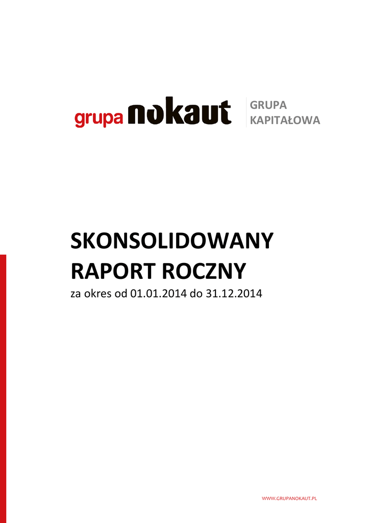 GRUPA KAPITAŁOWA SKONSOLIDOWANY RAPORT ROCZNY za okres od 01.01.2014 do 31.12.2014 WWW.GRUPANOKAUT.PL Spis treści LIST PREZESA ZARZĄDU GRUPY KAPITAŁOWEJ GRUPA NOKAUT S.A. ............................................................... 5 SKONSOLIDOWANE SPRAWOZDANIE FINANSOWE ........................................................................................ 21 2 1. WPROWADZENIE .......................................................................................................................................... 23 1.1 NAZWA, SIEDZIBA, PRZEDMIOT DZIAŁALNOŚCI JEDNOSTKI DOMINUJĄCEJ .......................................... 23 1.2. ISTOTNE WARTOŚCI OPARTE NA PROFESJONALNYM OSĄDZIE I SZACUNKACH ................................... 26 1.3. OŚWIADCZENIE O ZGODNOŚCI ORAZ PODSTAWA SPORZĄDZENIA ...................................................... 28 1.4. ISTOTNE ZASADY (POLITYKA) RACHUNKOWOŚCI ................................................................................. 30 2. SKONSOLIDOWANE SPRAWOZDANIE FINANSOWE GRUPY KAPITAŁOWEJ GRUPY NOKAUT S.A. ................. 41 2.1 SKONSOLIDOWANE SPRAWOZDANIE Z SYTUACJI FINANSOWEJ ........................................................... 41 2.2. SKONSOLIDOWANY RACHUNEK ZYSKÓW I STRAT (WARIANT PORÓWNAWCZY) ................................. 42 2.3. SKONSOLIDOWANE SPRAWOZDANIE Z CAŁKOWITYCH DOCHODÓW .................................................. 43 2.4. SKONSOLIDOWANE SPRAWOZDANIE ZE ZMIAN W KAPITALE WŁASNYM ............................................ 43 2.5. SKONSOLIDOWANE SPRAWOZDANIE Z PRZEPŁYWÓW PIENIĘŻNYCH .................................................. 45 3. INFORMACJE DODATKOWE DO SKONSOLIDOWANEGO SPRAWOZDANIA FINANSOWEGO ......................... 46 Wszystkie poniższe noty są zaprezentowane w oparciu o kontynuację działalności. .................................. 46 NOTA 1. SEGMENTY OPERACYJNE ............................................................................................................... 46 NOTA 2. WARTOŚCI NIEMATERIALNE .......................................................................................................... 48 NOTA 3. INWESTYCJE W JEDNOSTKI STOWARZYSZONE .............................................................................. 51 NOTA 4. RZECZOWE AKTYWA TRWAŁE ...................................................................................................... 52 NOTA 5. POŻYCZKI DŁUGOTERMINOWE ..................................................................................................... 53 NOTA 6. AKTYWA Z TYTUŁU ODROCZONEGO PODATKU DOCHODOWEGO ................................................ 54 NOTA 7. NALEŻNOŚCI KRÓTKOTERMINOWE ............................................................................................... 55 NOTA 8. ŚRODKI PIENIĘŻNE ......................................................................................................................... 56 NOTA 9. INNE AKTYWA ................................................................................................................................ 56 NOTA 10.AKTYWA TRWAŁE PRZEZNACZONE DO SPRZEDAŻY ORAZ DZIAŁALNOŚĆ ZANIECHANA .............. 57 NOTA 11. KAPITAŁ PODSTAWOWY JEDNOSTKI DOMINUJĄCEJ ................................................................... 57 NOTA 12. KAPITAŁ ZAPASOWY .................................................................................................................... 59 NOTA 13. KAPITAŁ REZERWOWY ................................................................................................................. 59 NOTA 14. UDZIAŁY NIEKONTROLUJĄCE ....................................................................................................... 59 NOTA 15. REZERWA Z TYTUŁU ODROCZONEGO PODATKU DOCHODOWEGO ............................................ 60 NOTA 16. ZOBOWIĄZANIA Z TYTUŁU LEASINGU ......................................................................................... 60 NOTA 17. ZOBOWIĄZANIA KRÓTKOTERMINOWE ....................................................................................... 62 NOTA 18. REZERWY NA ZOBOWIĄZANIA .................................................................................................... 62 NOTA 19. KRÓTKOTERMINOWE ROZLICZENIA MIĘDZYOKRESOWE ............................................................ 63 NOTA 20. ZYSK NA AKCJĘ, WYPŁACONE DYWIDENDY I PROPOZYCJA PODZIAŁU ZYSKU ............................. 63 NOTA 21. PRZYCHODY ................................................................................................................................. 63 NOTA 22. POZOSTAŁE PRZYCHODY I KOSZTY............................................................................................... 64 NOTA 23. PODATEK DOCHODOWY .............................................................................................................. 65 NOTA 24. SPRAWOZDANIE Z PRZEPŁYWÓW PIENIĘŻNYCH ......................................................................... 66 NOTA 25. INSTRUMENTY FINANSOWE ....................................................................................................... 67 NOTA 26. AKTYWA I ZOBOWIĄZANIA WARUNKOWE .................................................................................. 70 NOTA 27. ZARZĄDZANIE KAPITAŁEM .......................................................................................................... 71 NOTA 28. ZDARZENIA PO DNIU BILANSOWYM ........................................................................................... 71 NOTA 29. WYBRANE DANE FINANSOWE PRZELICZONE NA EUR ................................................................. 72 NOTA 30. INFORMACJE O ISTOTNYCH TRANSAKCJACH ZAWARTYCH PRZEZ JEDNOSTKĘ DOMINUJĄCĄ/JEDNOSTKĘ POWIĄZANĄ Z PODMIOTAMI POWIĄZANYMI NA WARUNKACH INNYCH NIŻ RYNKOWE, WRAZ Z ICH KWOTAMI ORAZ INFORMACJAMI OKREŚLAJĄCYMI CHARAKTER TYCH TRANSAKCJI. ...............